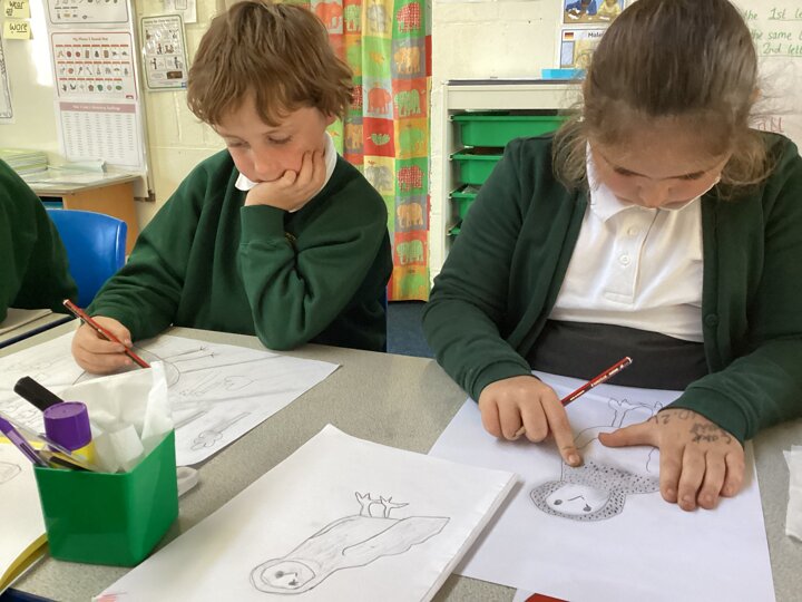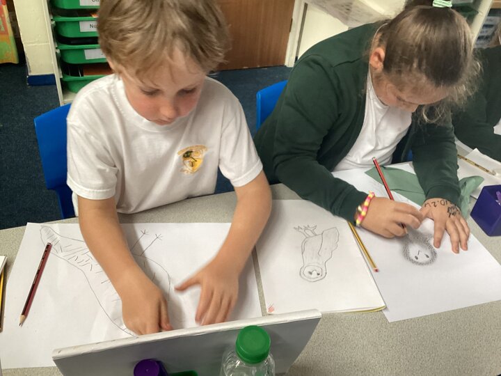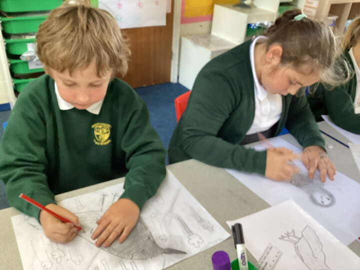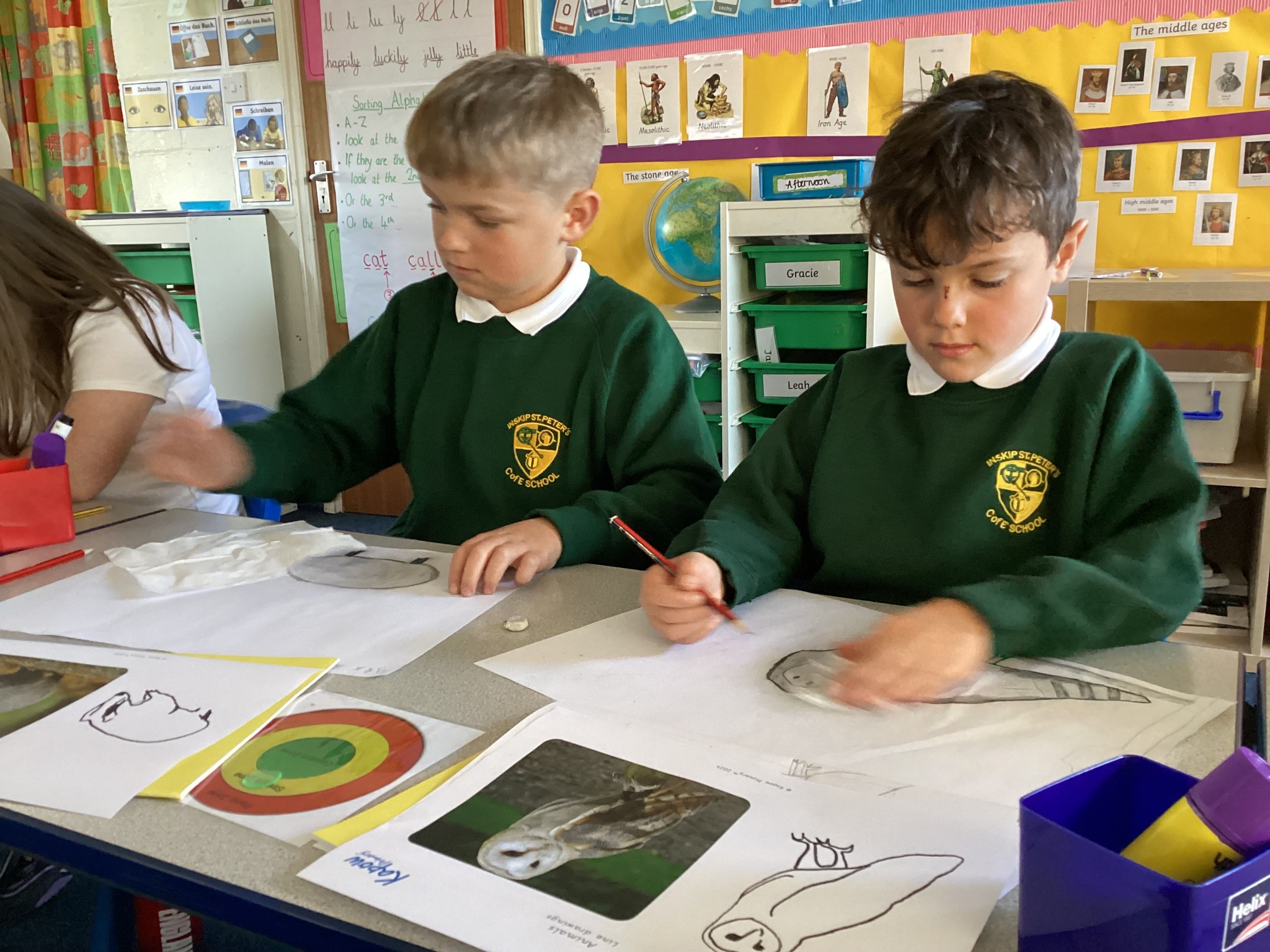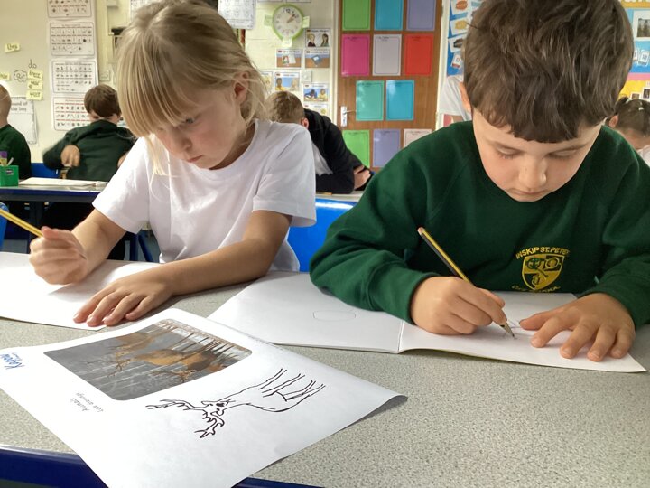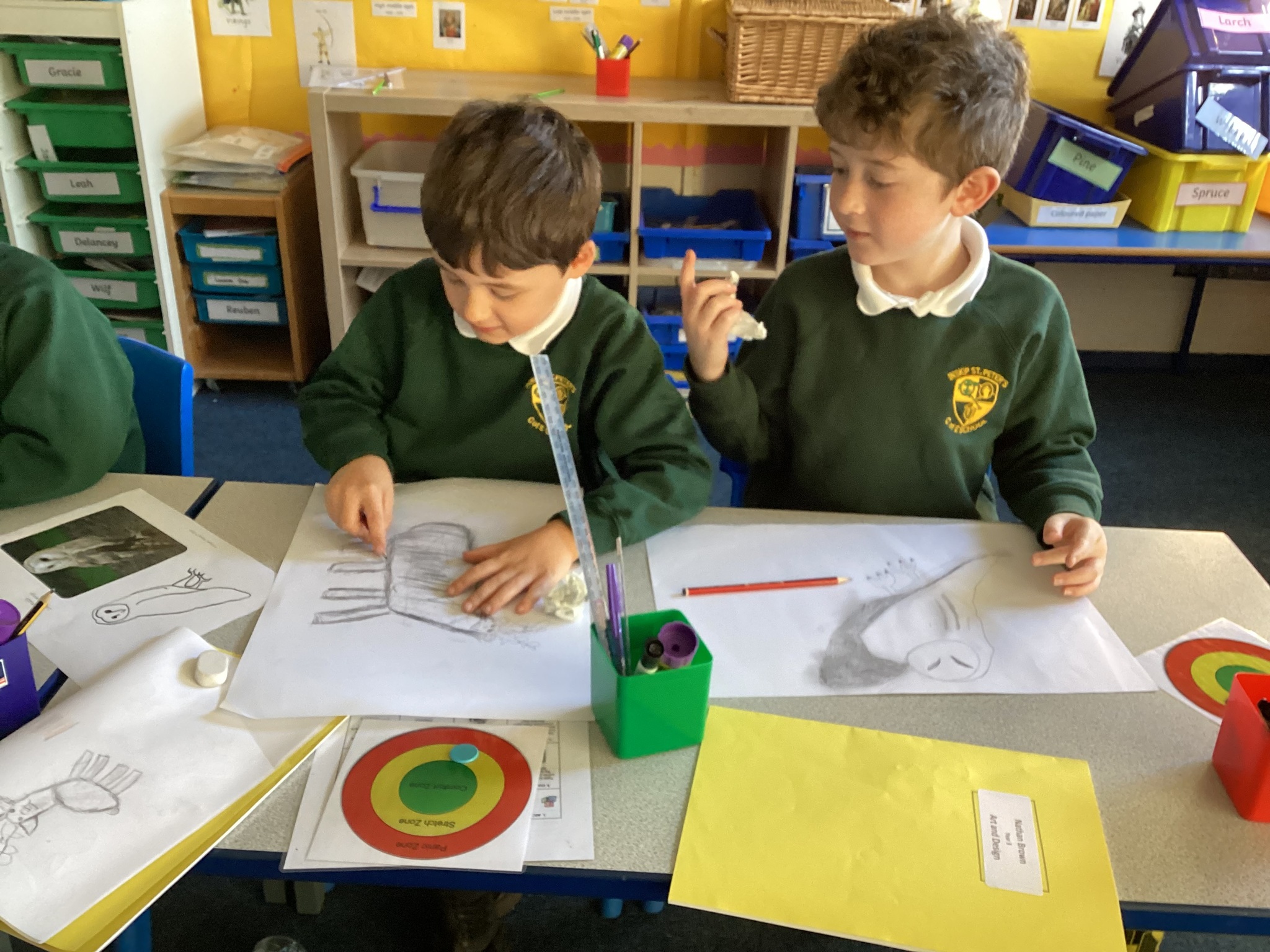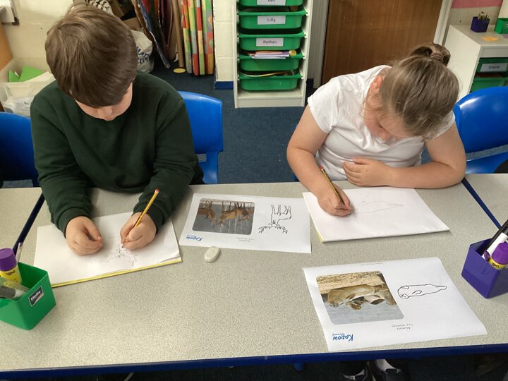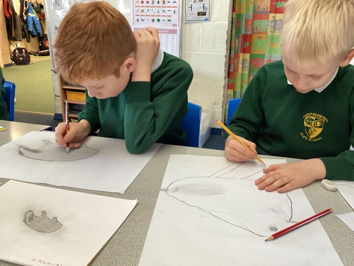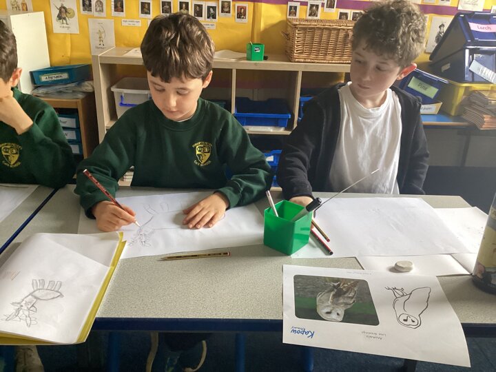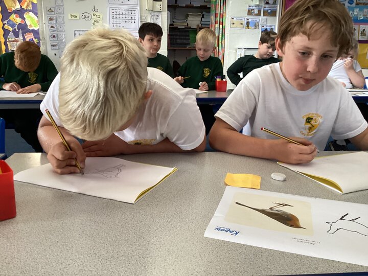 Middle School have been busy creating drawings in the style of Cave Art. After discussing how important animals were during the Stone Age times and how they featured within Cave Art, we had thought about which animals would be featured now for people to enjoy in 5000 years. Using the examples, we drew the smaller animal drawings before scaling them up to big versions.