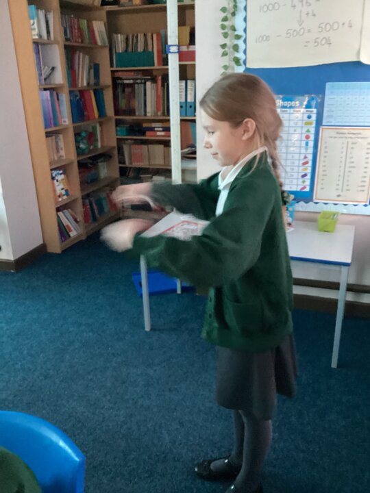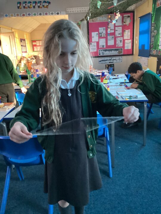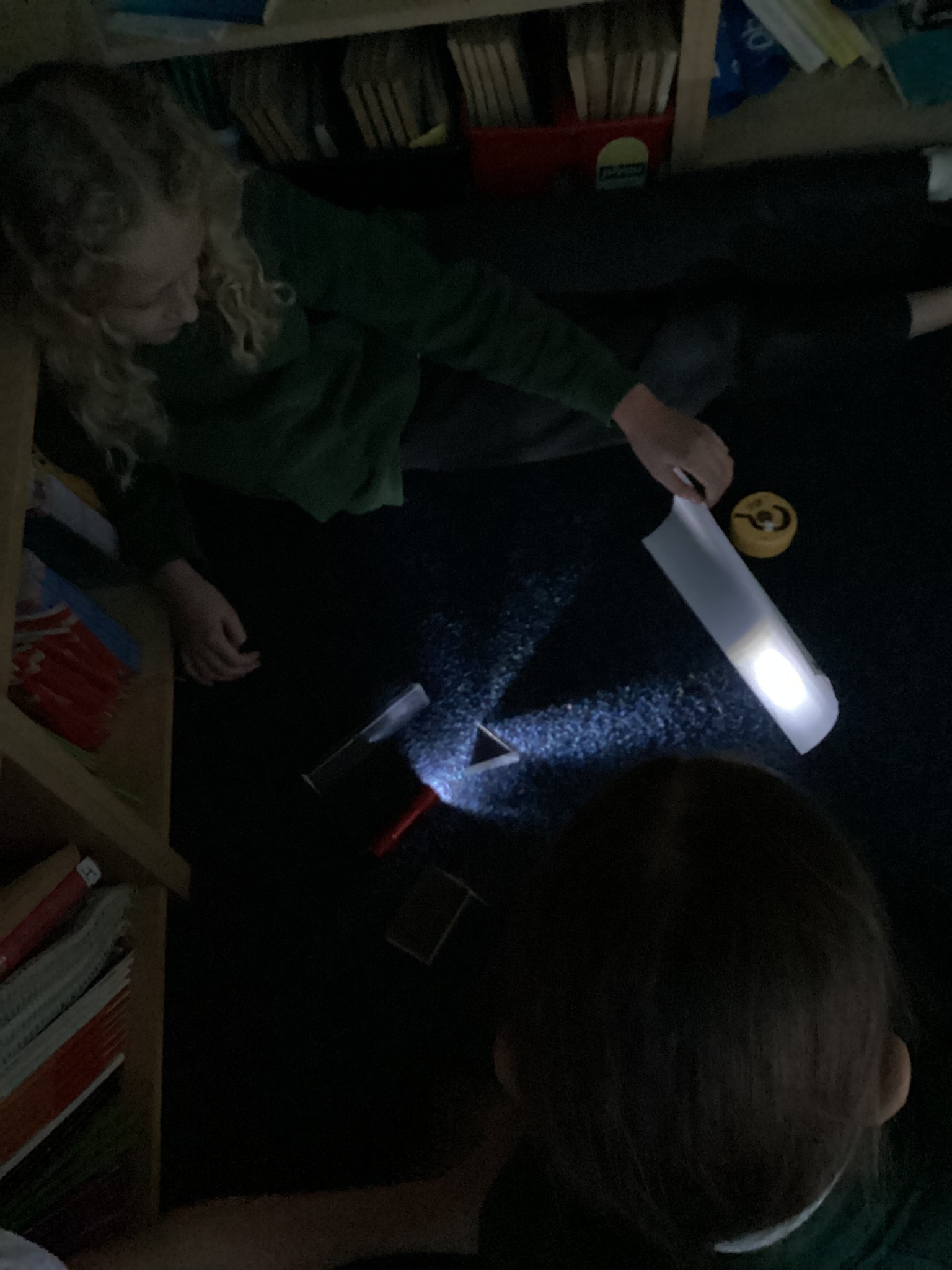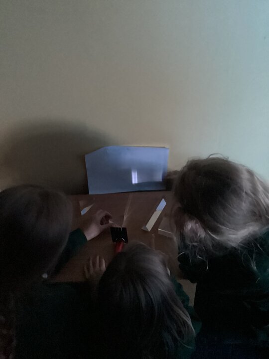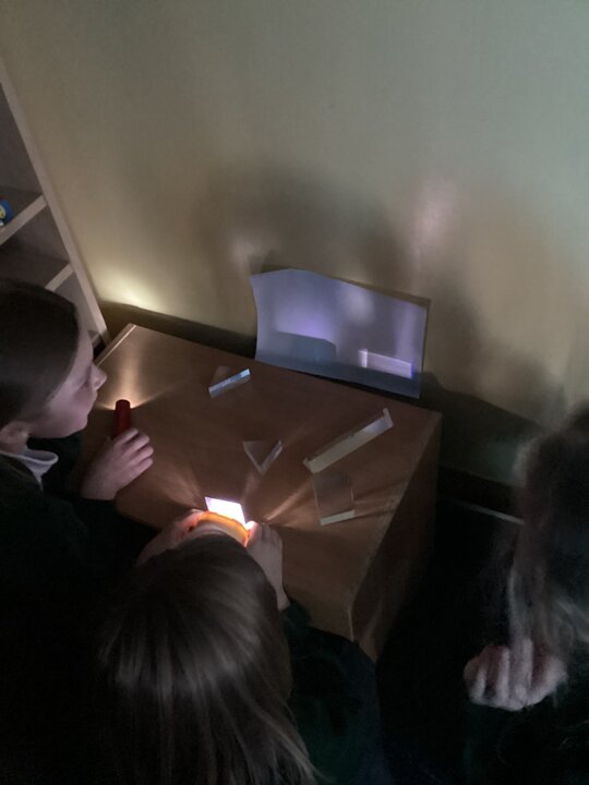 The class watched short videos of this phenomenon and tried it out themselves in a darkened room. They enjoyed experimenting with different shaped prisms to see what happened.