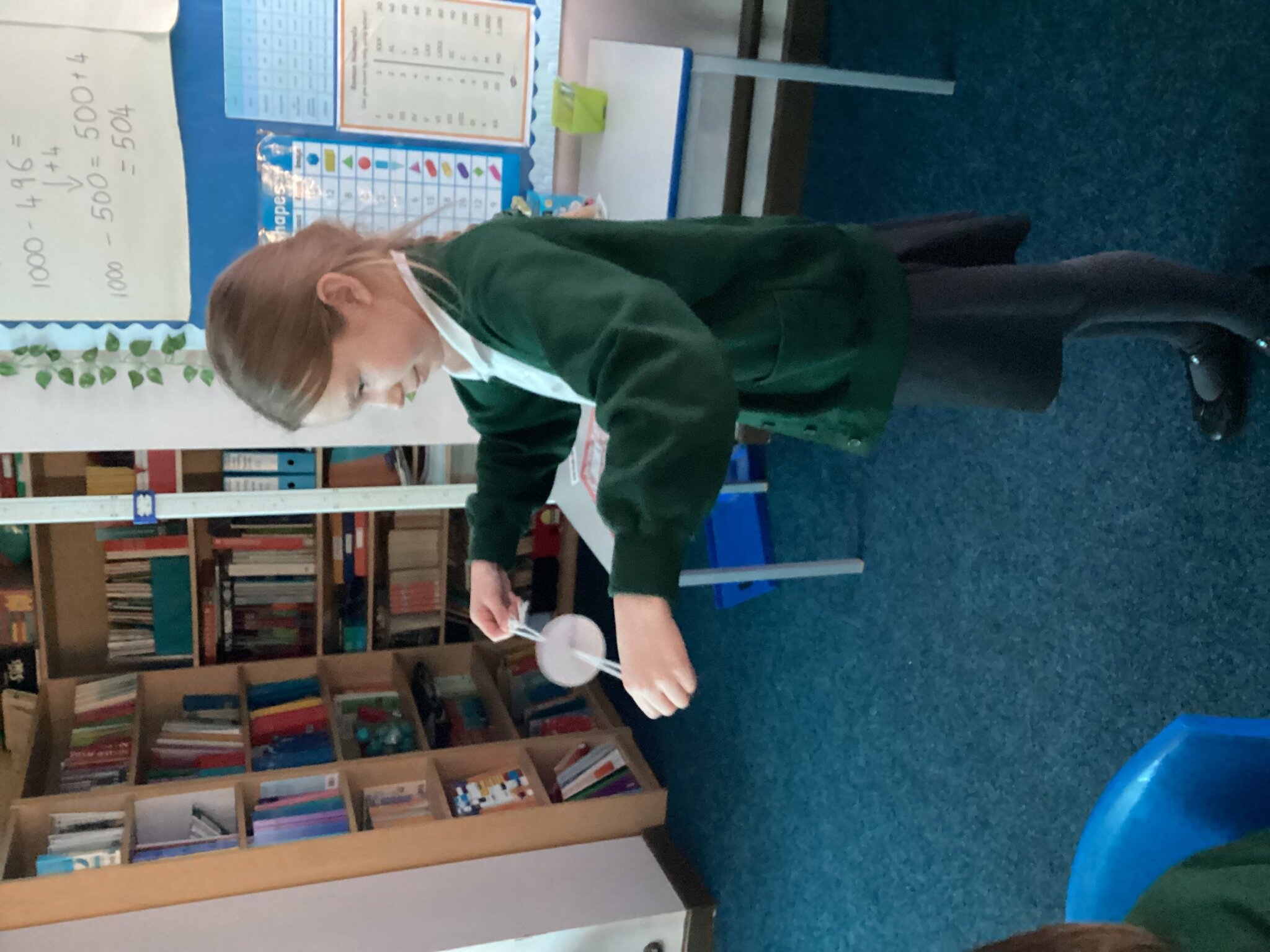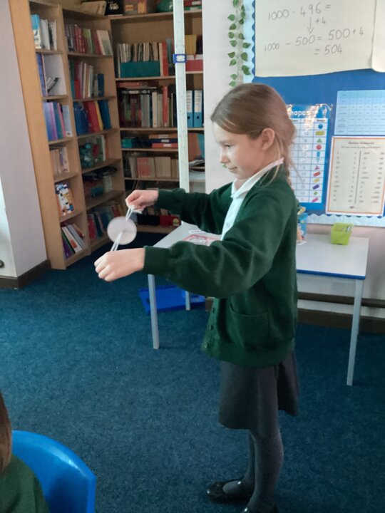 After this, we all made a colour wheel to test what happens when you spin it really fast. The children noticed straight away that the colours of the rainbow became white again! The photo above shows Freya spinning her colour wheel…can you see any colours?