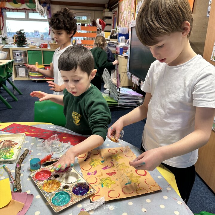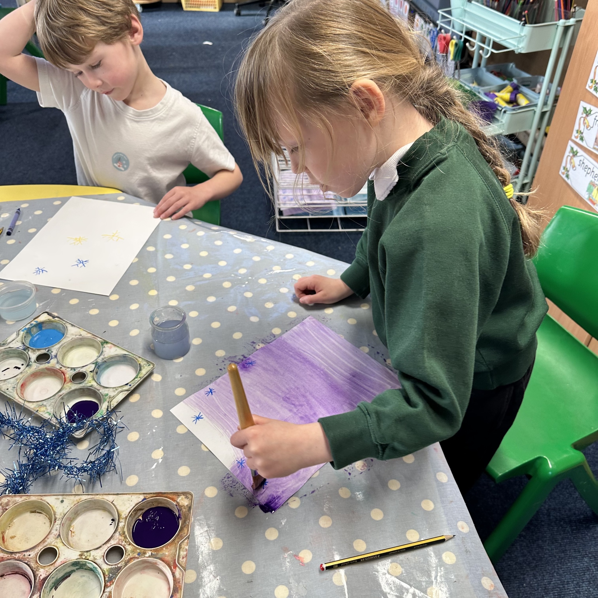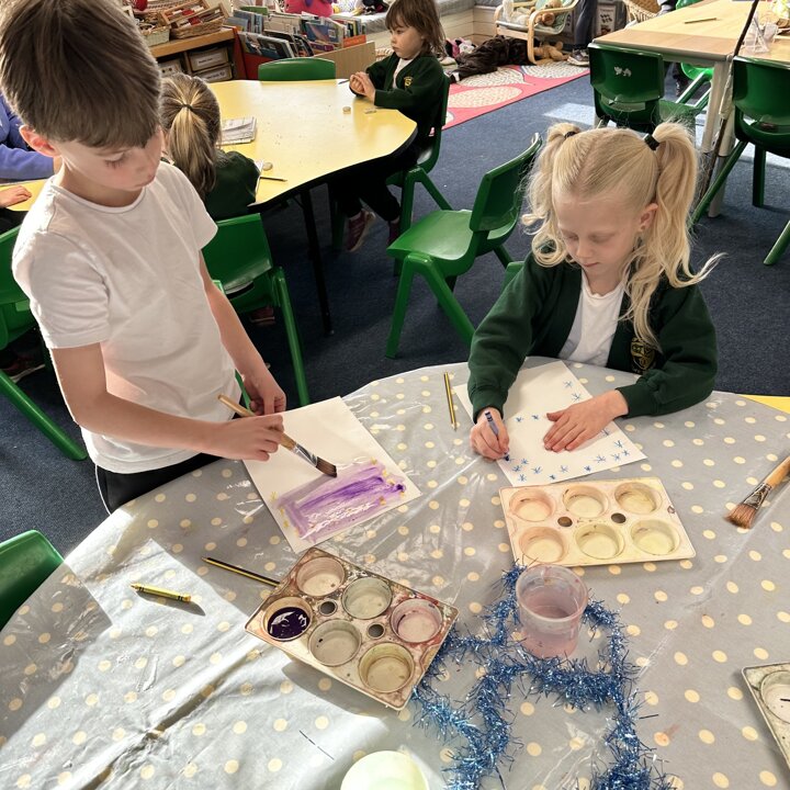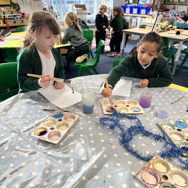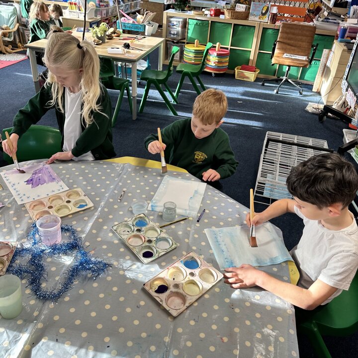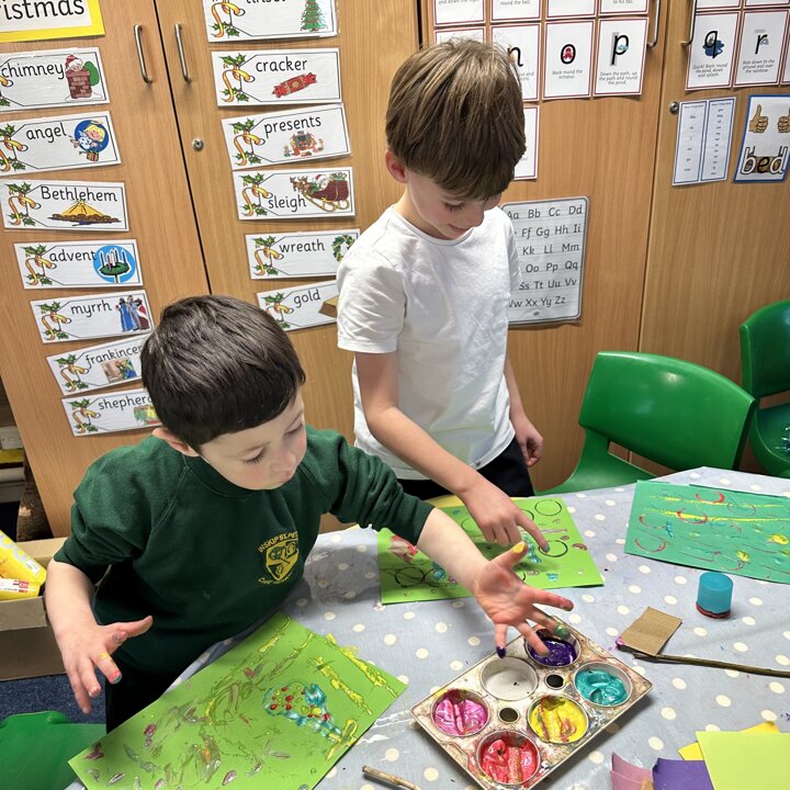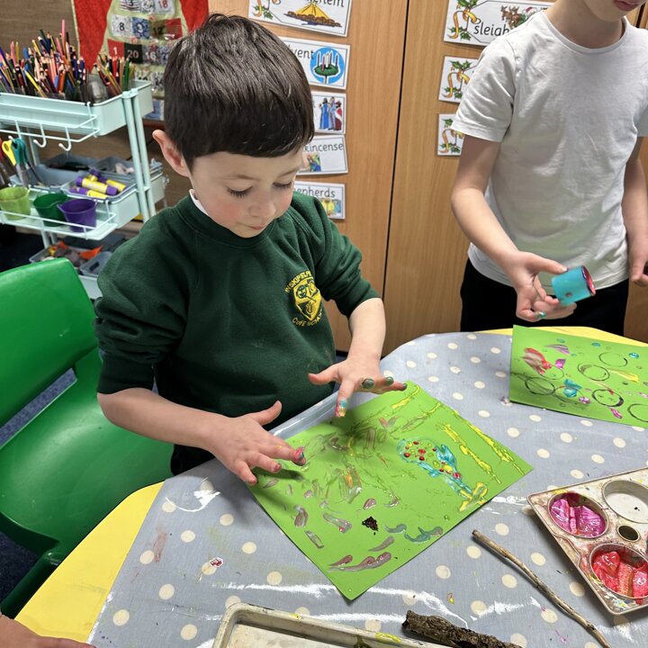 We have been learning lots of art skills by painting and printing. In preparation for making Christmas tree collages the children firstly learnt how to create a ‘wash’ using paint, painting over wax drawings of snowflakes to create a background winter scene.