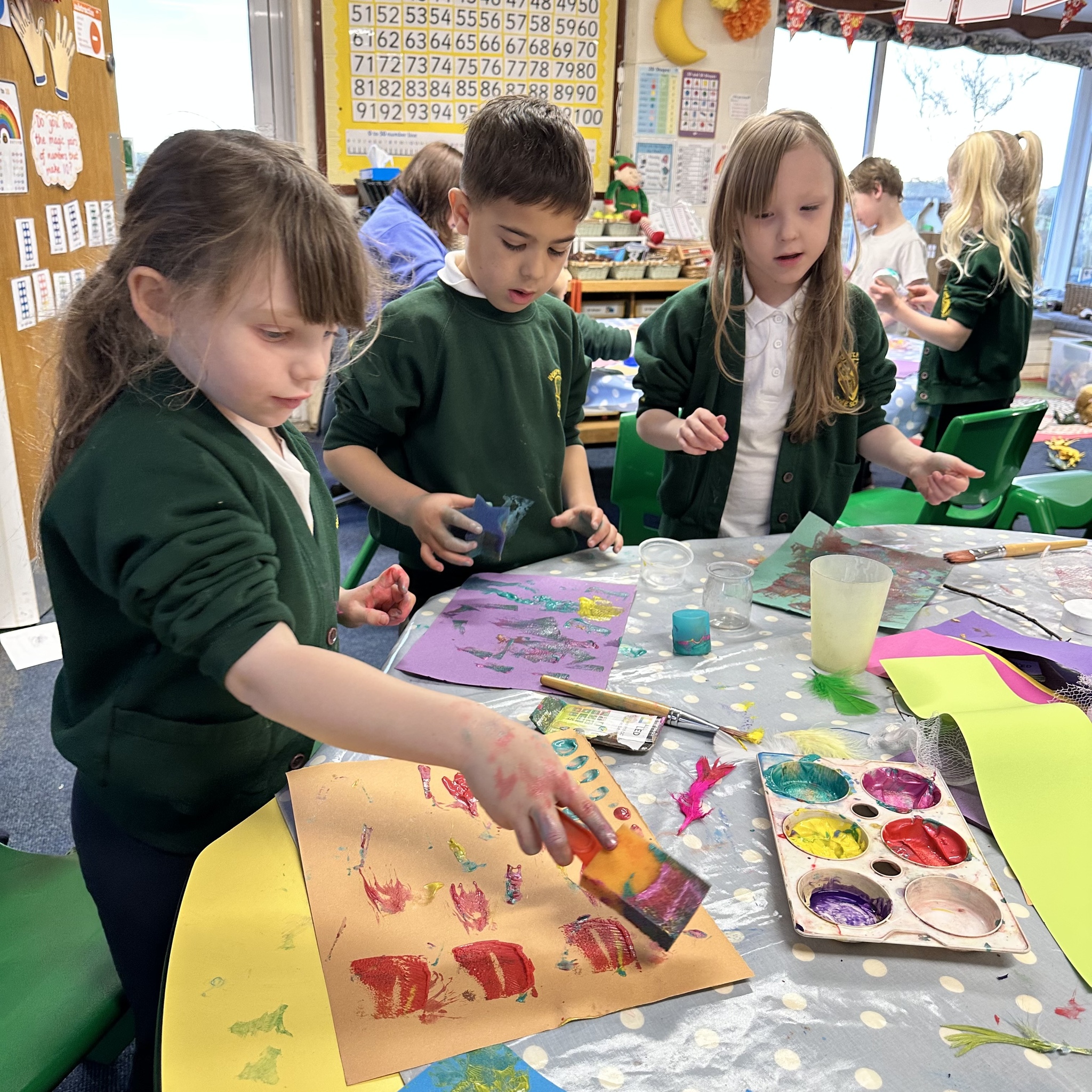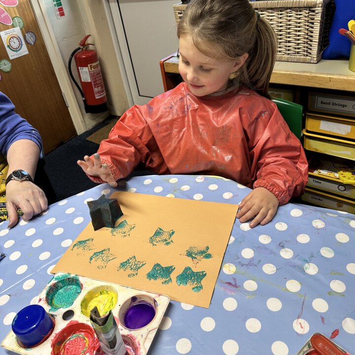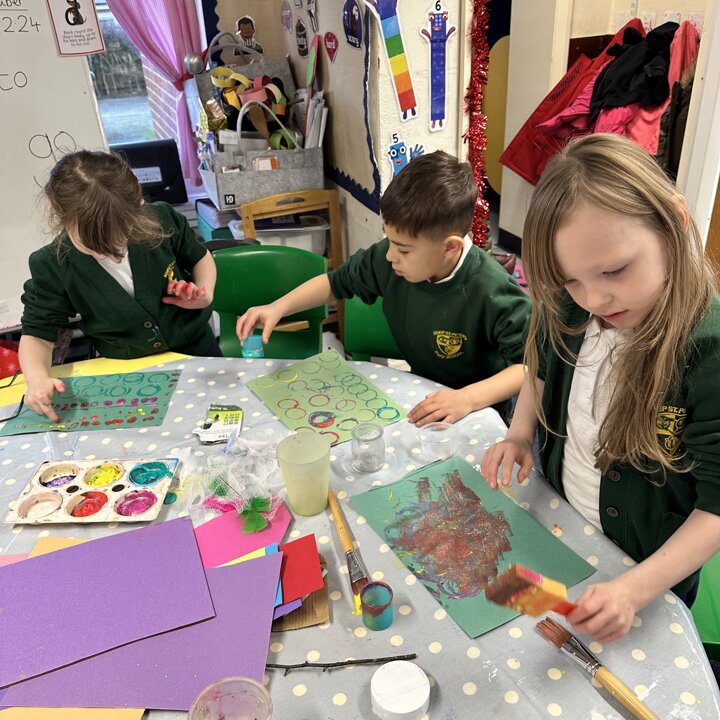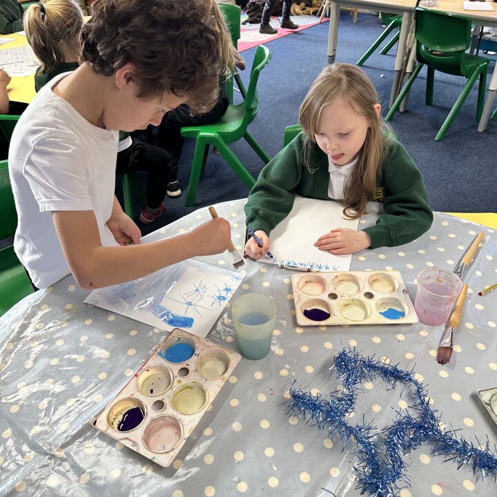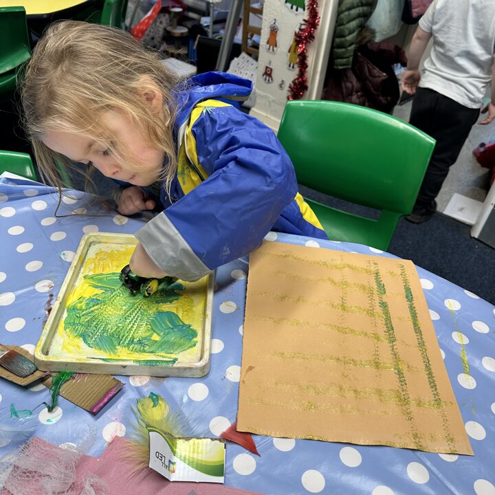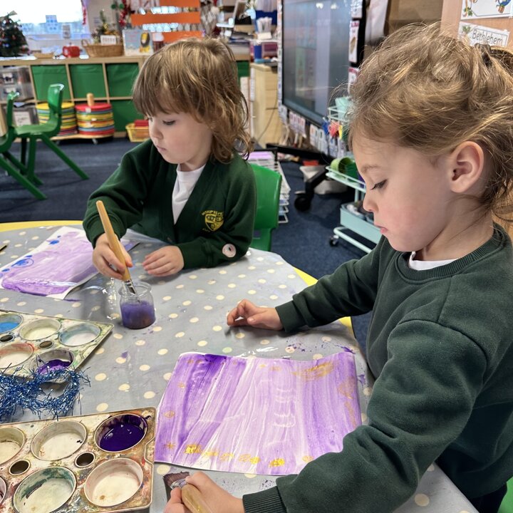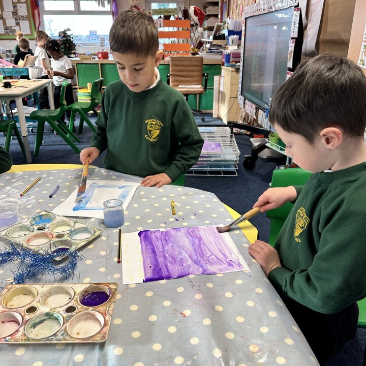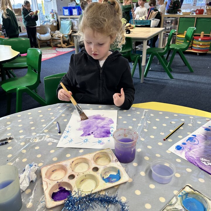 We have been learning lots of art skills by painting and printing. In preparation for making Christmas tree collages the children firstly learnt how to create a ‘wash’ using paint, painting over wax drawings of snowflakes to create a background winter scene.