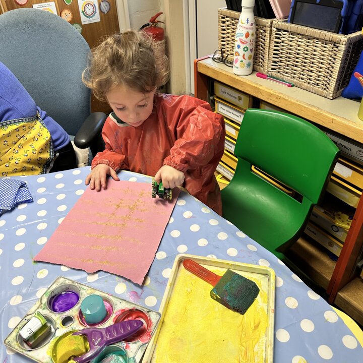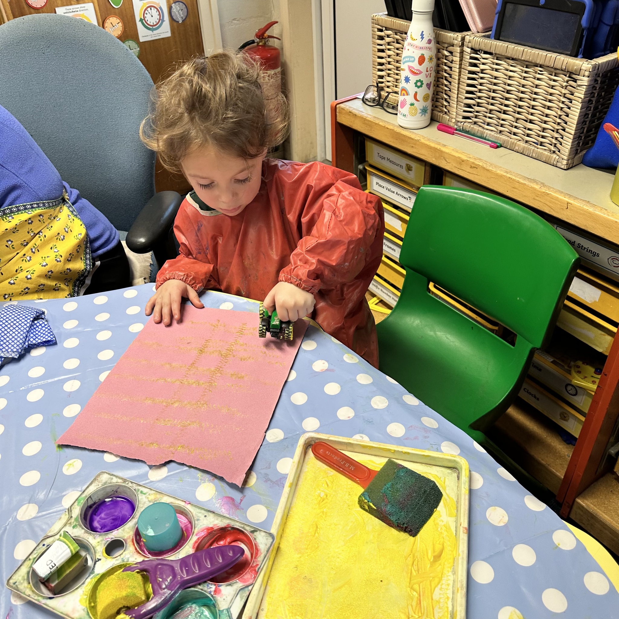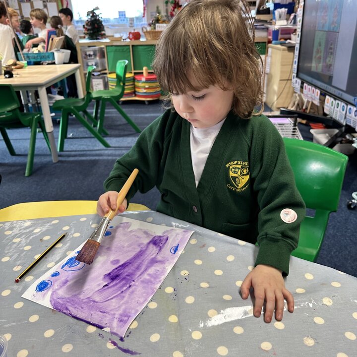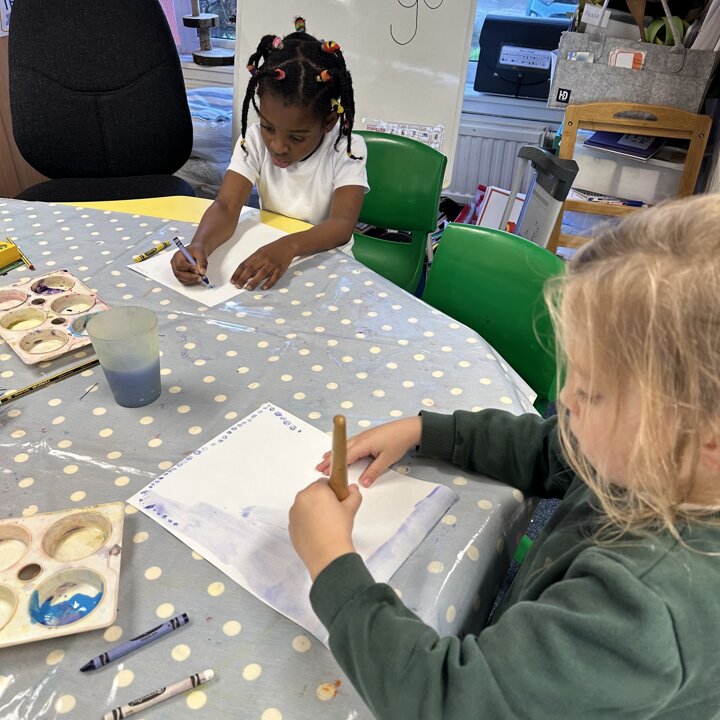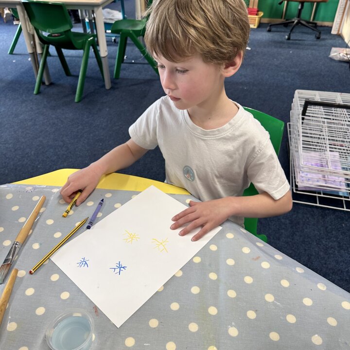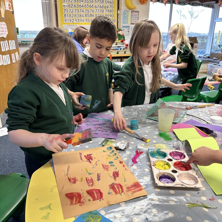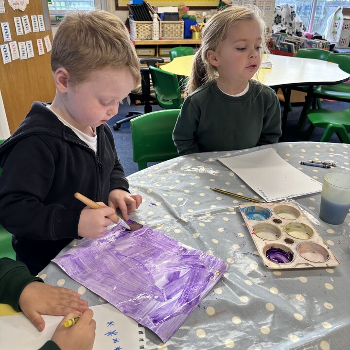 We have been learning lots of art skills by painting and printing. In preparation for making Christmas tree collages the children firstly learnt how to create a ‘wash’ using paint, painting over wax drawings of snowflakes to create a background winter scene.