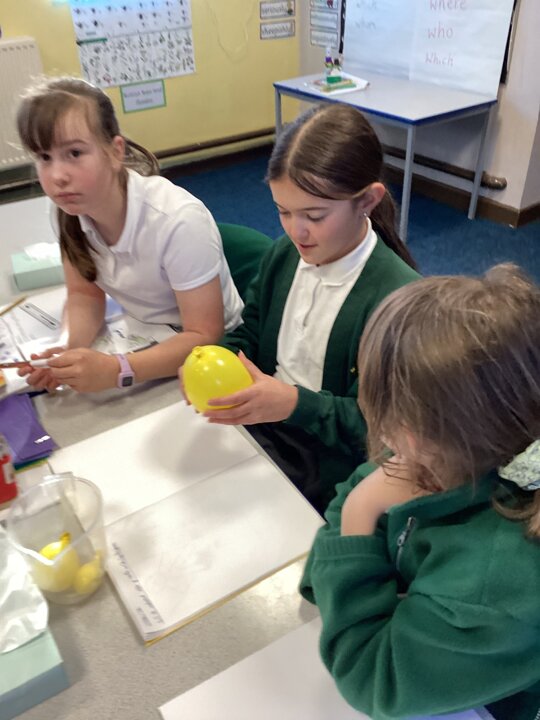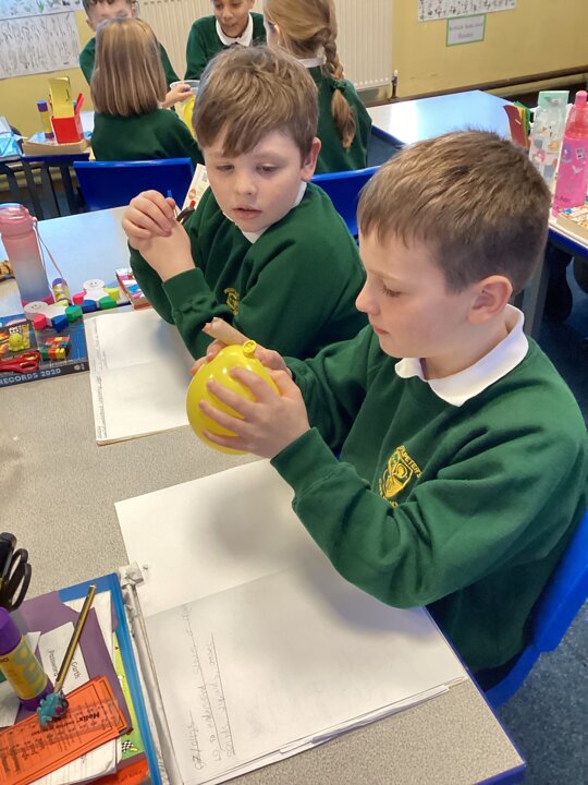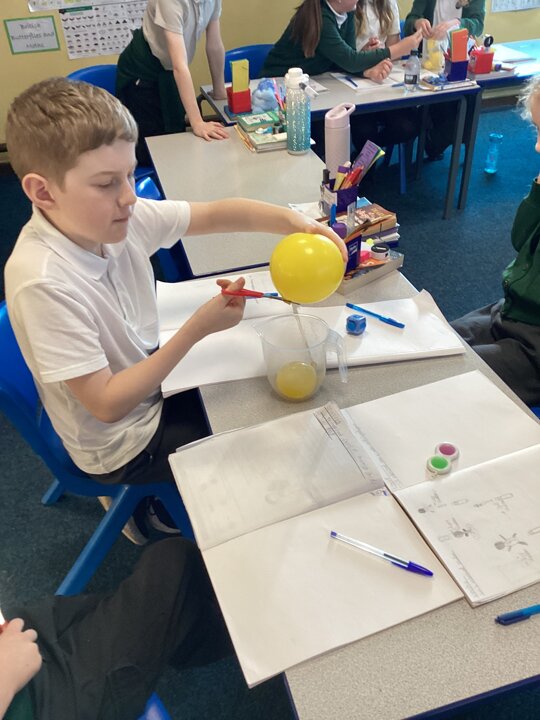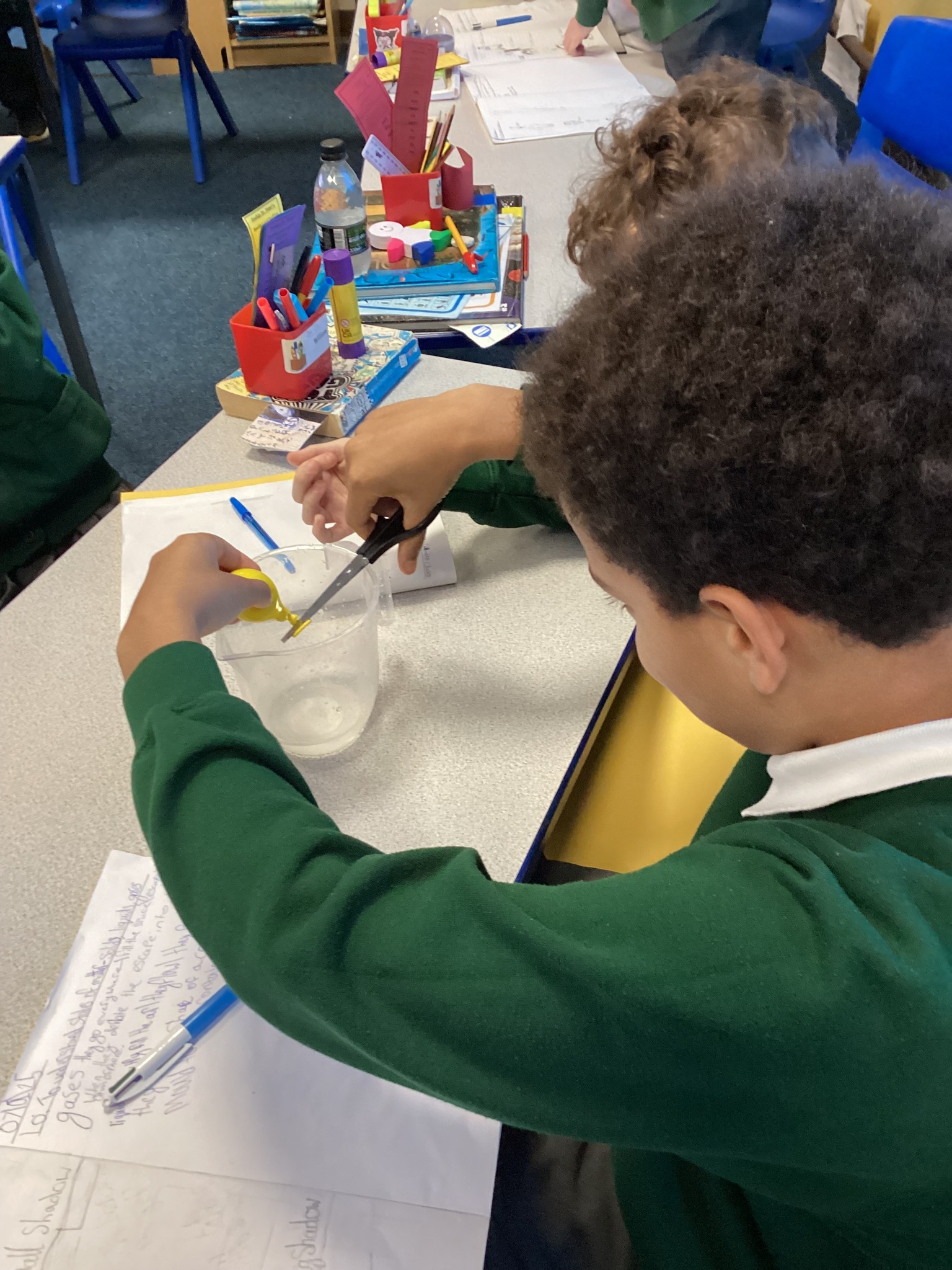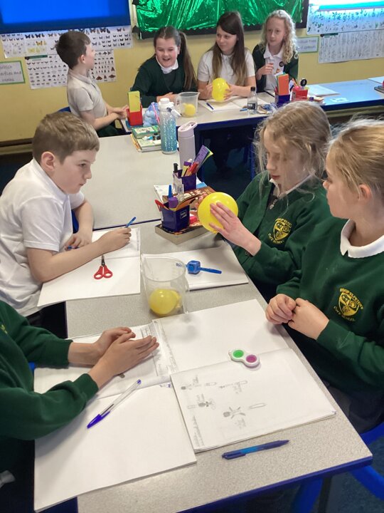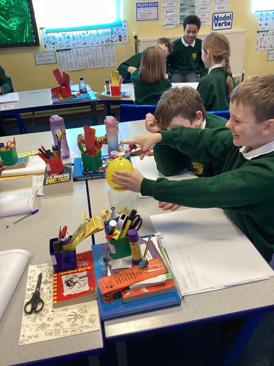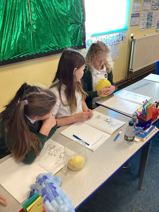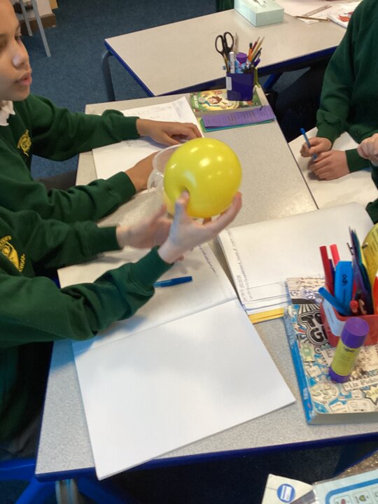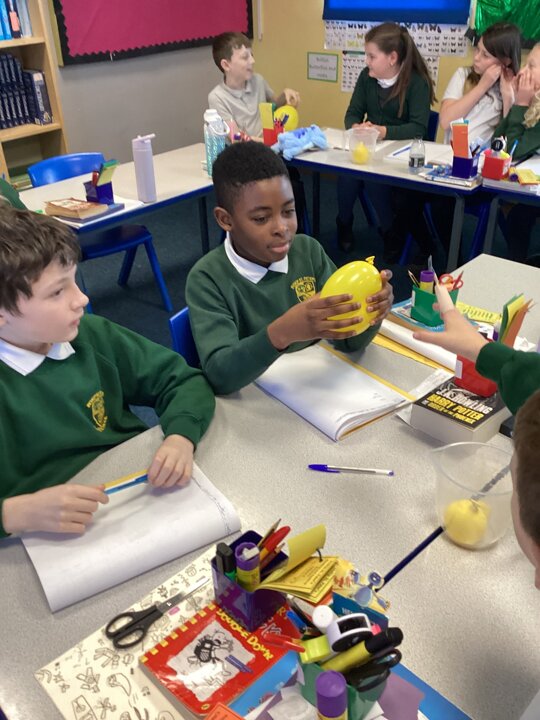 Upper School began their new topic this week which is looking at properties of materials. We began by thinking about the properties of solids, liquids and gases. To do this, the class were given three balloons. One filled with ice, one with water and one with air. We observed and felt each balloon. We came up with statements for the way that each balloon behaved such as the one with air was easy to move and change the shape of. After this, we cut the balloons open and saw what happened. We described how the air flowed out and disappeared into the room, the water poured out and filled the bottom of the container it went into, the ice didn’t move and had to be moved and pulled out of the balloon. It didn’t change shape unless we used a force on it.