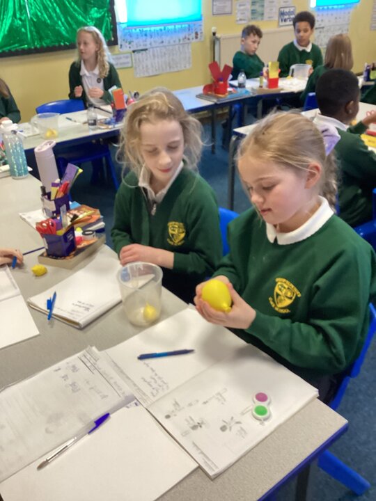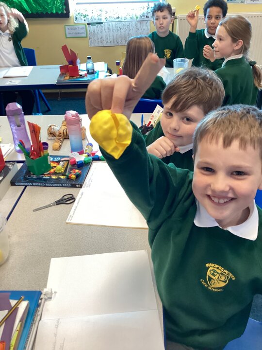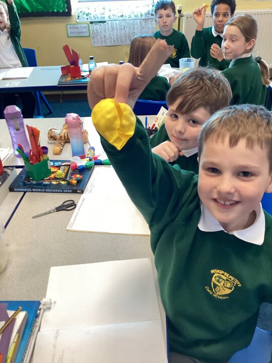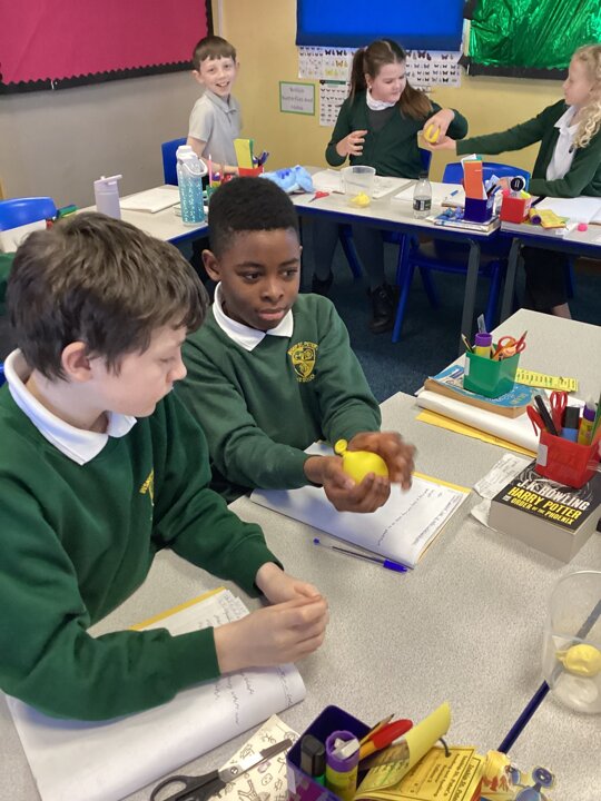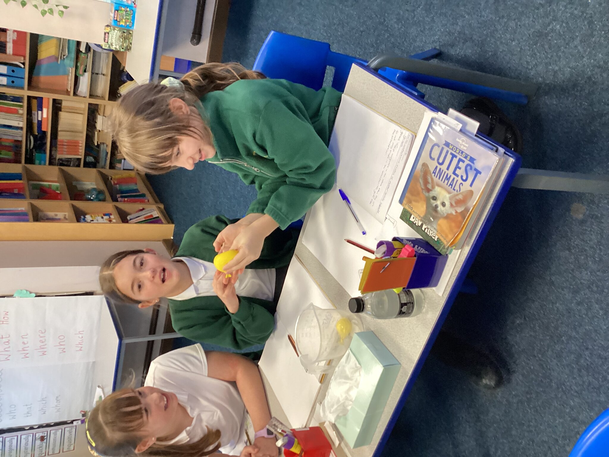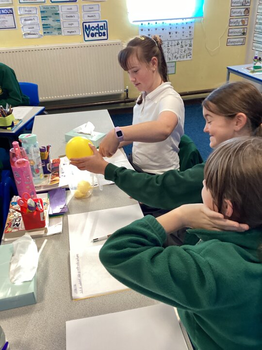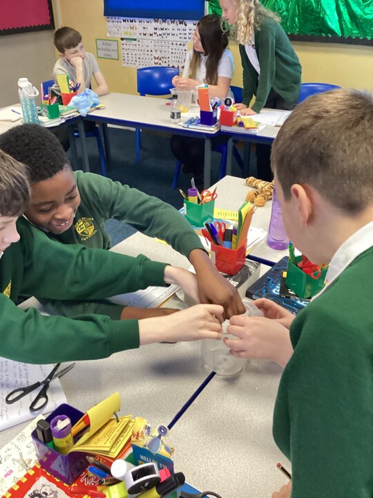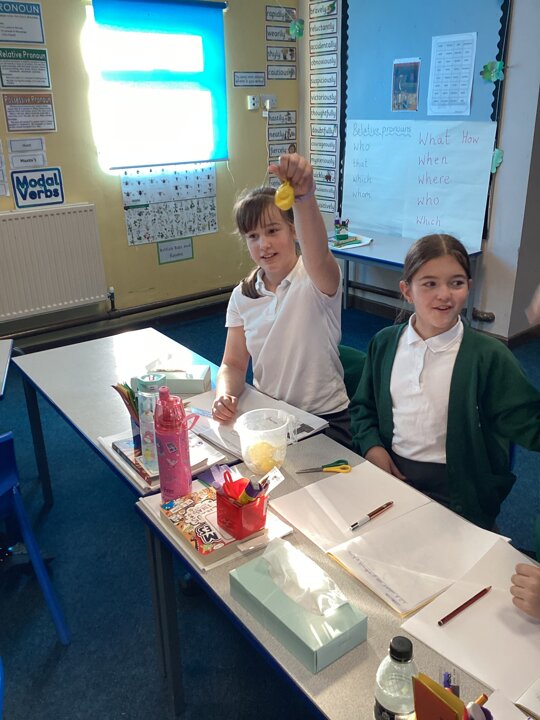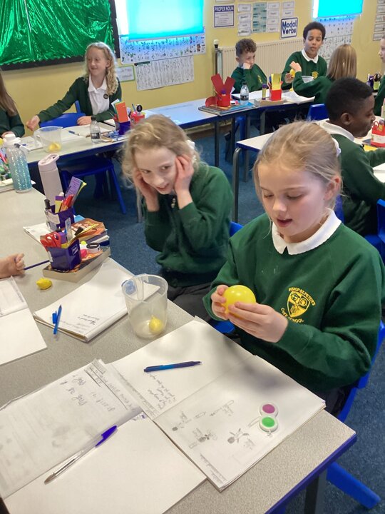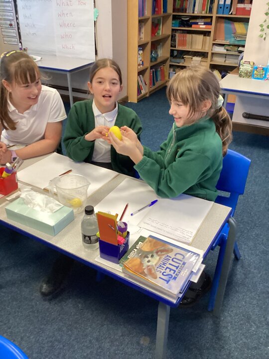 Upper School began their new topic this week which is looking at properties of materials. We began by thinking about the properties of solids, liquids and gases. To do this, the class were given three balloons. One filled with ice, one with water and one with air. We observed and felt each balloon. We came up with statements for the way that each balloon behaved such as the one with air was easy to move and change the shape of. After this, we cut the balloons open and saw what happened. We described how the air flowed out and disappeared into the room, the water poured out and filled the bottom of the container it went into, the ice didn’t move and had to be moved and pulled out of the balloon. It didn’t change shape unless we used a force on it.