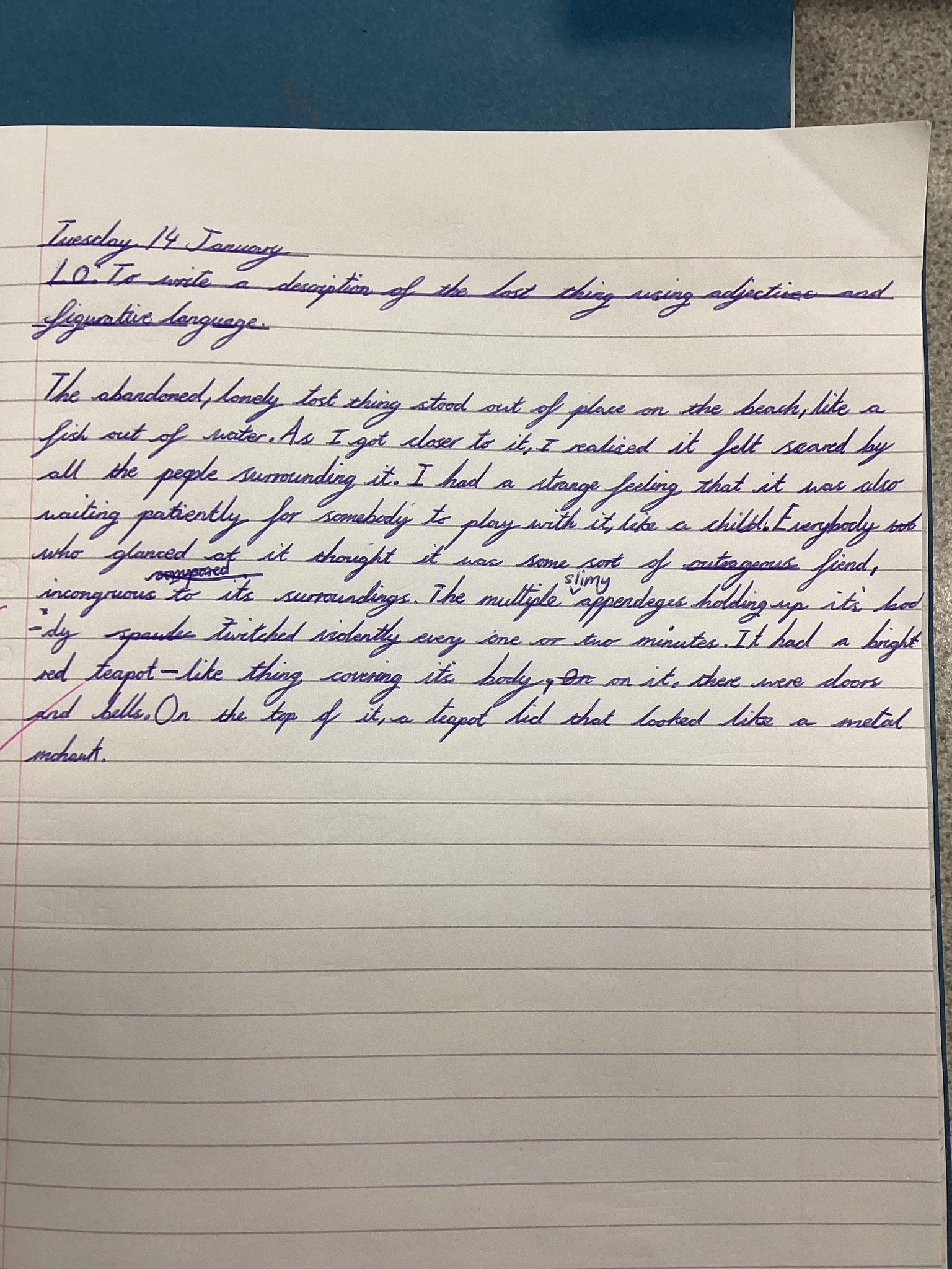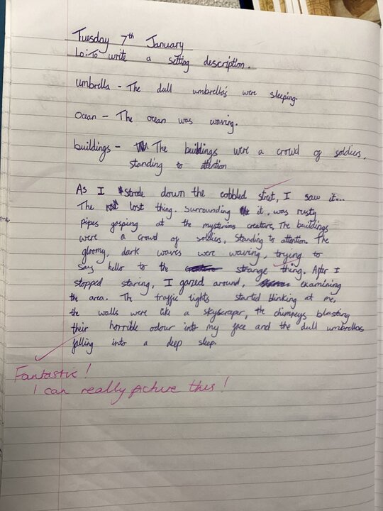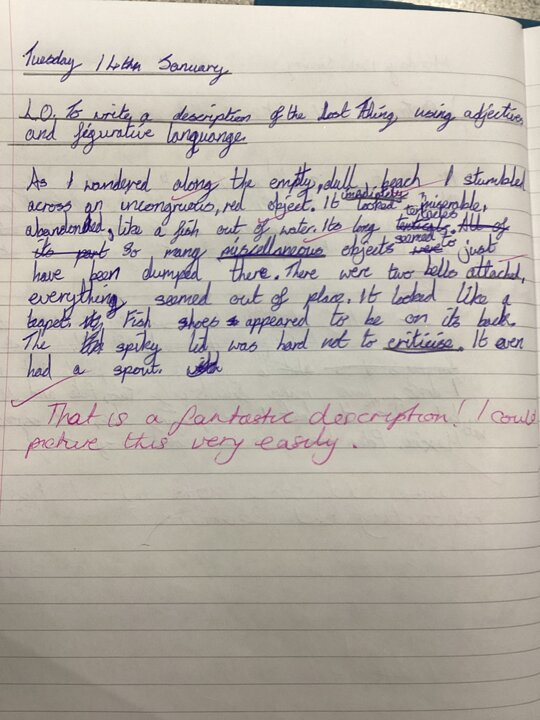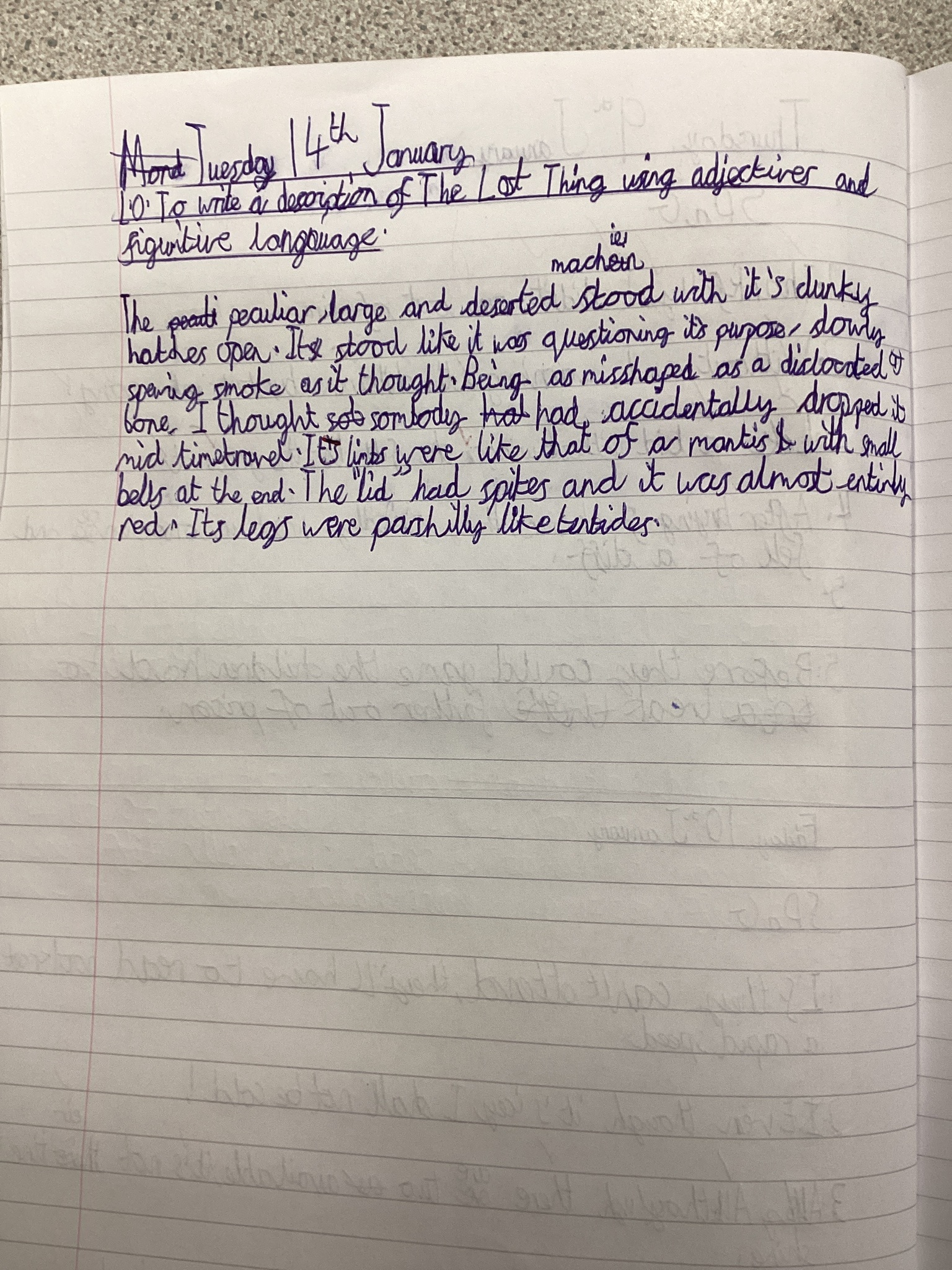 Our new book is The Lost Thing by Shaun Tan. We have come across his work before when we studied The Arrival last term. The children have been discussing the characters in this unusual picture book and, using a variety of figurative language and adventurous vocabulary, they have been writing descriptions of the narrator and ‘The Lost Thing’. Please enjoy looking through the gallery at some of the excellent writing Year 5/6 have produced…