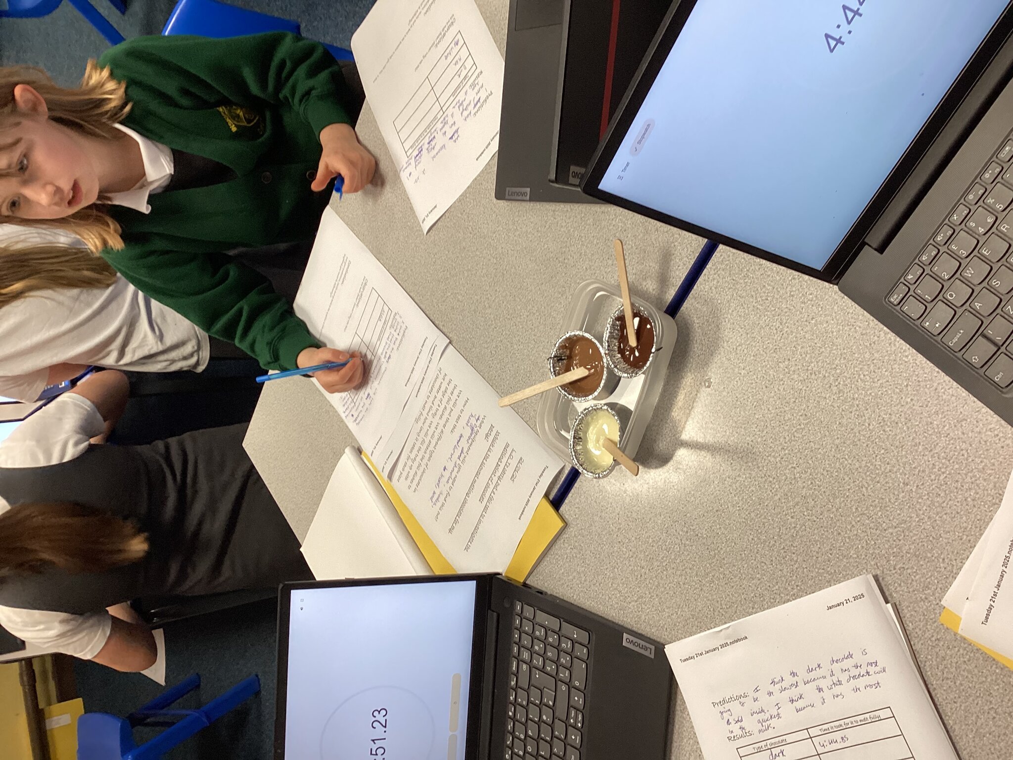 The predictions made about which they thought would be slowest at melting were varied but a lot of children thought the white chocolate would be because of the milk content in it.