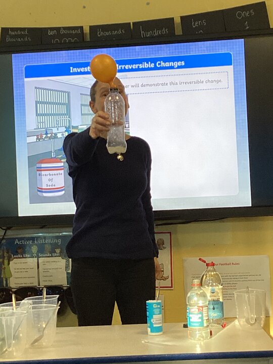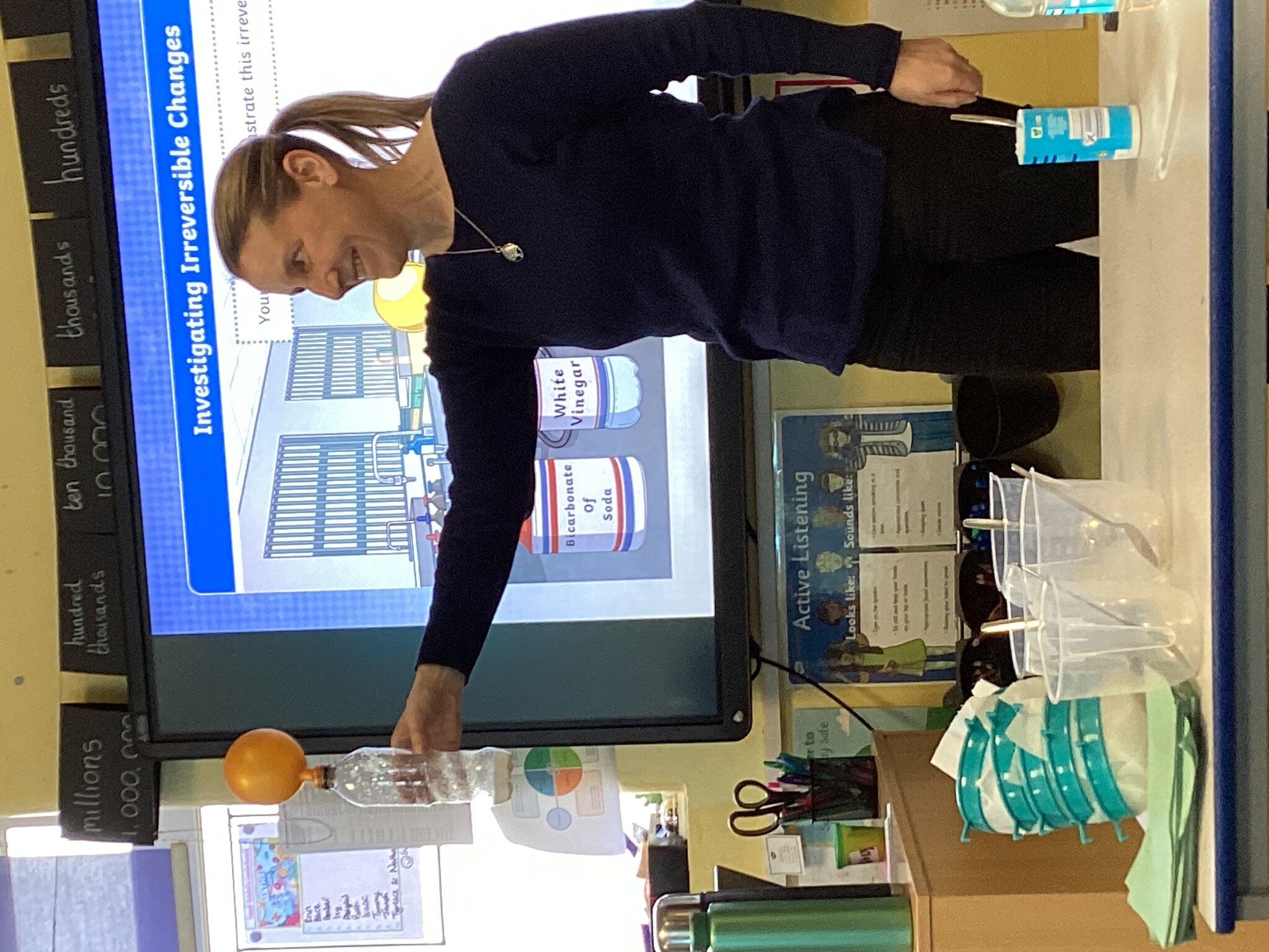 In Science this week, Upper School learnt about irreversible changes of matter. Firstly, we discussed what reversible and irreversible meant. We related this to materials that we have already investigated such as water and chocolate. Next we discussed what makes something an irreversible change. Burning wood, cooking eggs, baking cakes were ideas that they came up with. Next, I demonstrated an example of an irreversible change by mixing bicarbonate of soda with vinegar and getting the class to observe the way it fizzed, foamed and inflated the balloon with carbon dioxide on top of the bottle. The children noticed that after the chemical reaction, the vinegar didn’t smell anymore and was much more like water.
