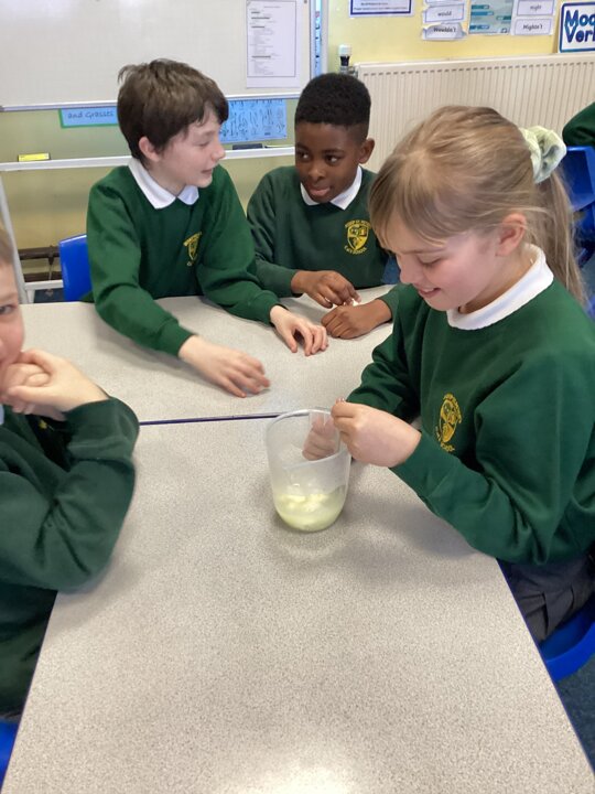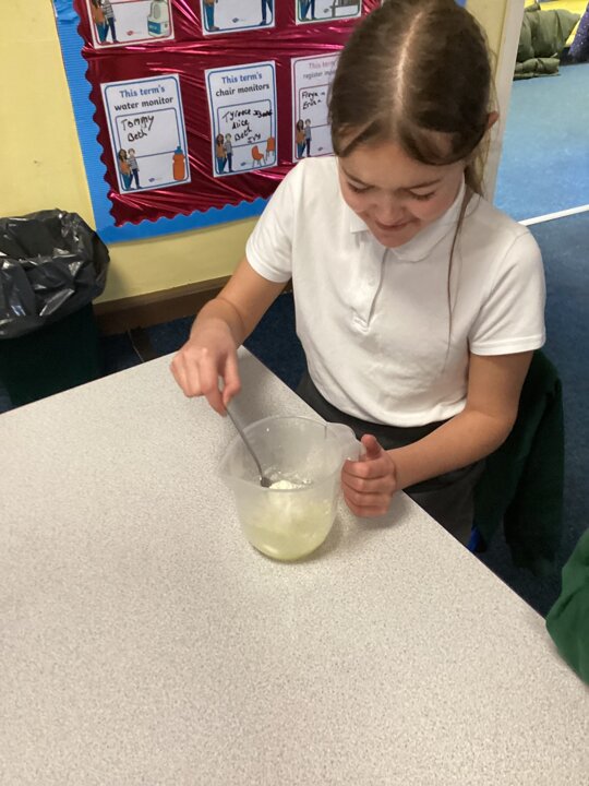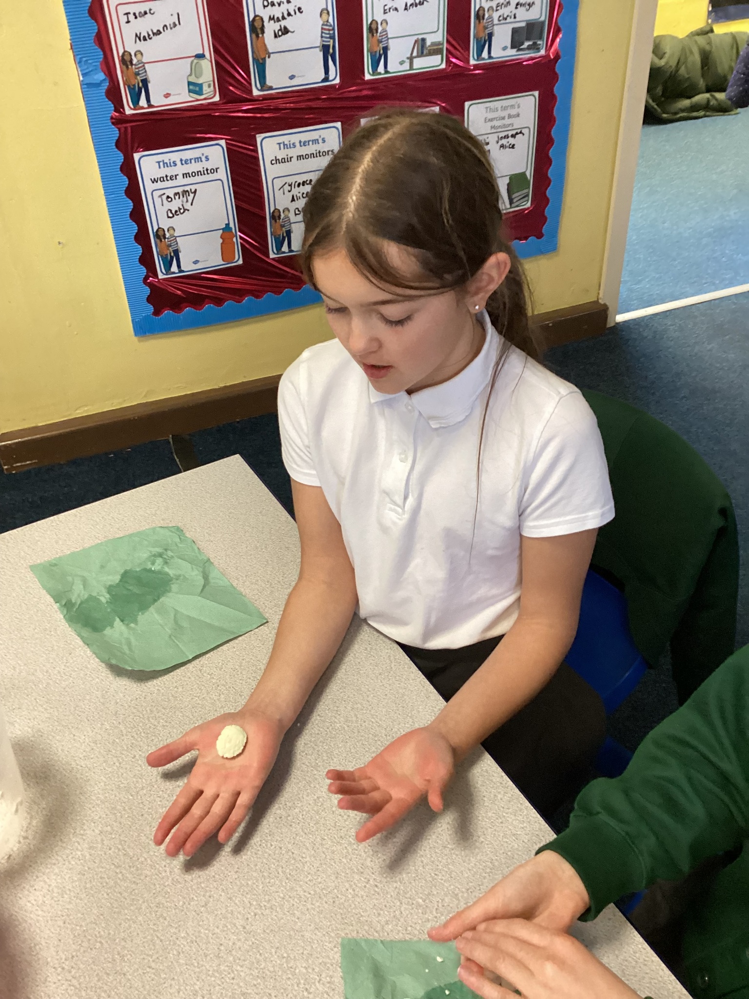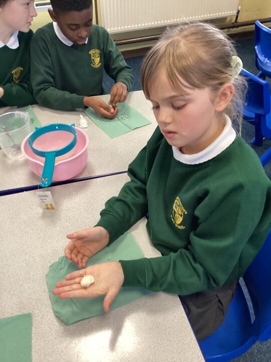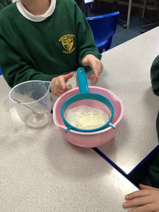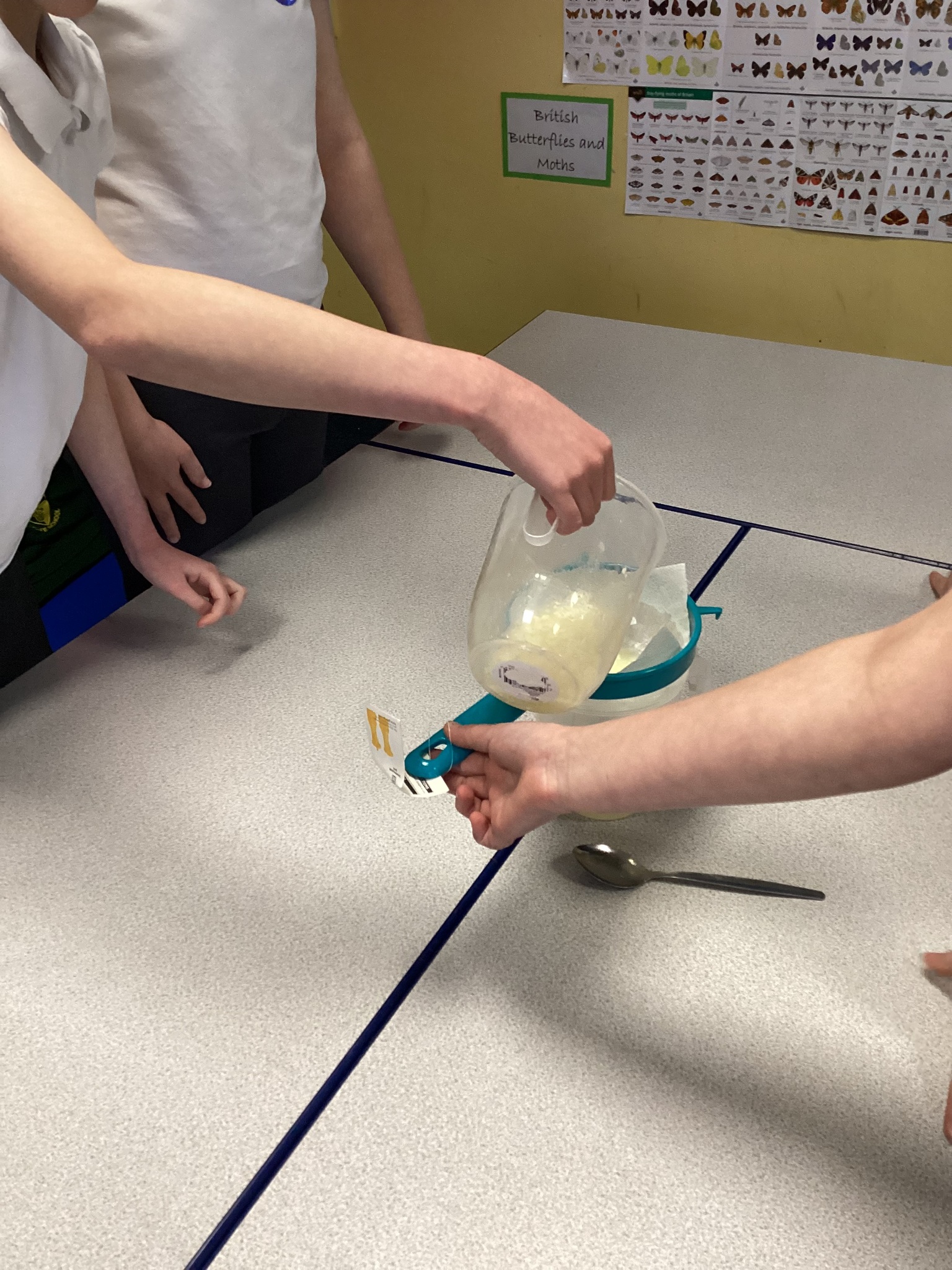 Finally, I told the children about casein plastic and how it can be made by a chemical reaction between hot milk and vinegar. The children tried this out for themselves and observed the interesting way the milk changed. They were amazed at the results and were able to make a shape with the ‘white dough’ that was left after filtering. They will continue to observe these dough shapes over the coming days to see what happens to them…