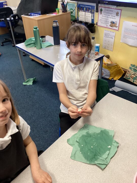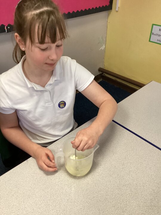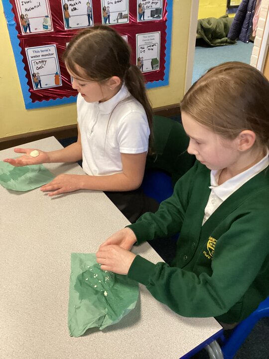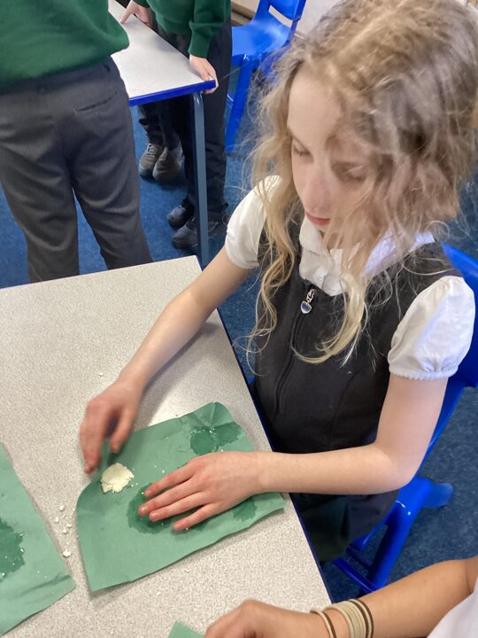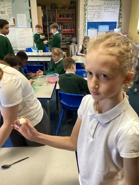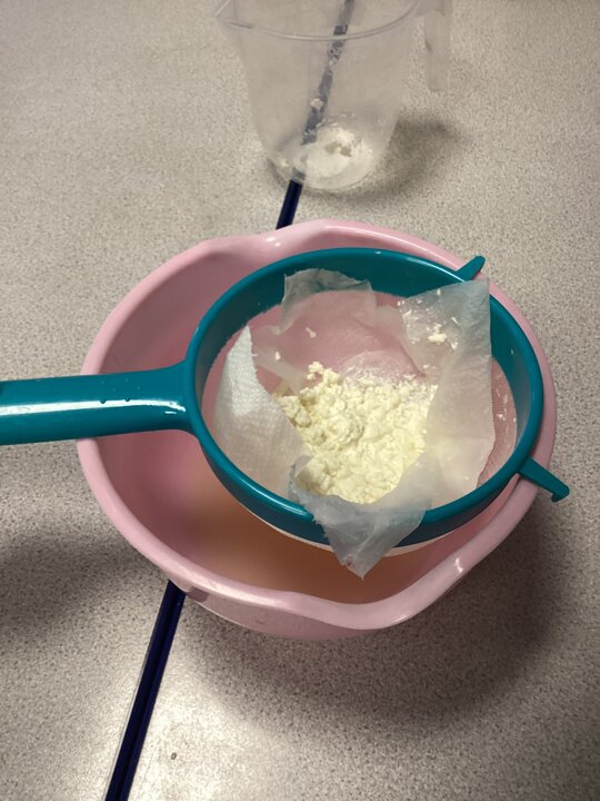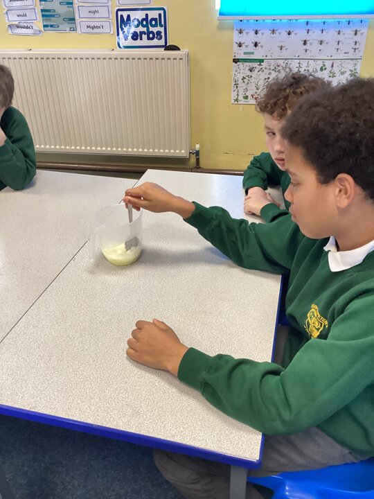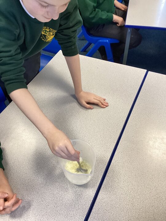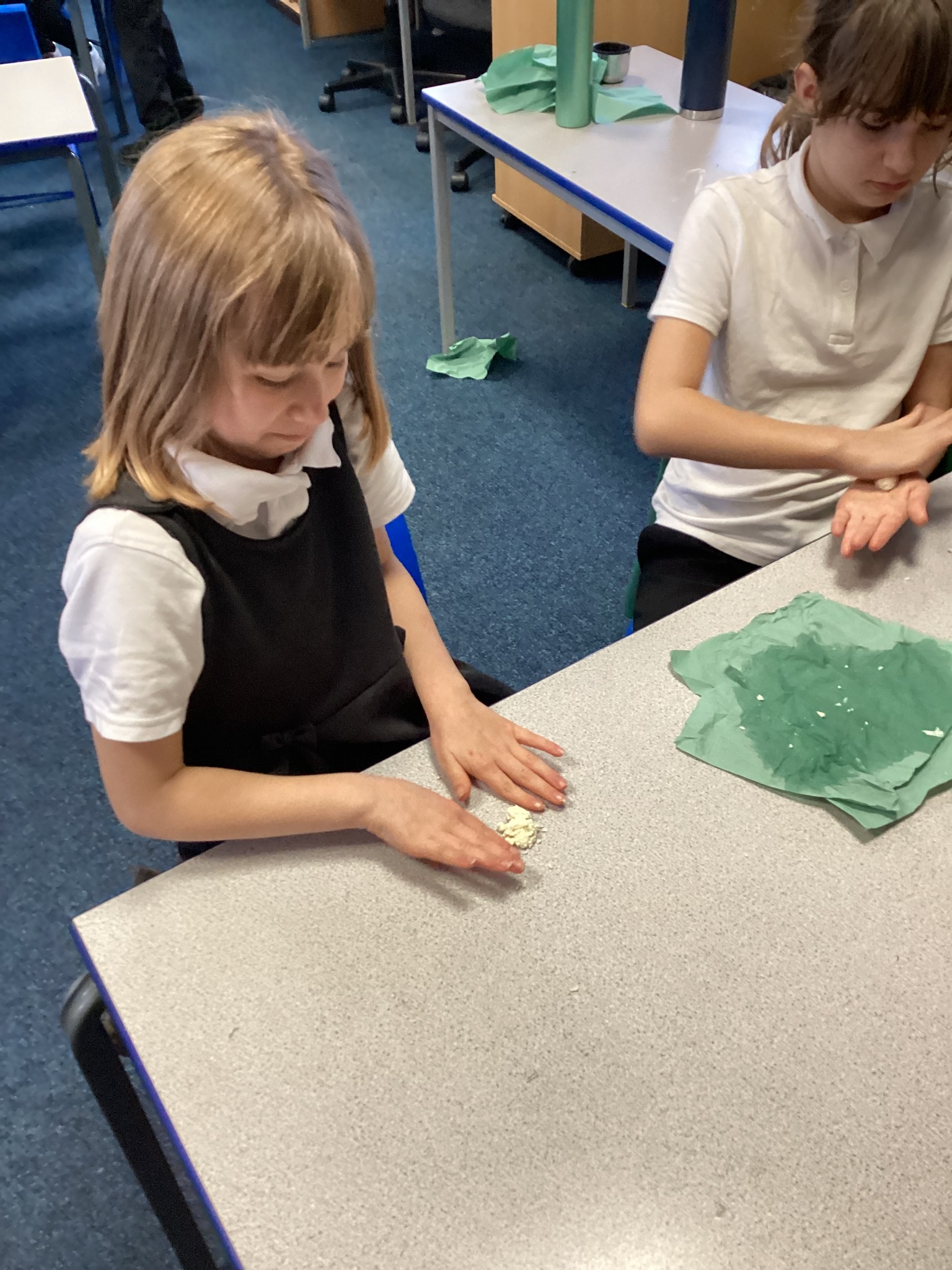 Finally, I told the children about casein plastic and how it can be made by a chemical reaction between hot milk and vinegar. The children tried this out for themselves and observed the interesting way the milk changed. They were amazed at the results and were able to make a shape with the ‘white dough’ that was left after filtering. They will continue to observe these dough shapes over the coming days to see what happens to them…