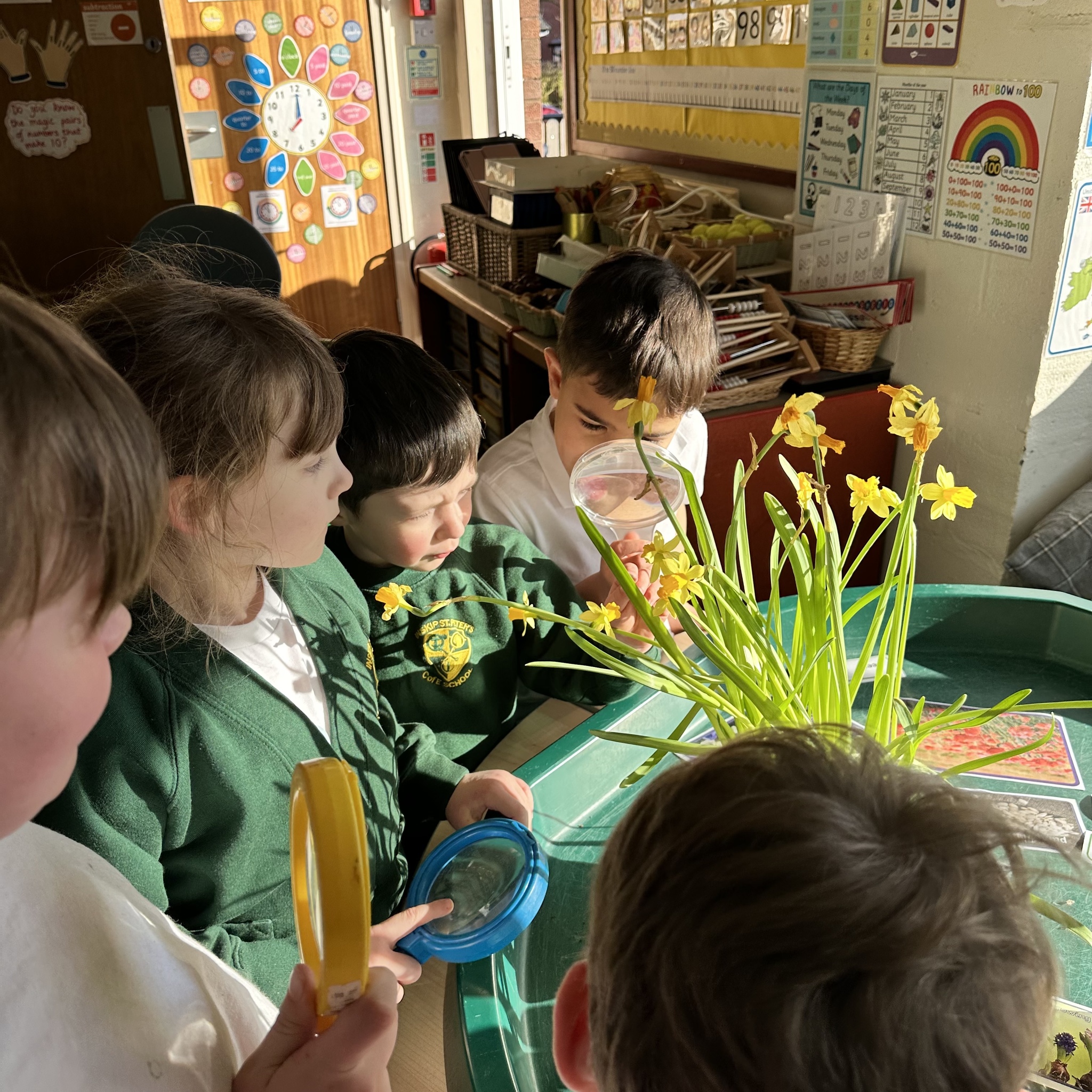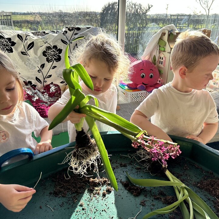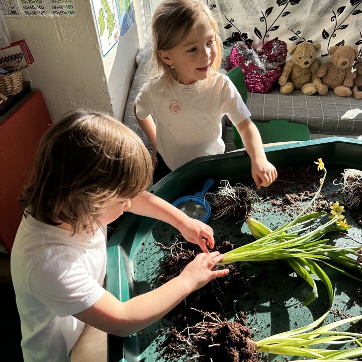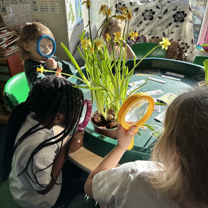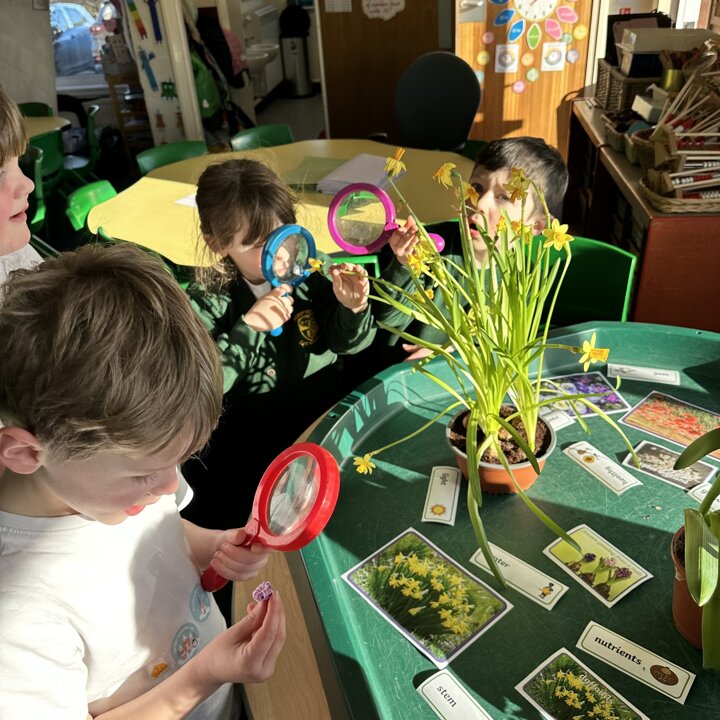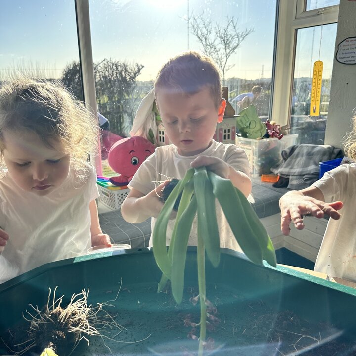 Yesterday, we had a discussion about flowers that grow from bulbs and ones that grow from seeds. The children had a close look at the different parts of some daffodils and hyacinths questioning what they saw. They also went on a hunt outdoors looking for plants shooting up through the soil and noticing changes in nature.
