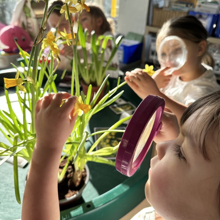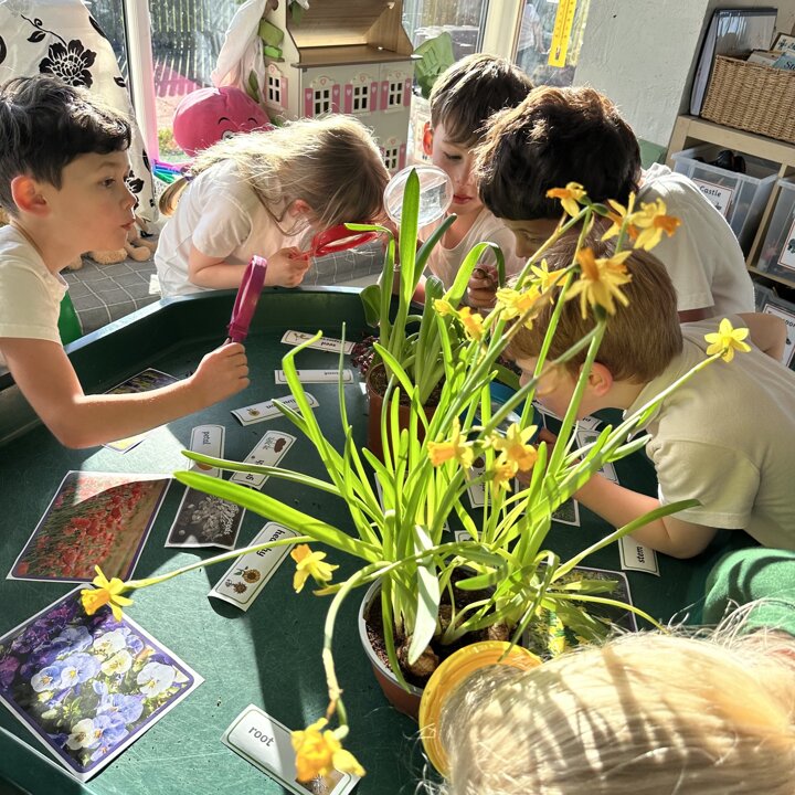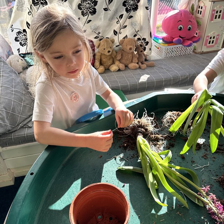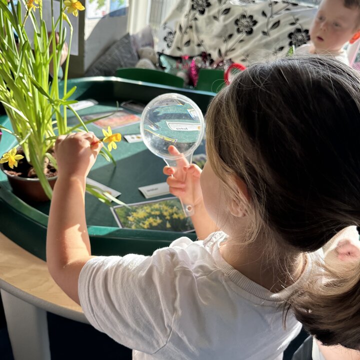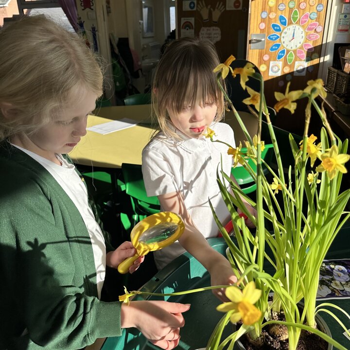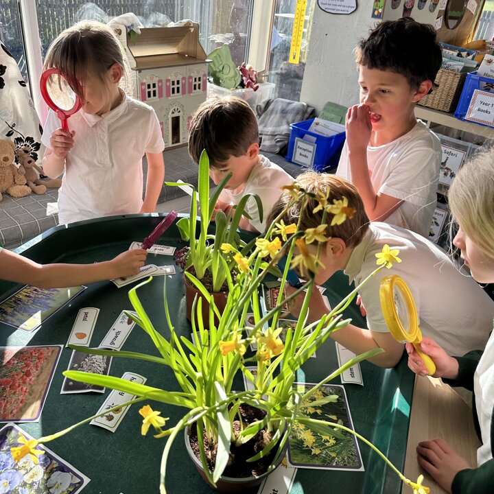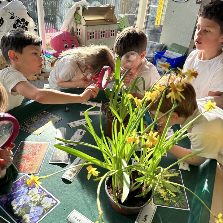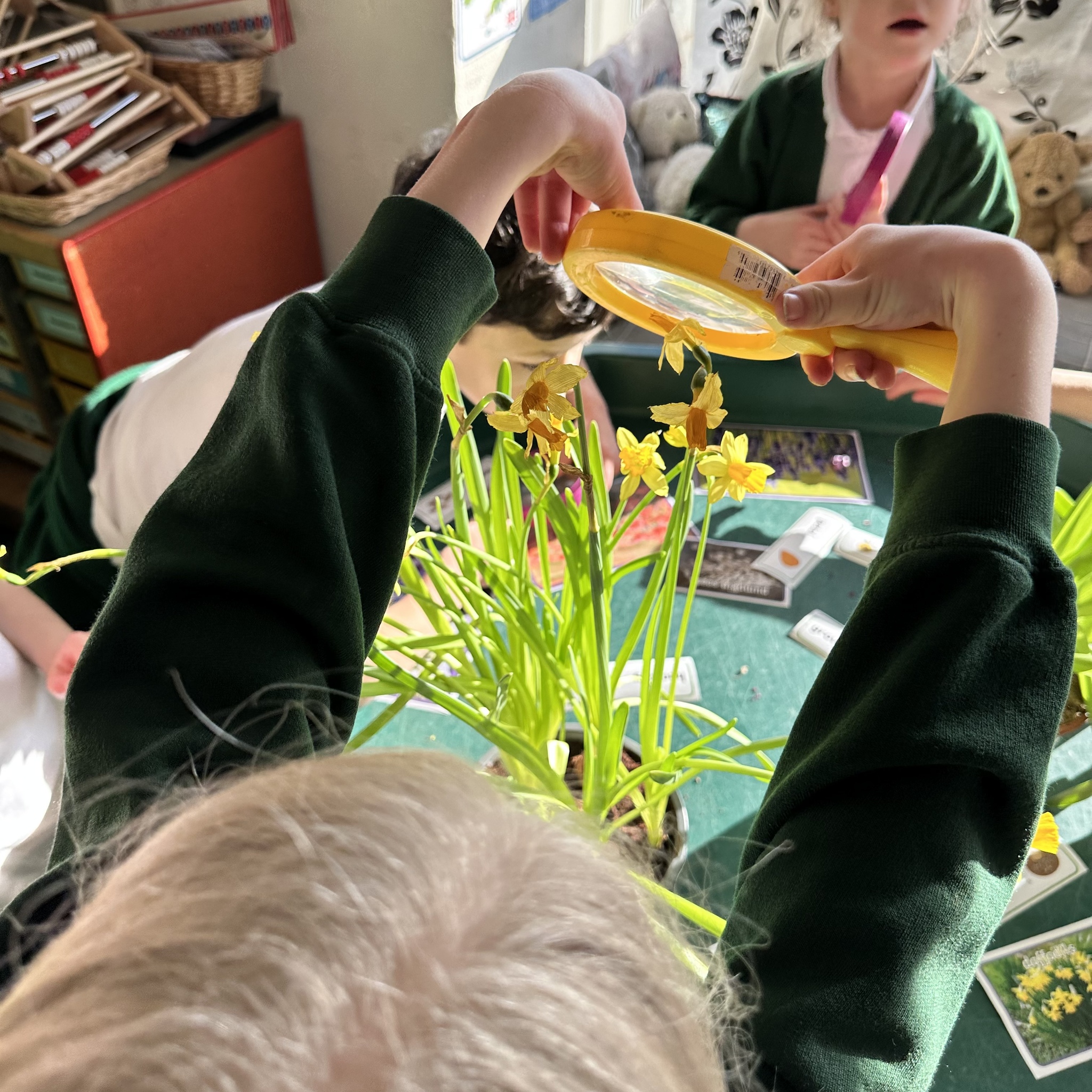 Yesterday, we had a discussion about flowers that grow from bulbs and ones that grow from seeds. The children had a close look at the different parts of some daffodils and hyacinths questioning what they saw. They also went on a hunt outdoors looking for plants shooting up through the soil and noticing changes in nature.