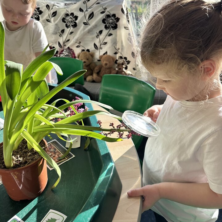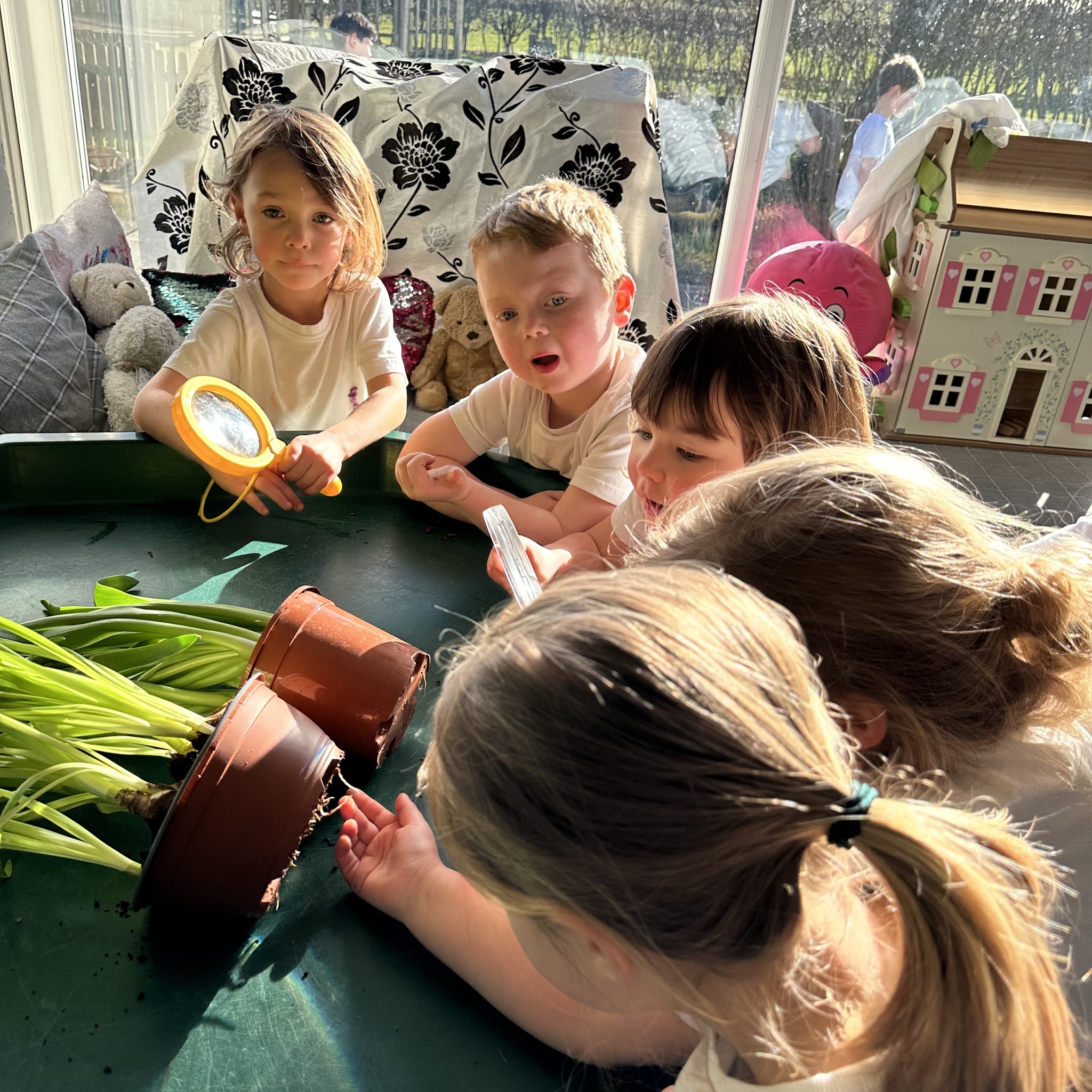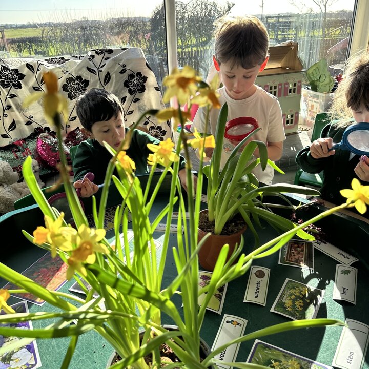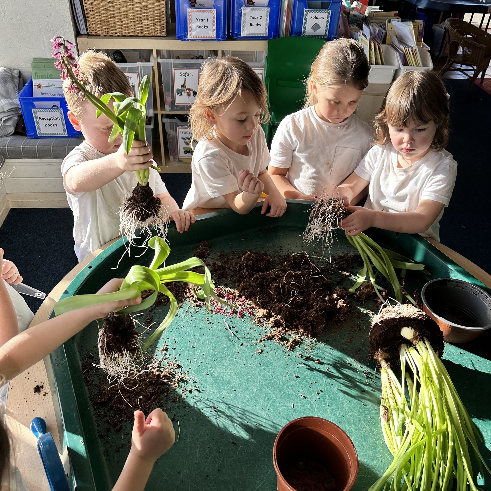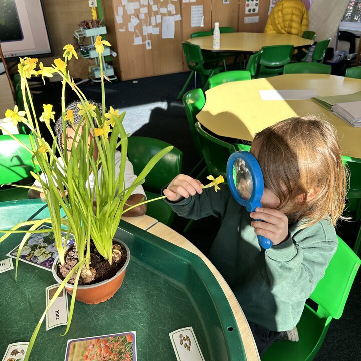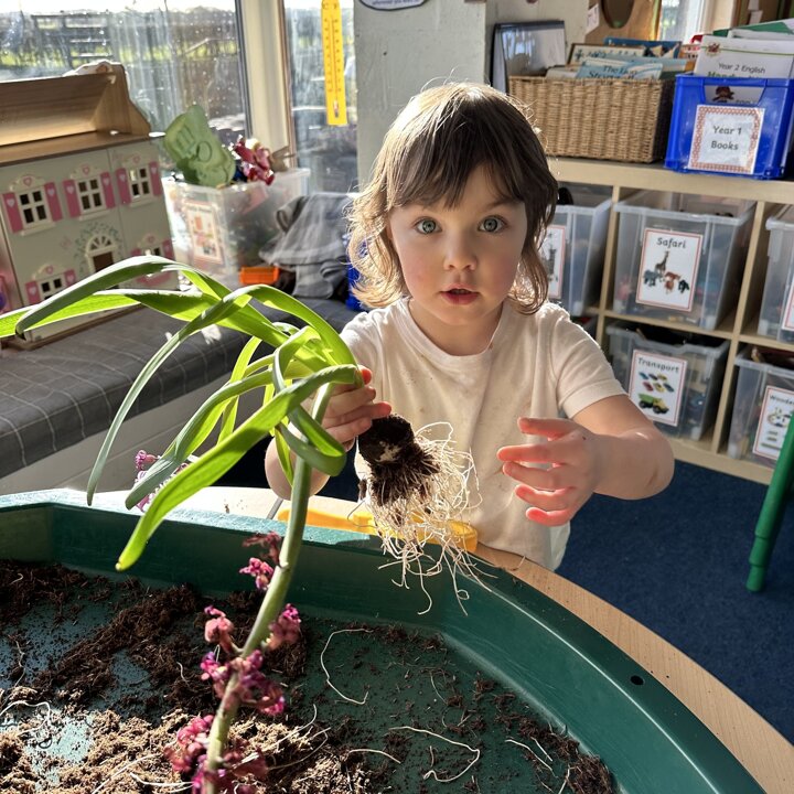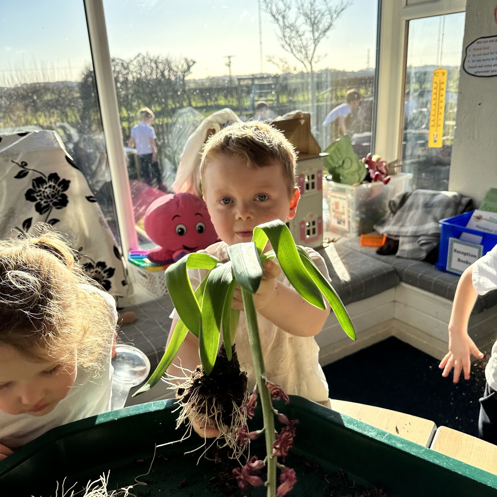 Each term we dip in and out of science learning about plants, observing what is growing at different times of the year. The children build up their knowledge and understanding of seasonal changes and the different stages of, and needs for, plant growth.