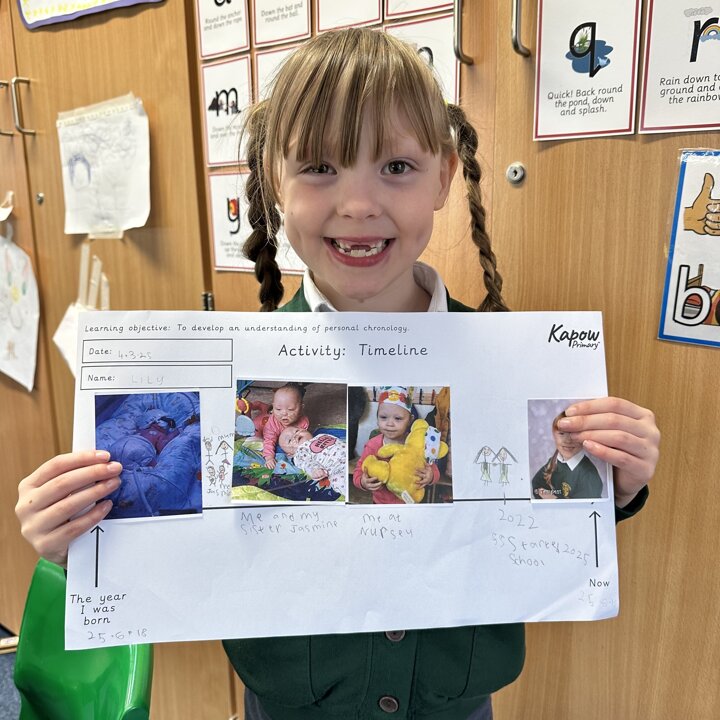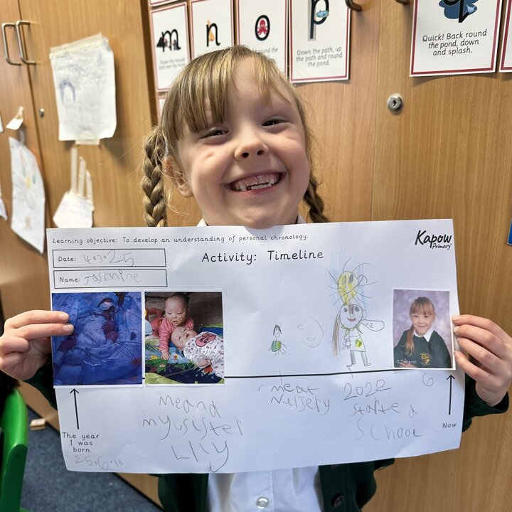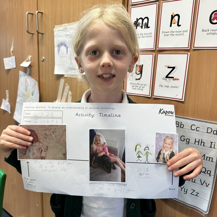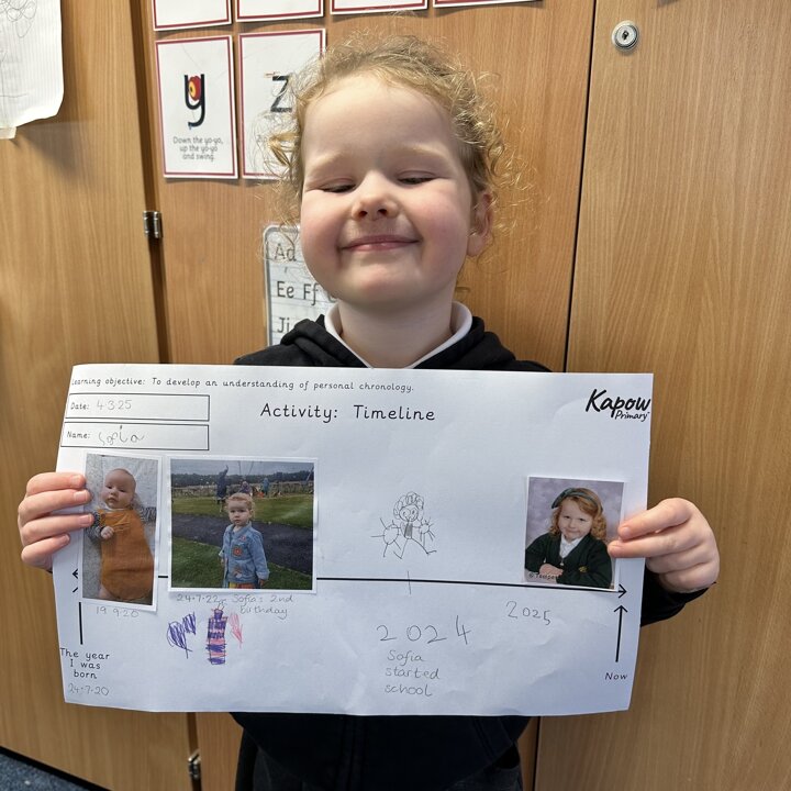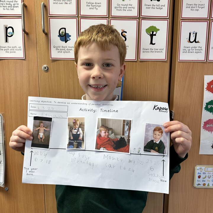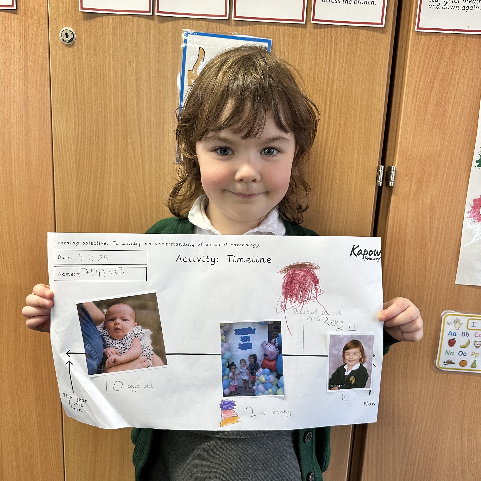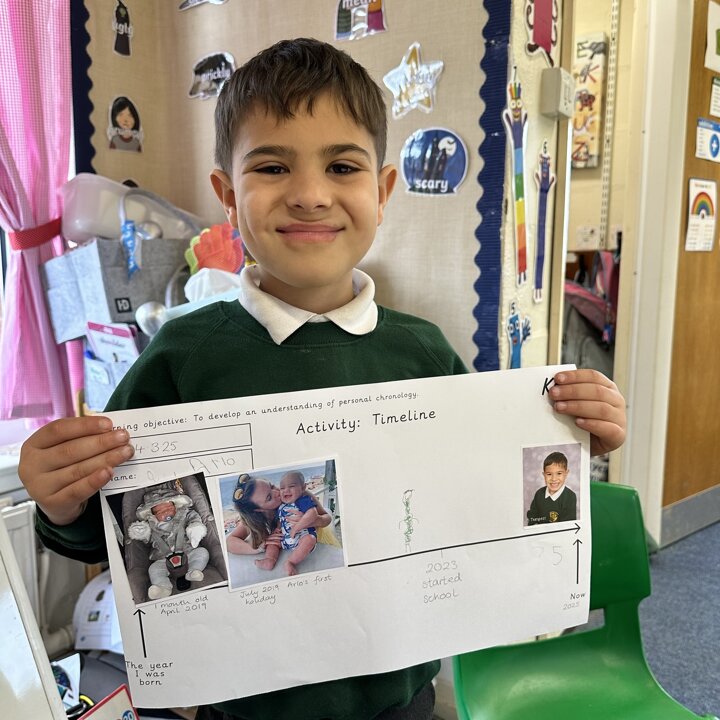 During this half term the children are learning some similarities and differences between the past and their own lives. They have learnt that a timeline shows the order events in the past happened. We started by looking at now on a timeline and then looked back.