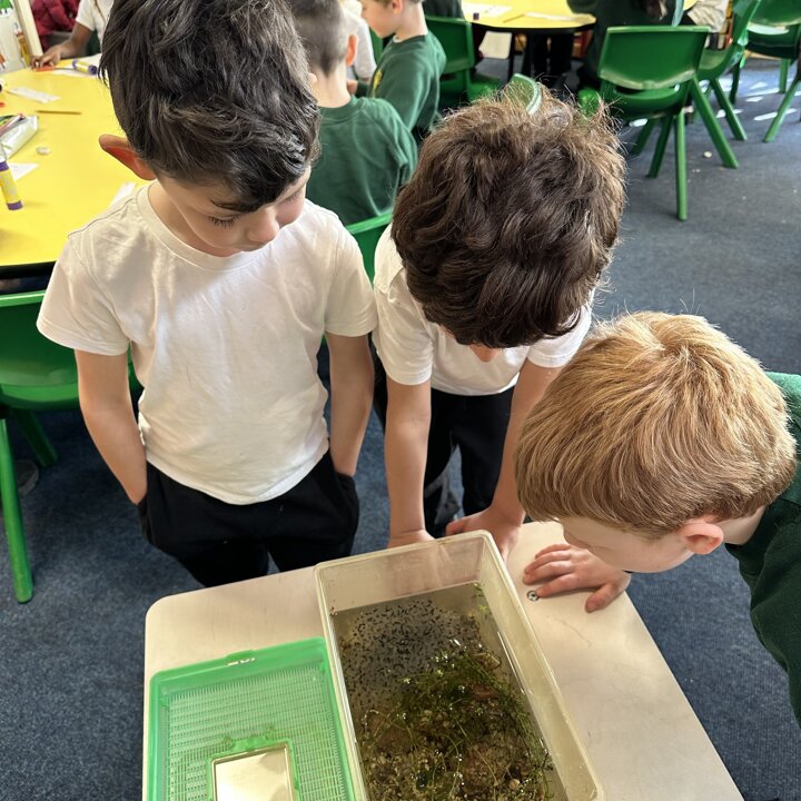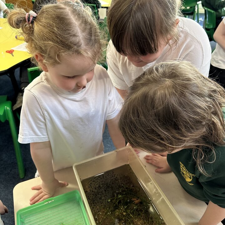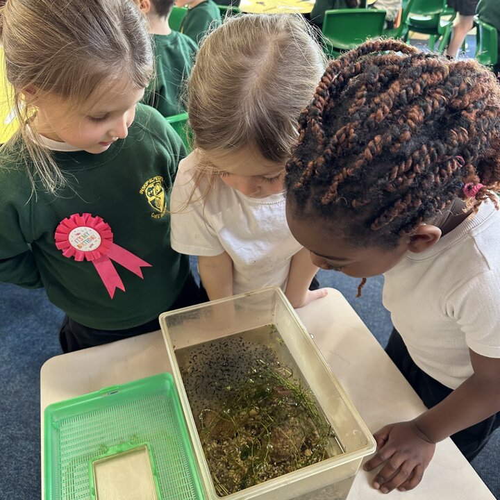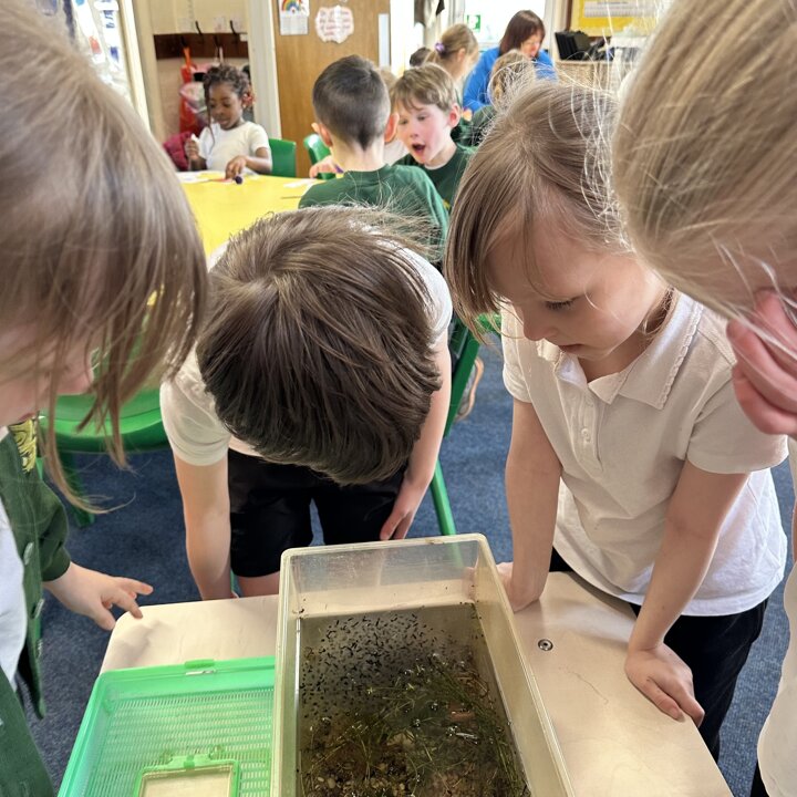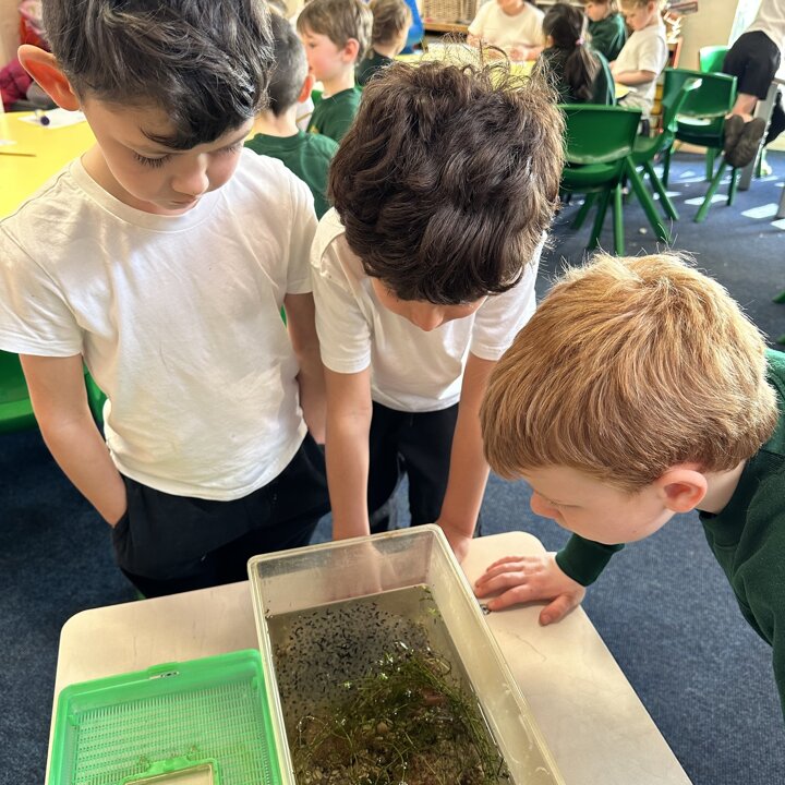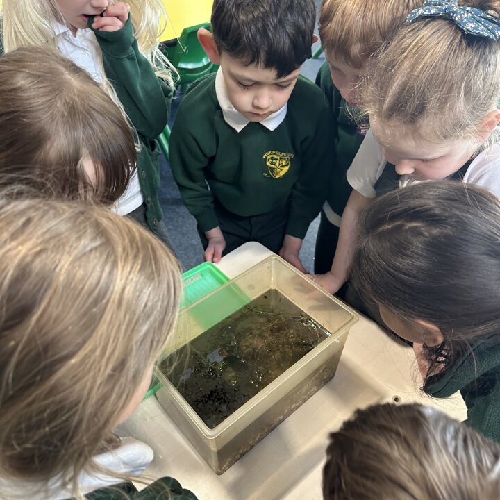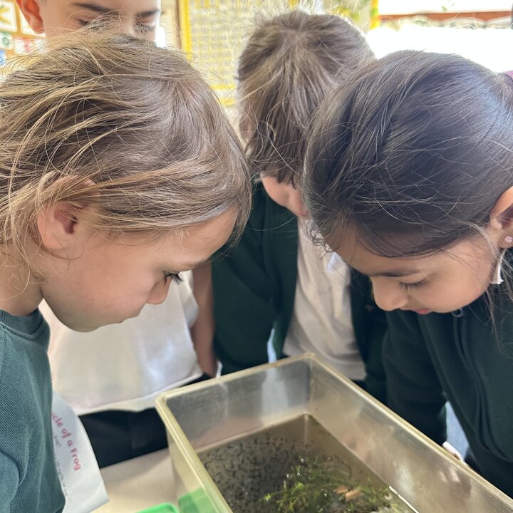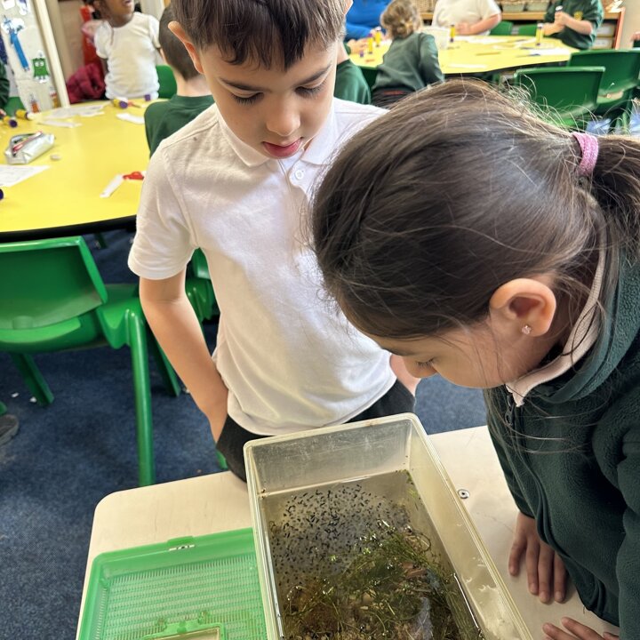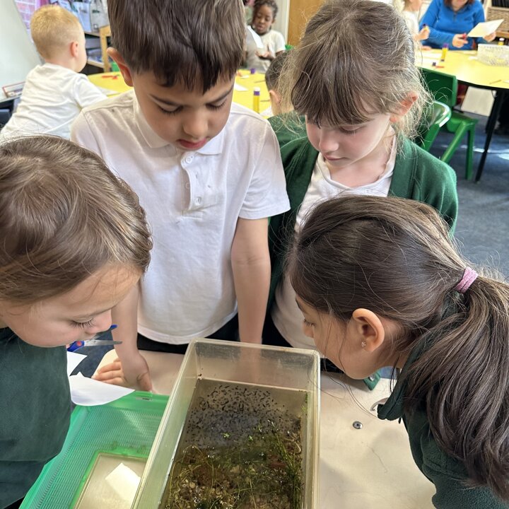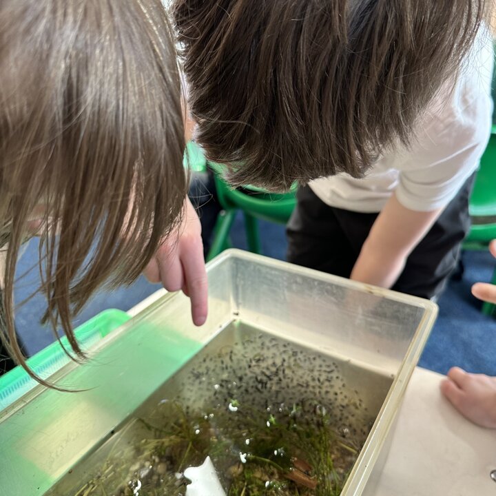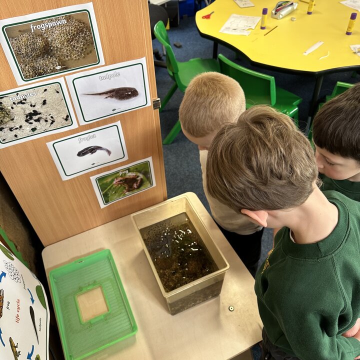 A few weeks ago, Luke’s Grandma kindly brought us some frog spawn to study. We kept it at school long enough to see a few tadpoles emerge before giving it back for it to be returned to the pond for the tadpoles to grow and turn into frogs in their natural environment.