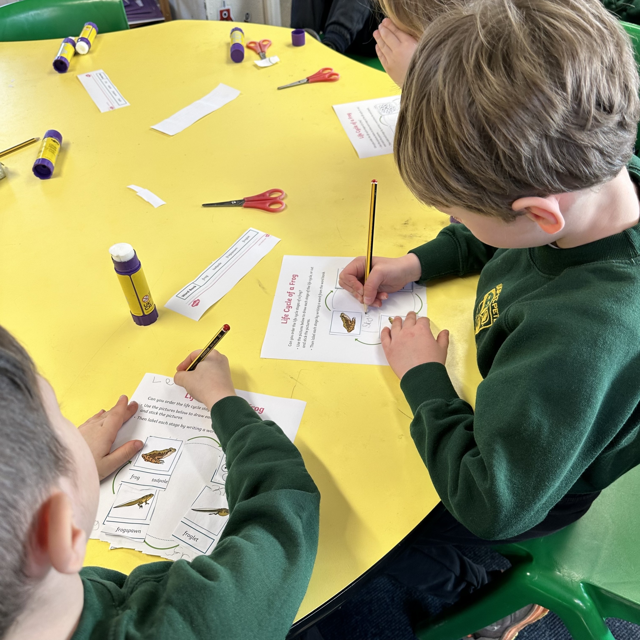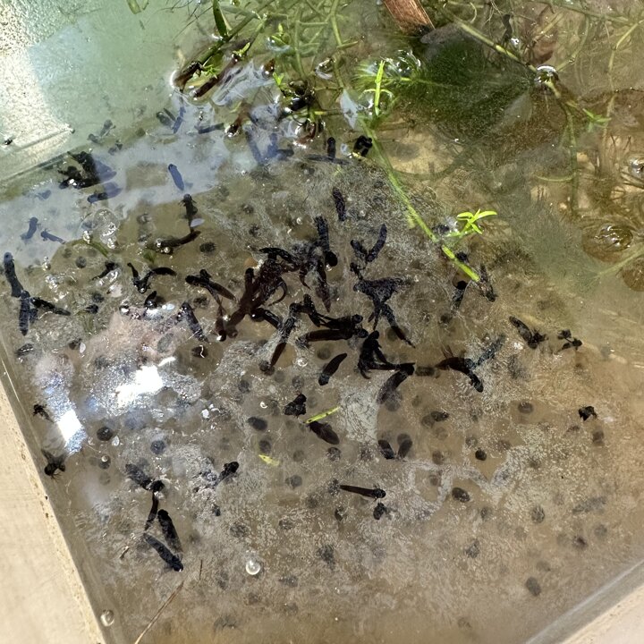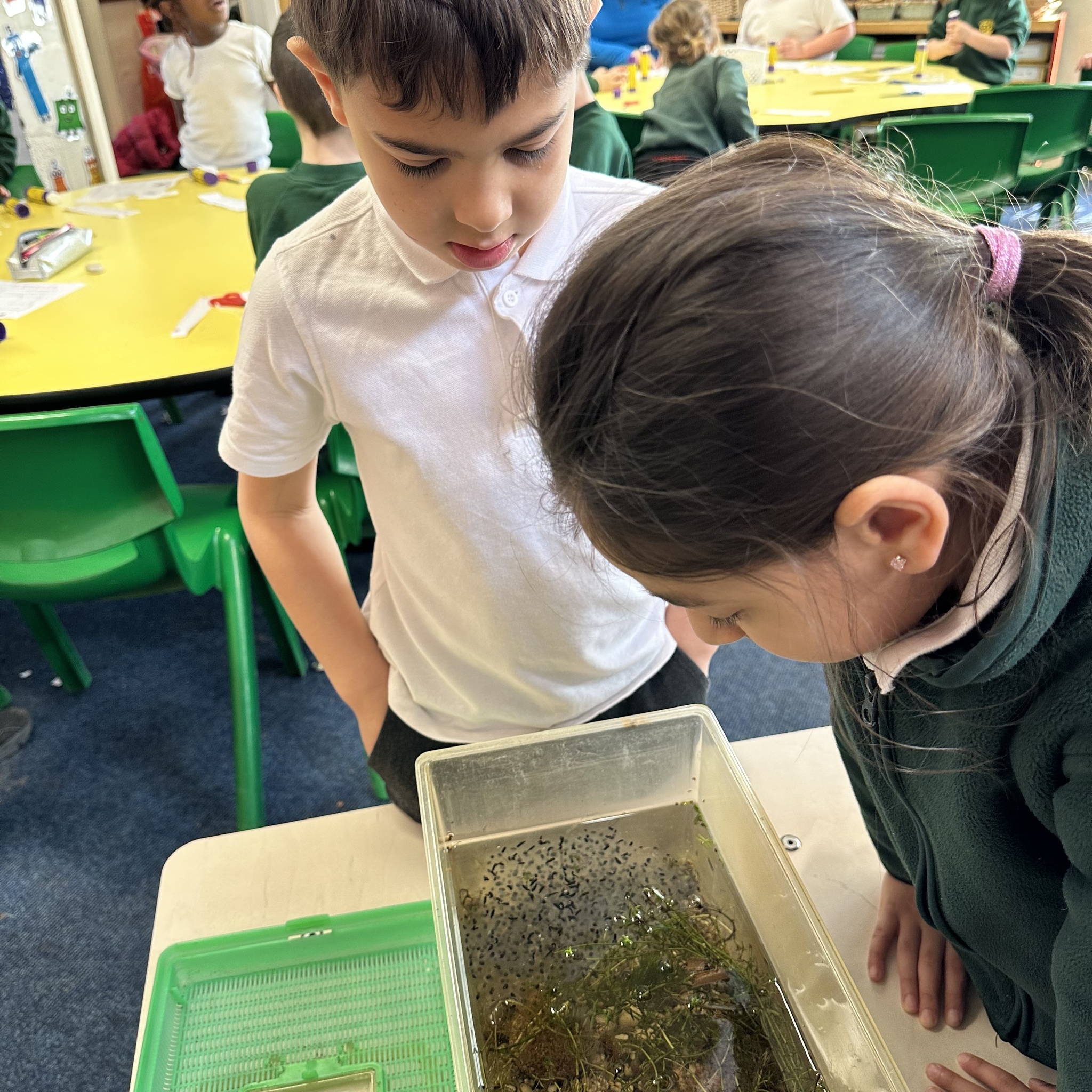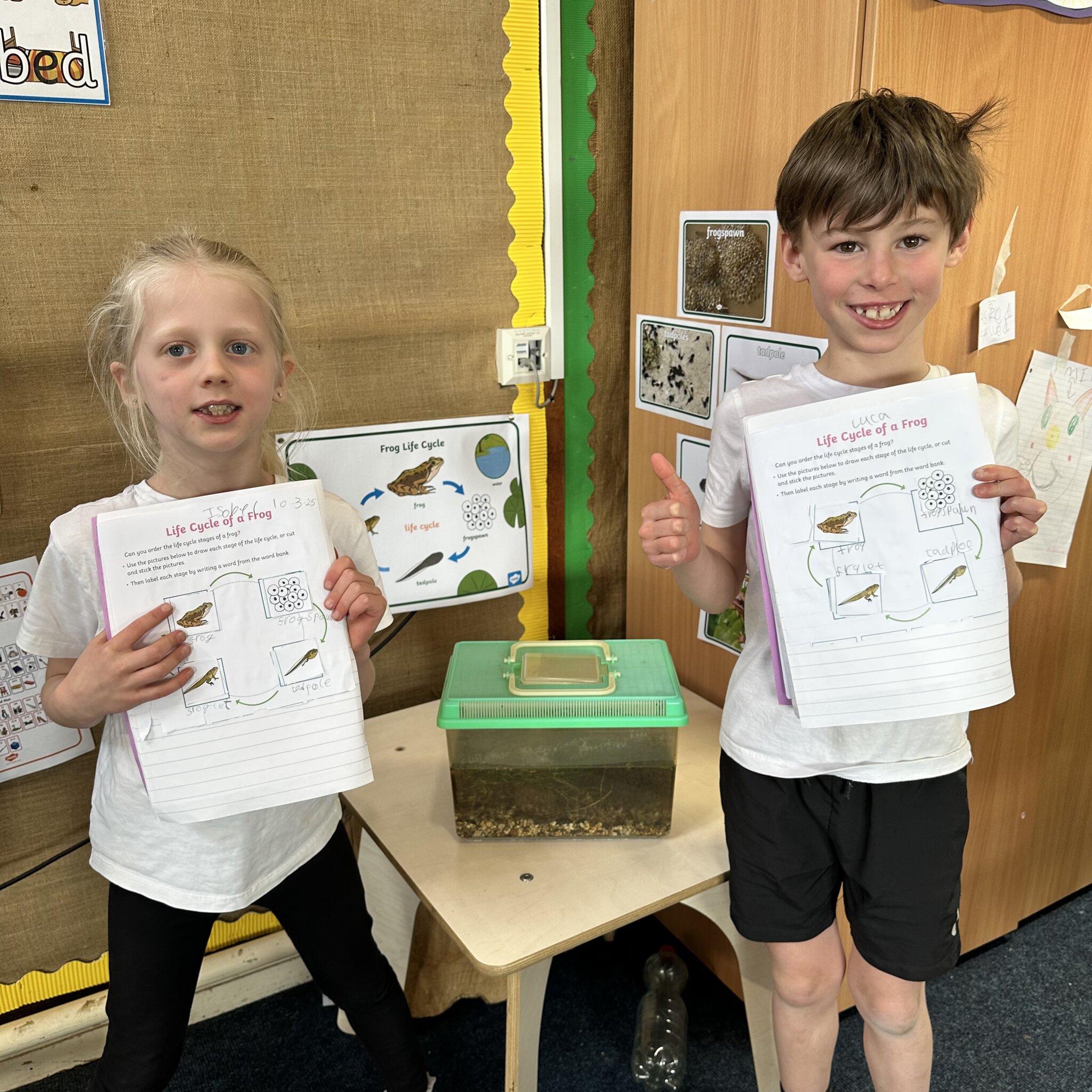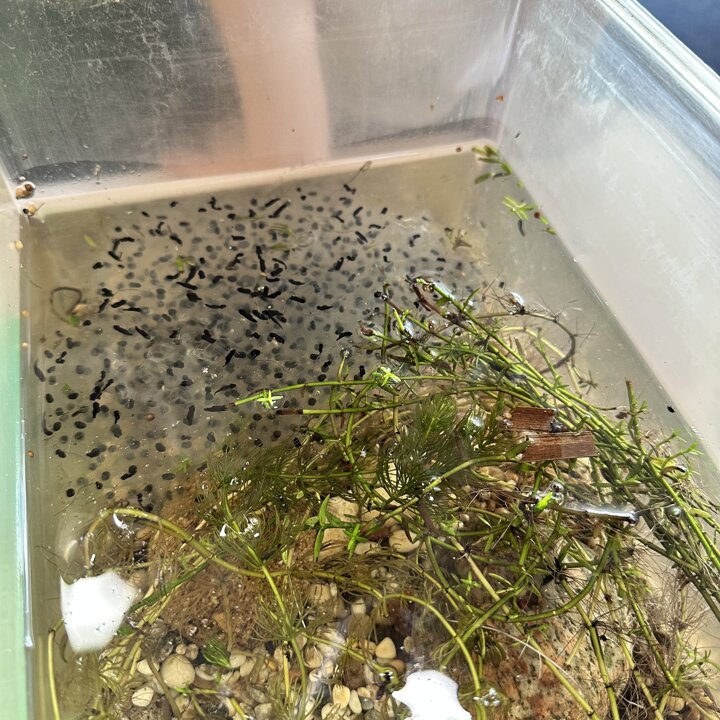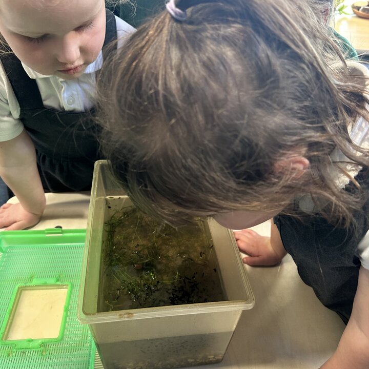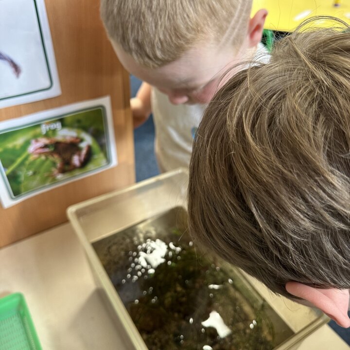A few weeks ago, Luke’s Grandma kindly brought us some frog spawn to study. We kept it at school long enough to see a few tadpoles emerge before giving it back for it to be returned to the pond for the tadpoles to grow and turn into frogs in their natural environment.