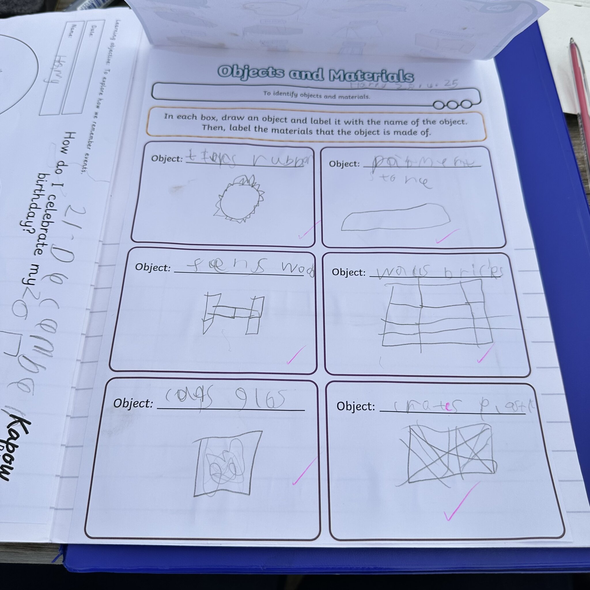 We have begun investigating materials and their uses in science learning this term. The children have been looking at a variety of objects and investigating which materials they are made of and discussing why they are made out of that particular material.