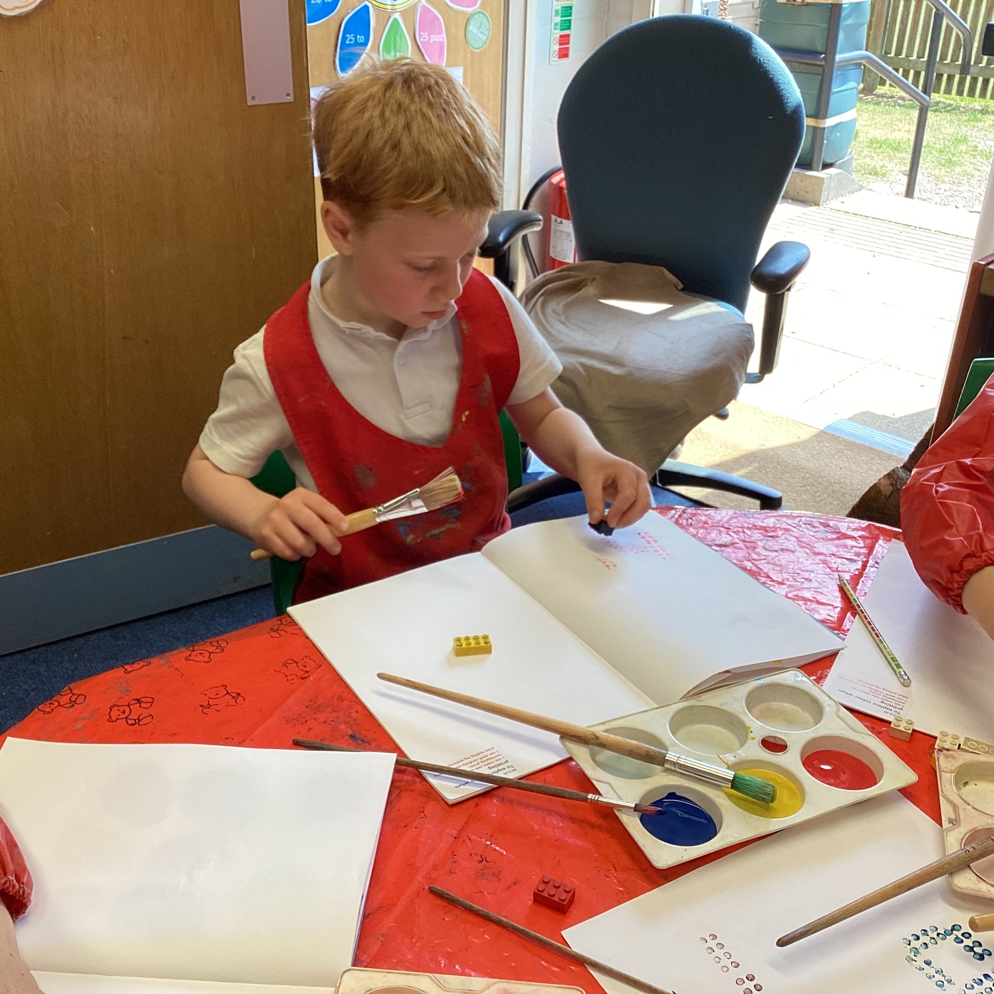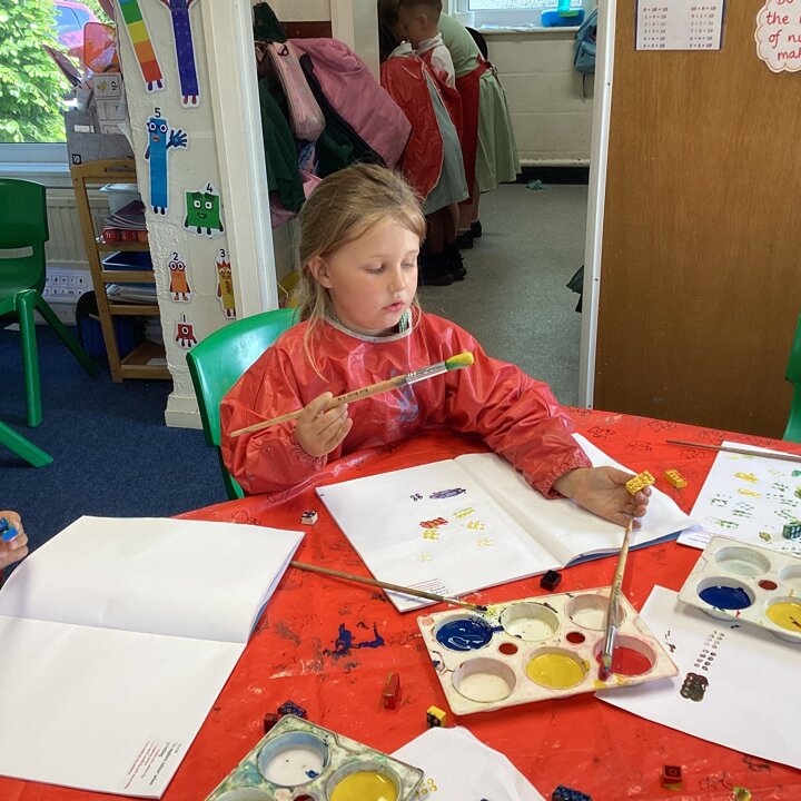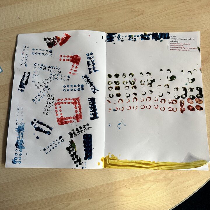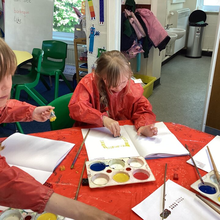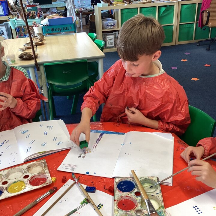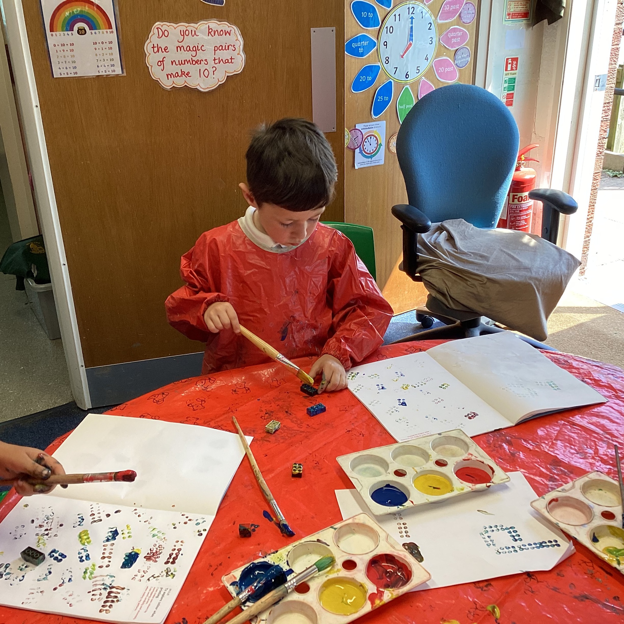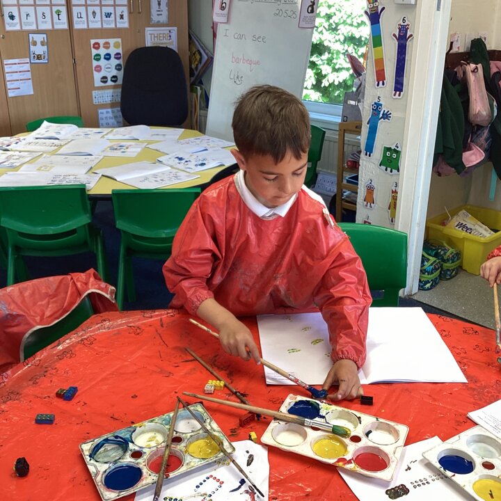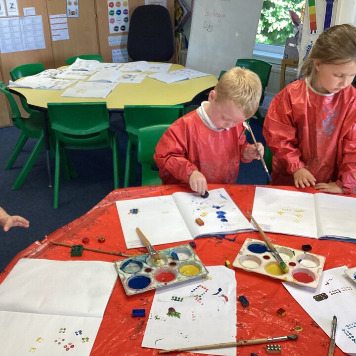 Using Lego bricks to create prints the children experiments creating patterns, combining colours and creating pictures. They created the new colours by overlapping prints and aimed to work carefully and accurately to create their prints.