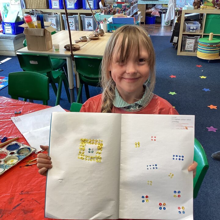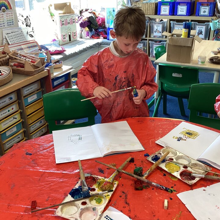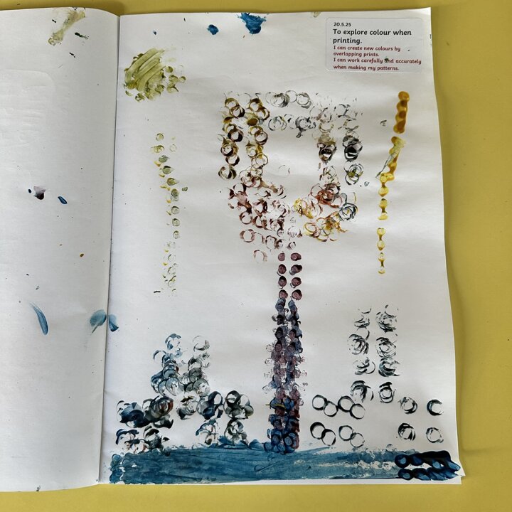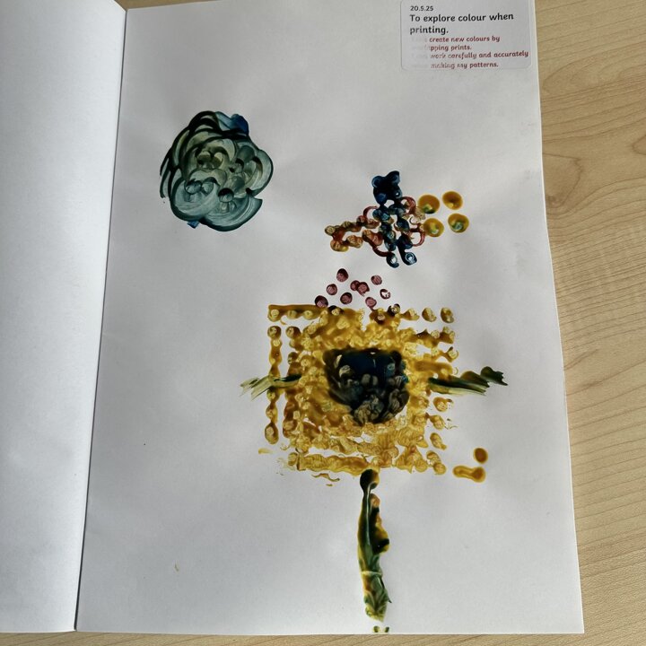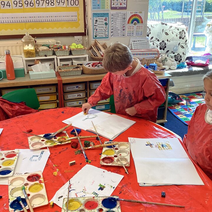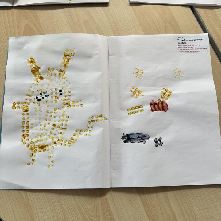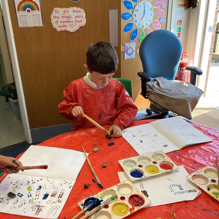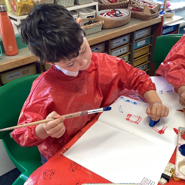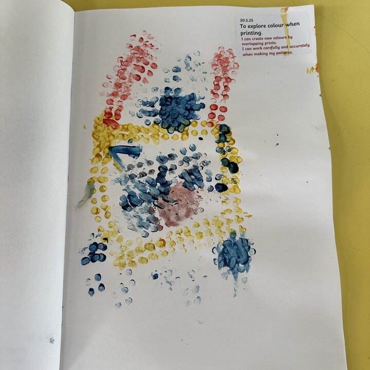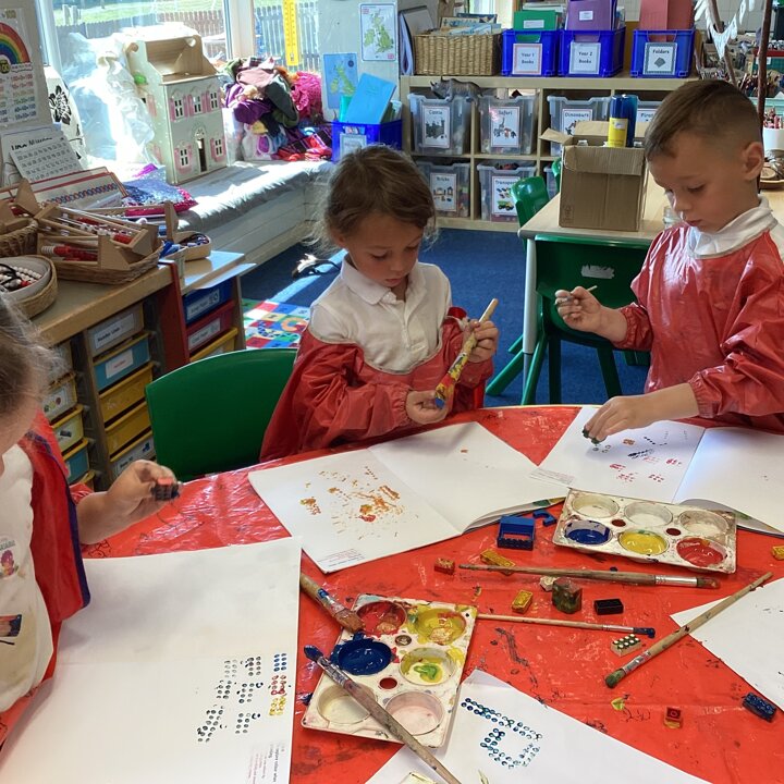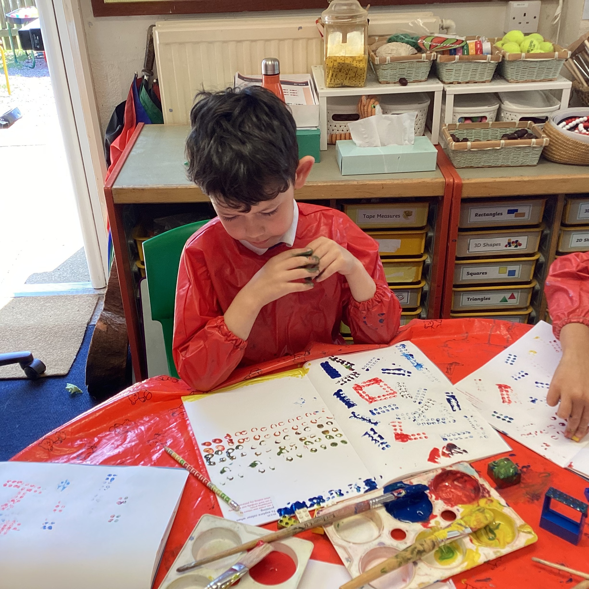 Using Lego bricks to create prints the children experiments creating patterns, combining colours and creating pictures. They created the new colours by overlapping prints and aimed to work carefully and accurately to create their prints.