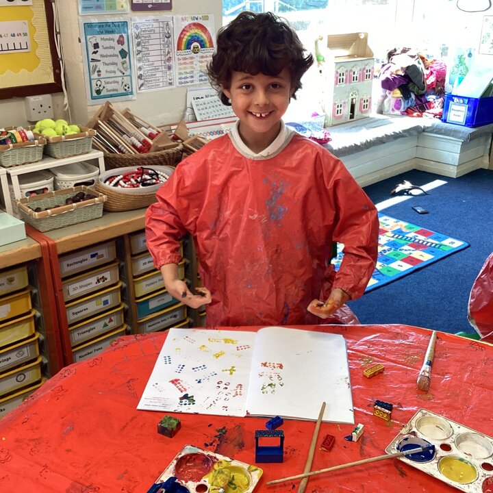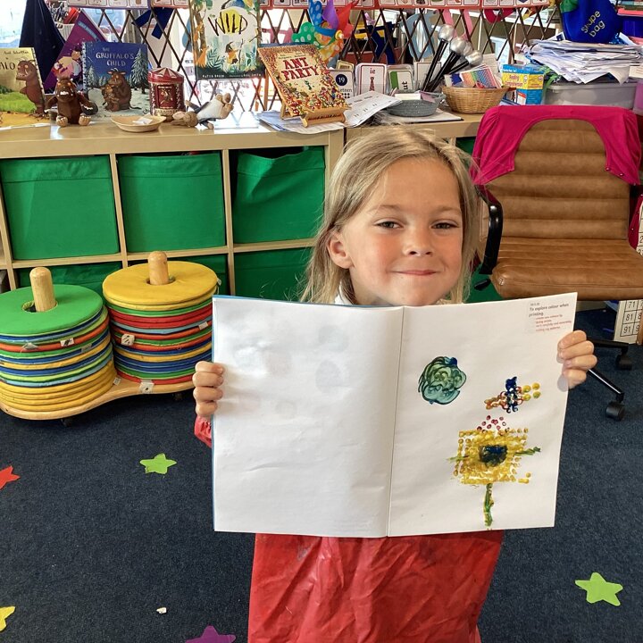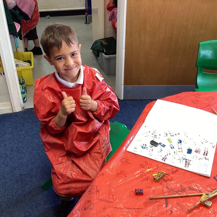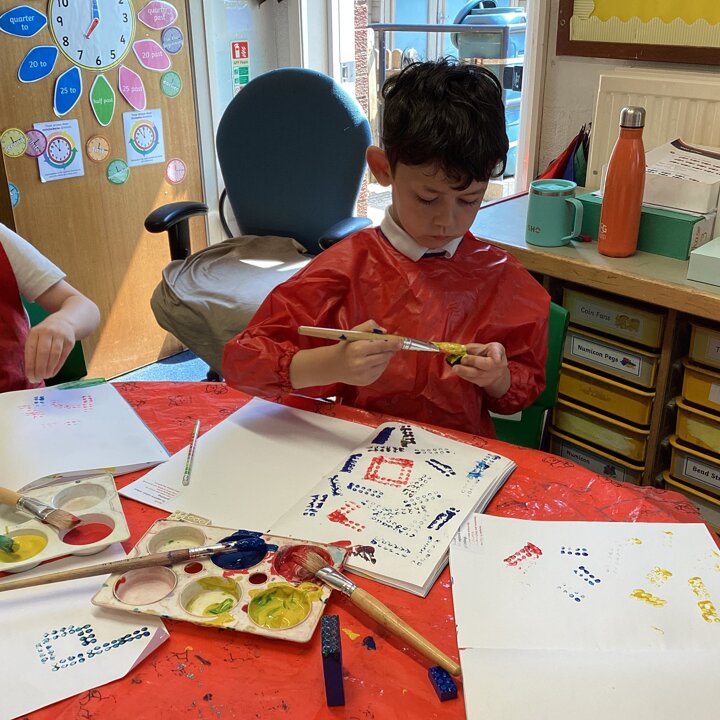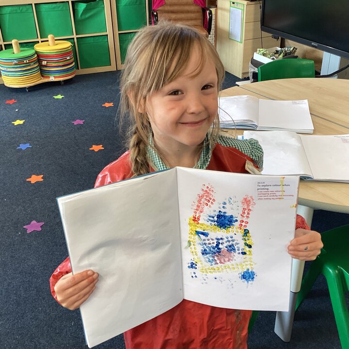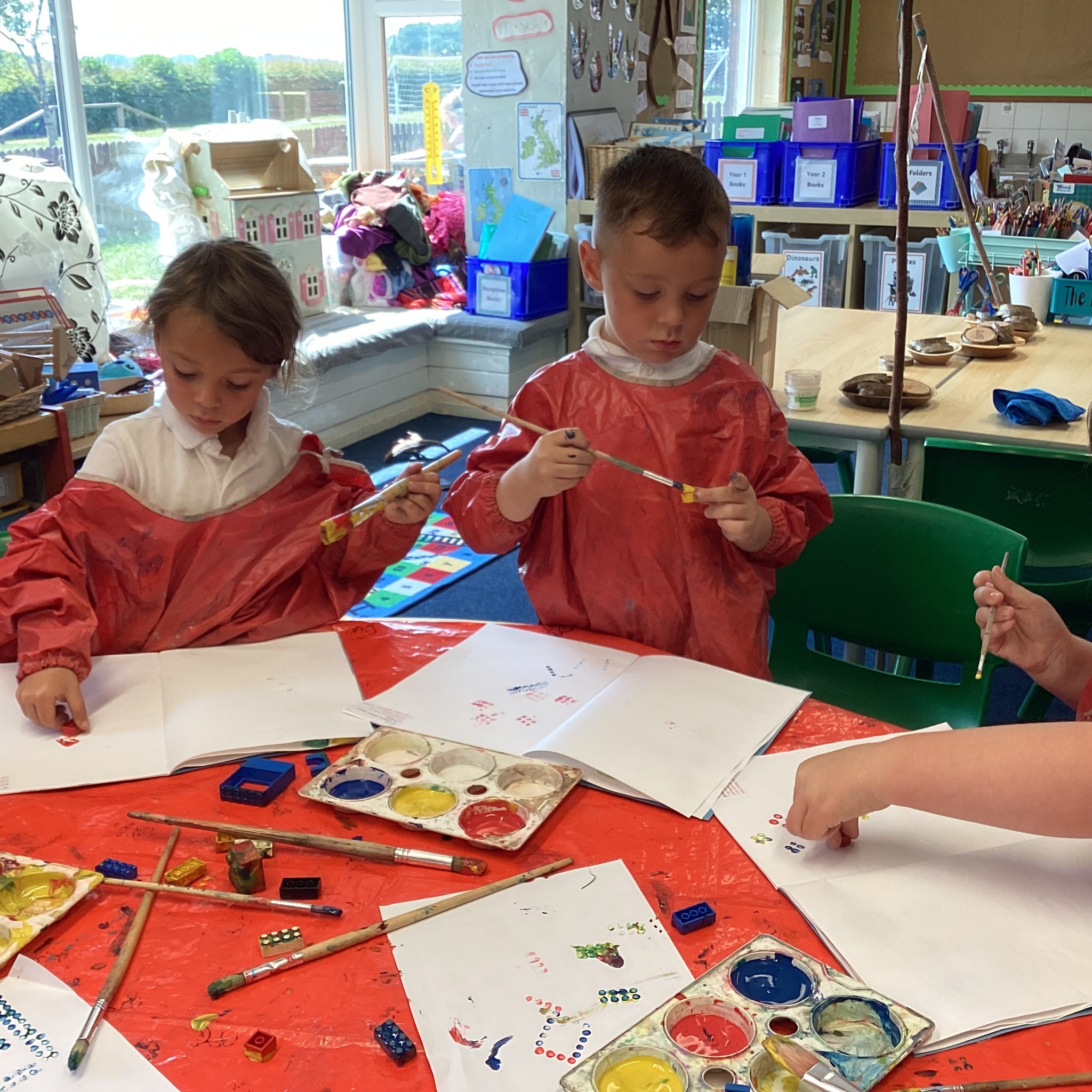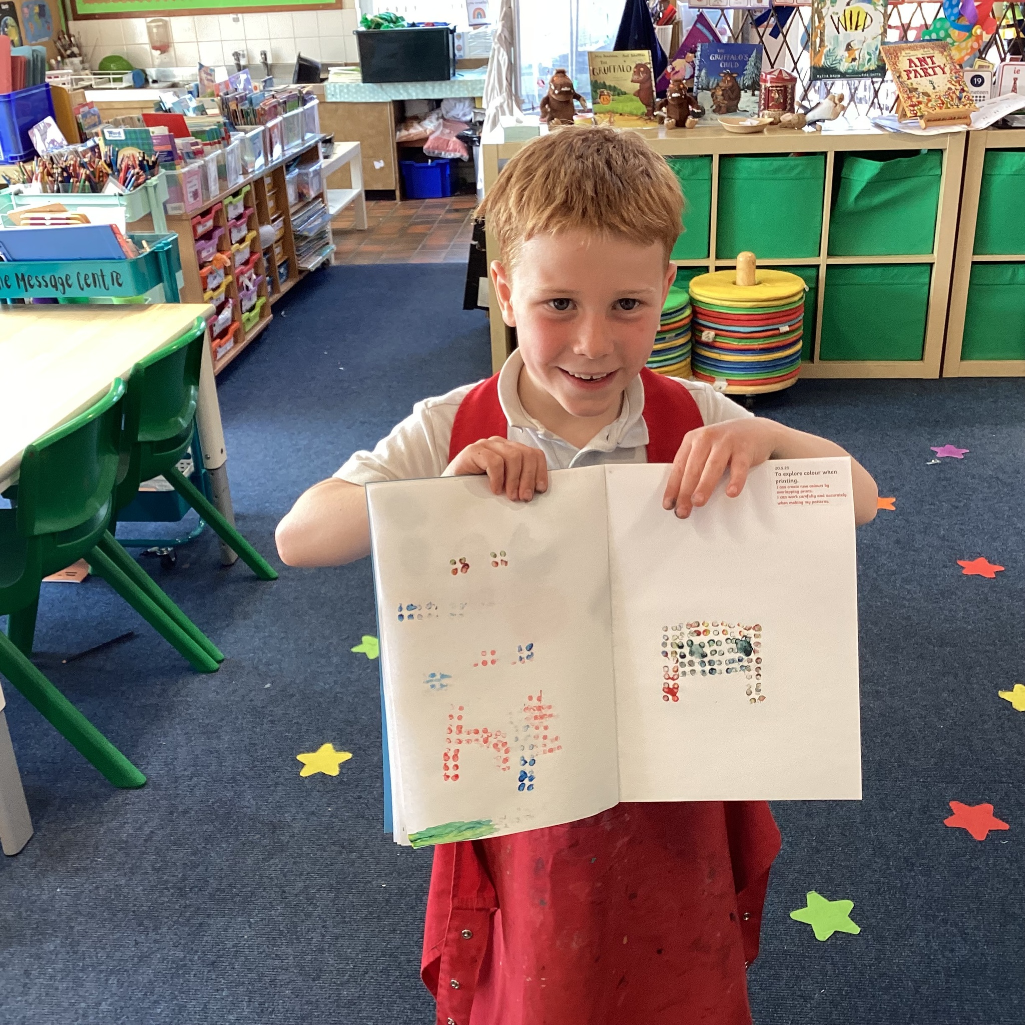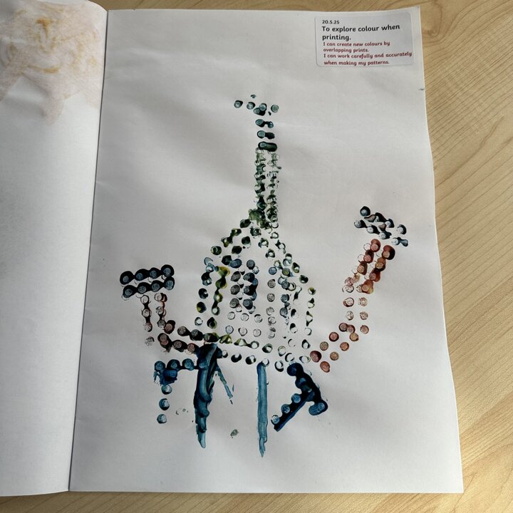 Using Lego bricks to create prints the children experiments creating patterns, combining colours and creating pictures. They created the new colours by overlapping prints and aimed to work carefully and accurately to create their prints.