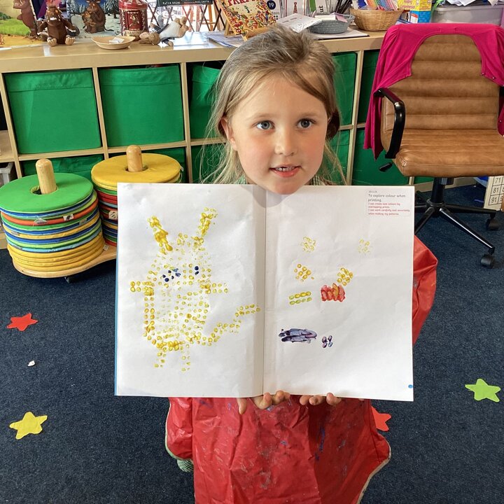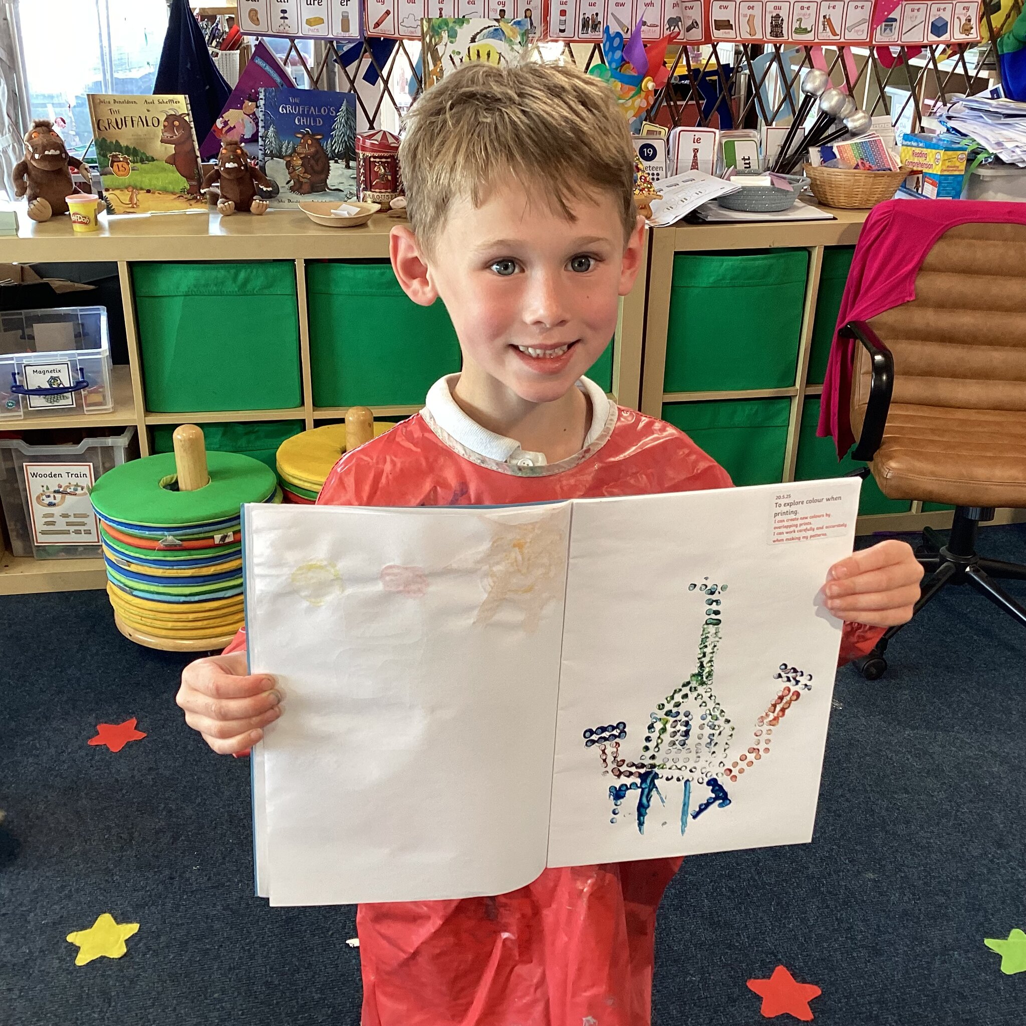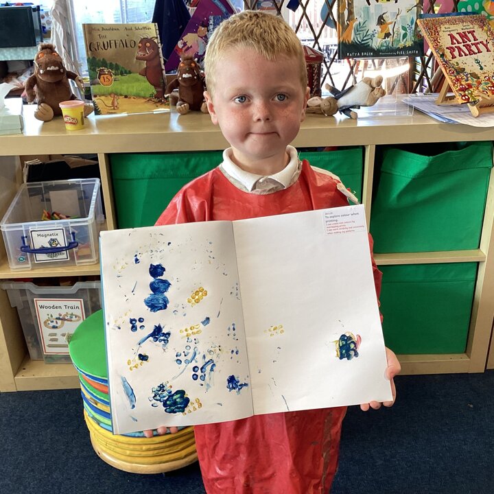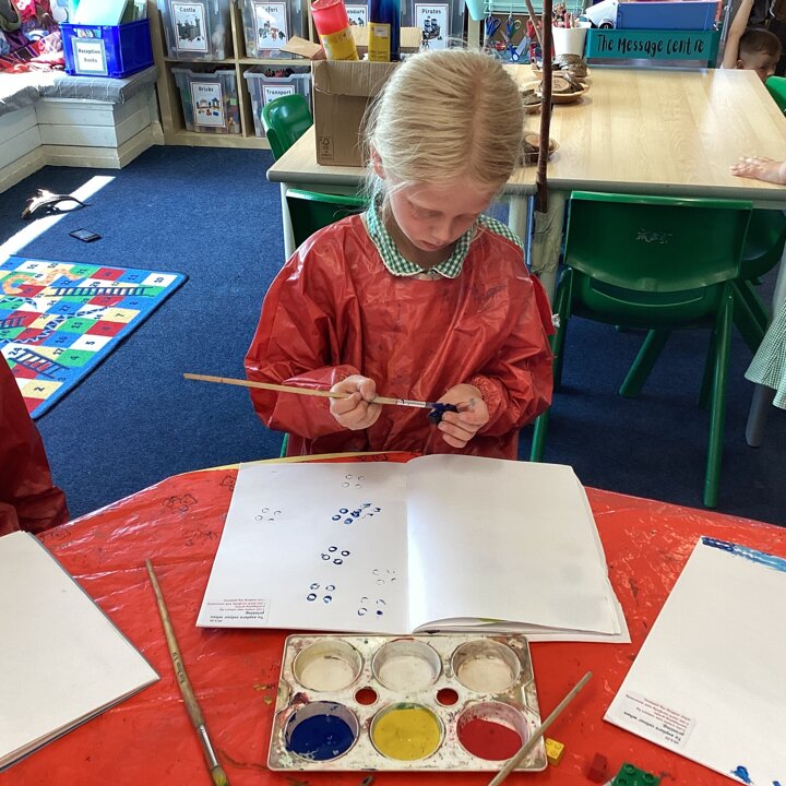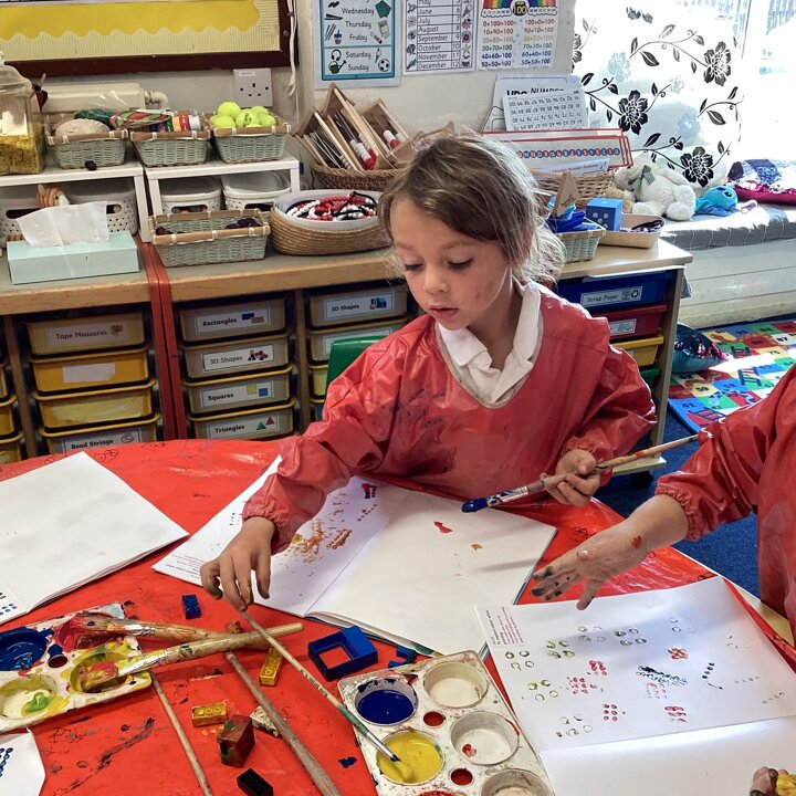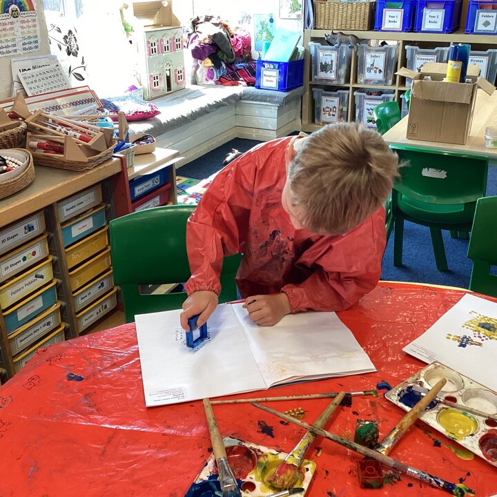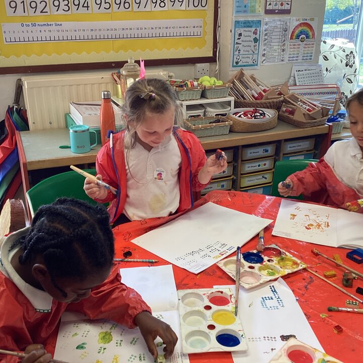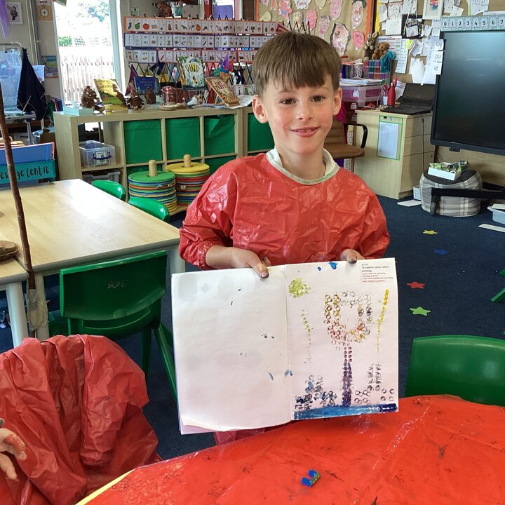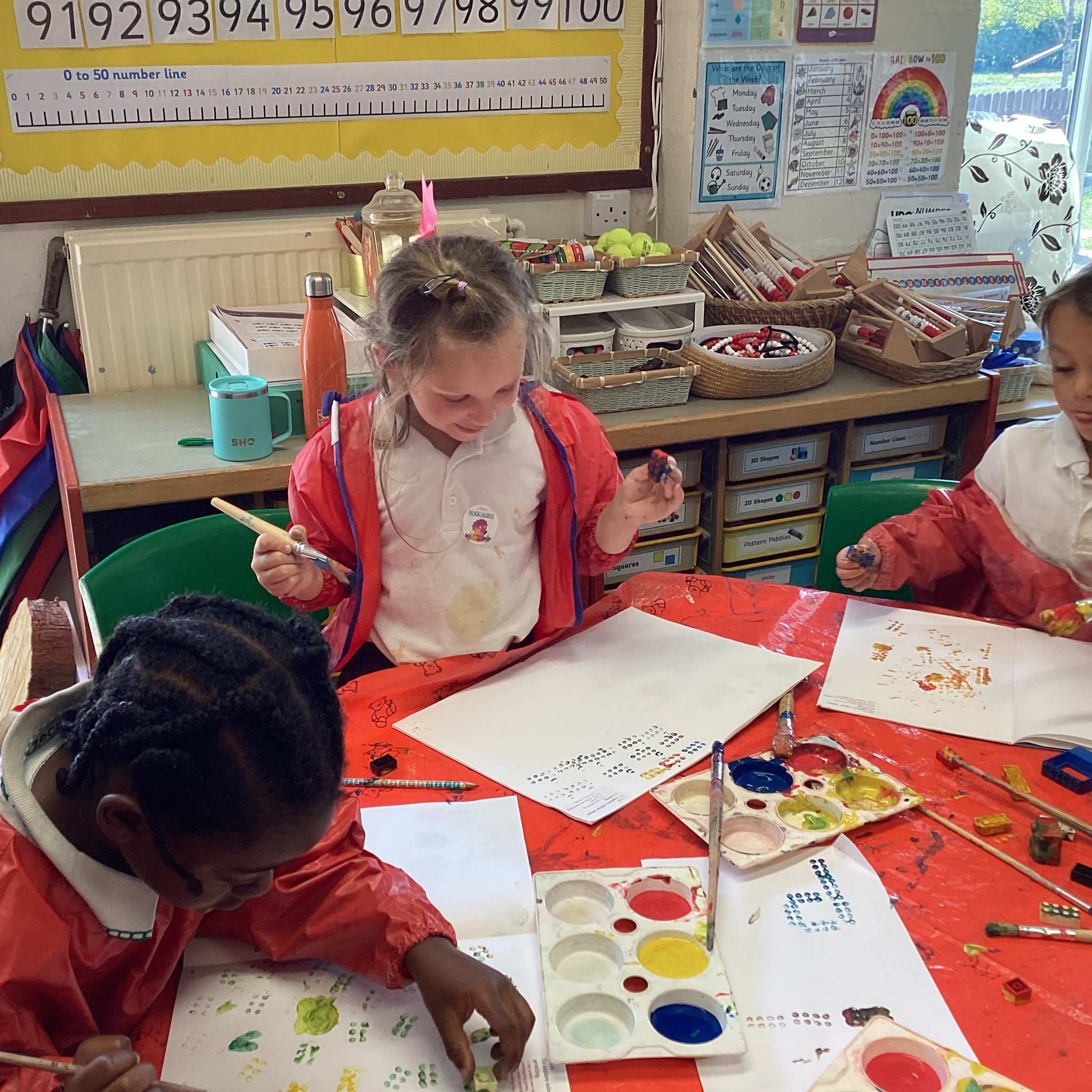 Using Lego bricks to create prints the children experiments creating patterns, combining colours and creating pictures. They created the new colours by overlapping prints and aimed to work carefully and accurately to create their prints.