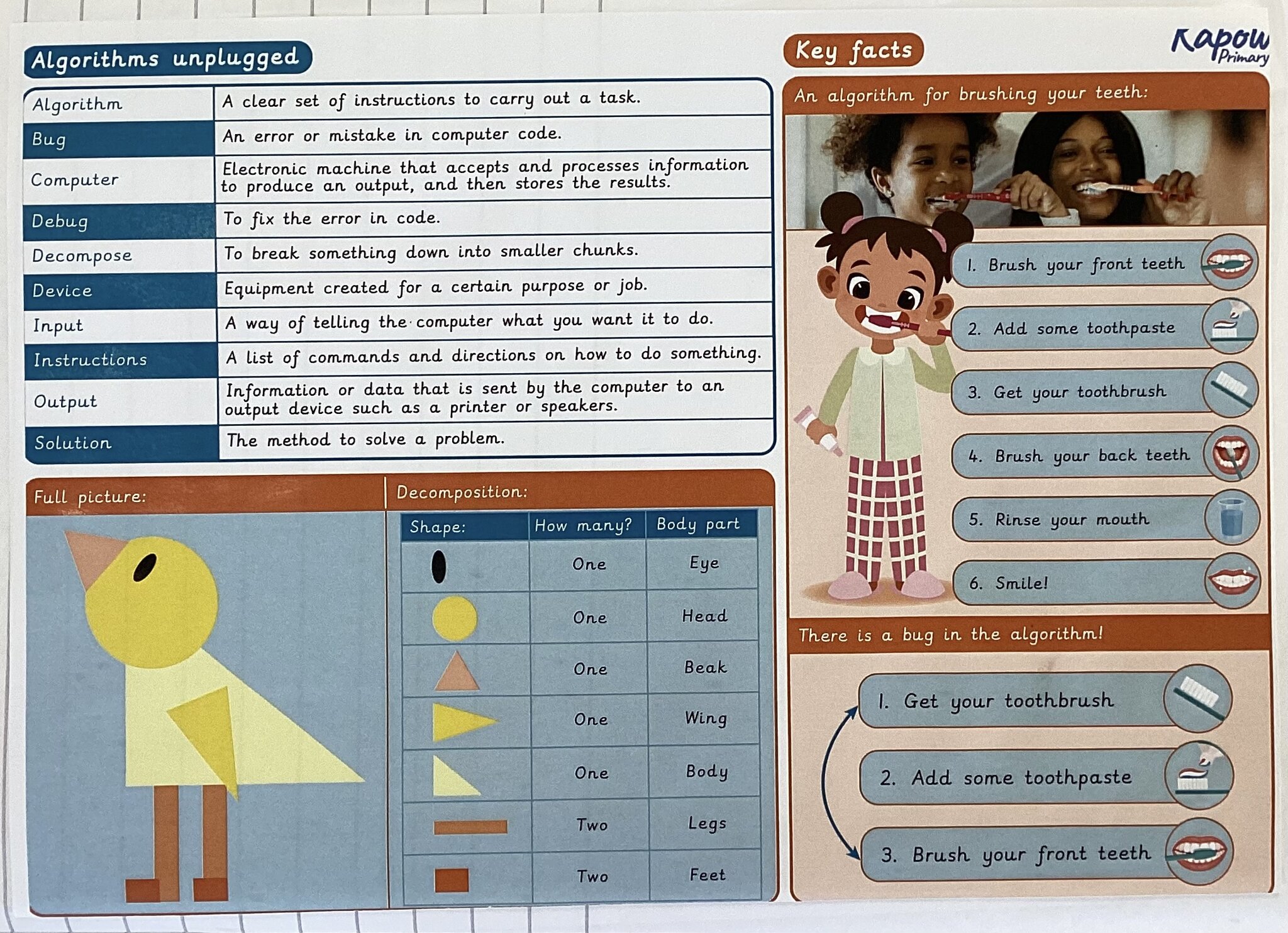 They learnt that an algorithm is a set of clear and precise instructions. Instructions should be followed in the correct order. The children learnt that if they told their partner to put the shoes onto their doll then the socks that they’d created a bug in the algorithm.