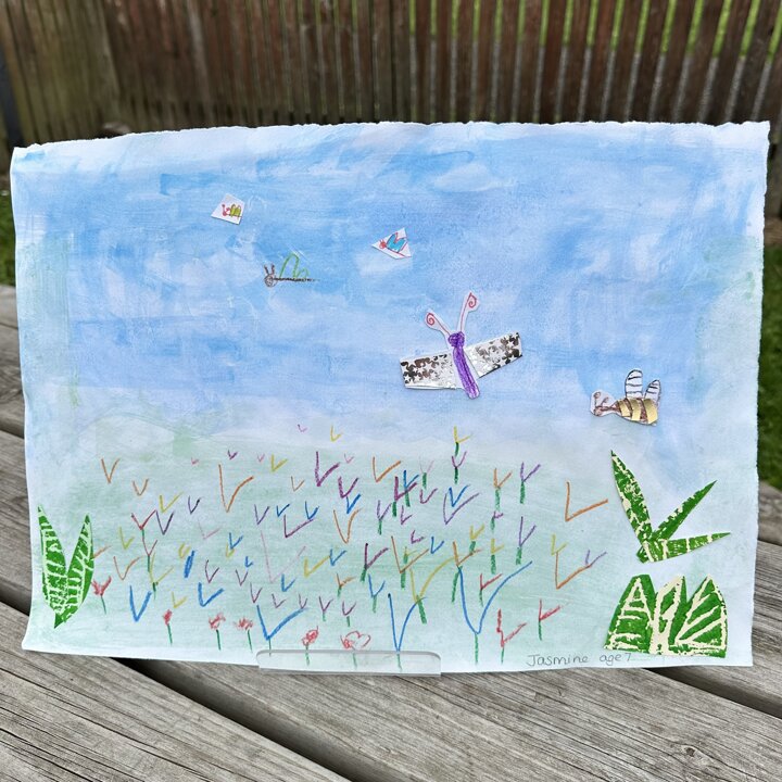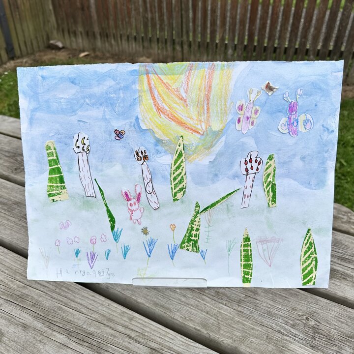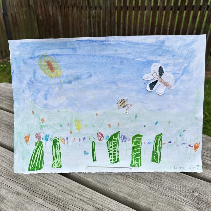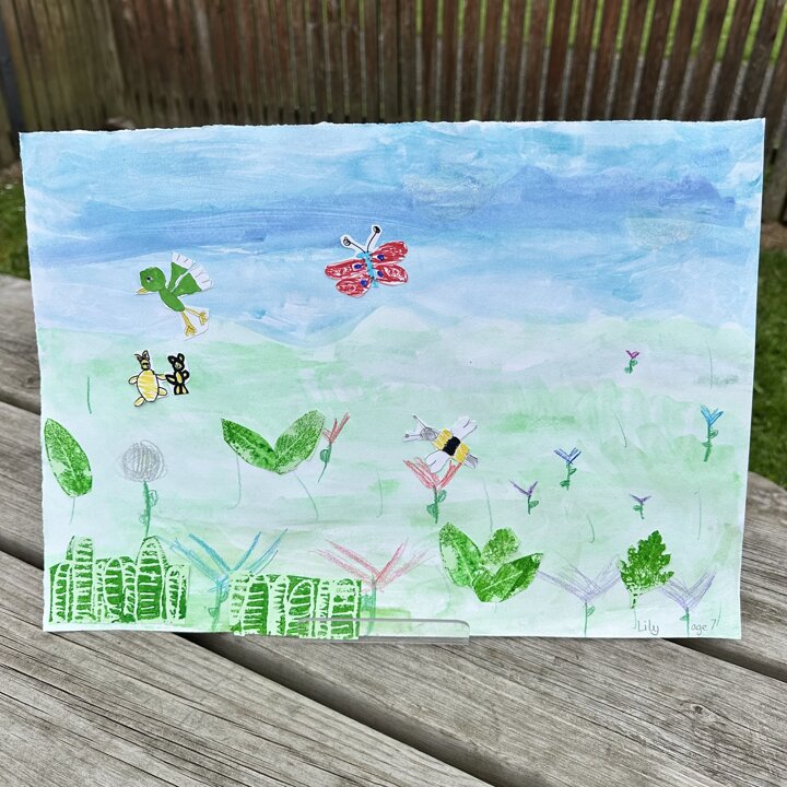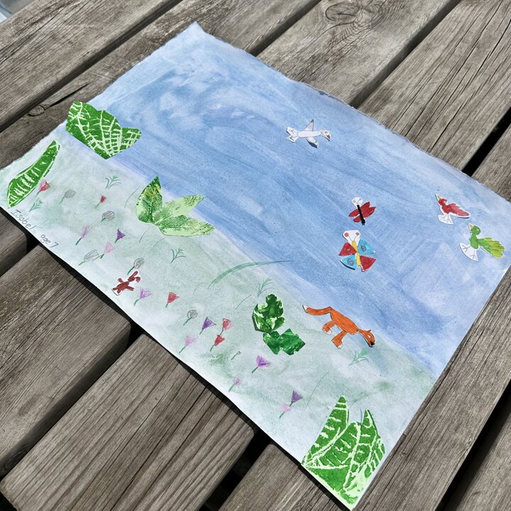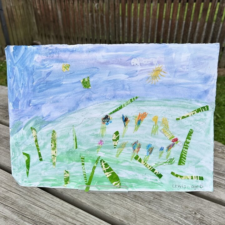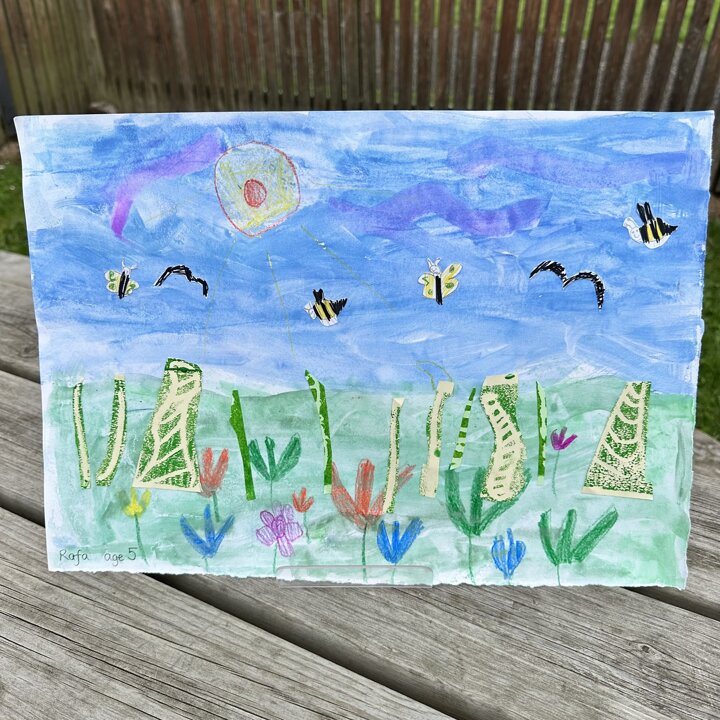 We have been busy drawing, printing and painting to create a collage of a scene from a summer meadow to enter into an art competition. The competition is open until the 8th September so if you’d like to create another picture at home over the holidays with friends please do, you can find the competition details here John Burningham Website.