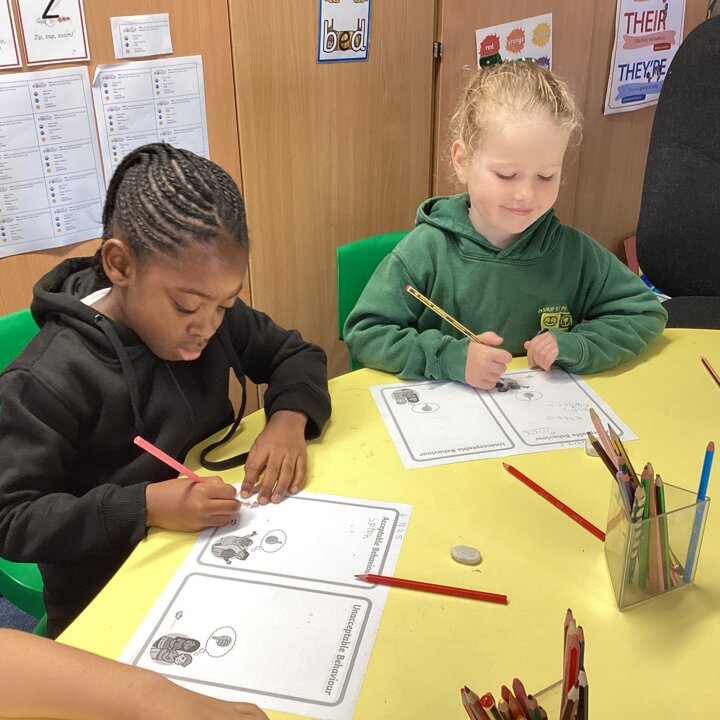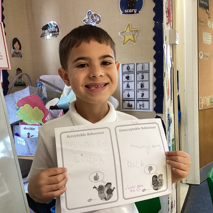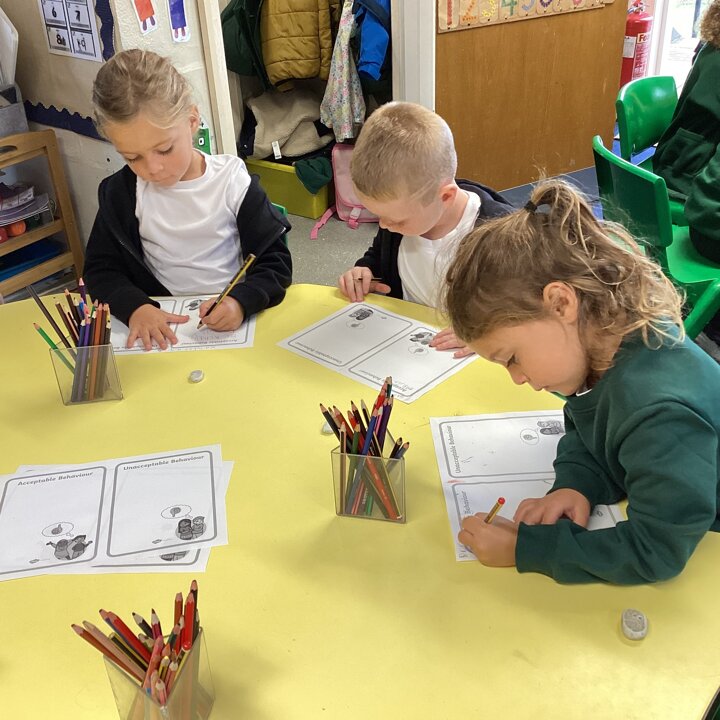 Today we had a good chat and the children decided what we should have as our class rules to make them feel safe and happy in school. We started by deciding which behaviour was acceptable or unacceptable and why. Then they drew and wrote what they thought.