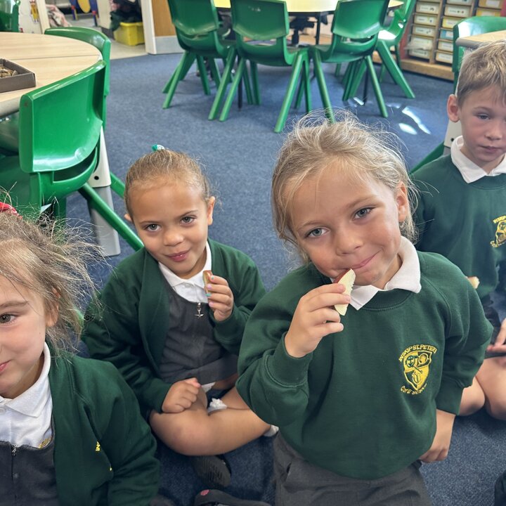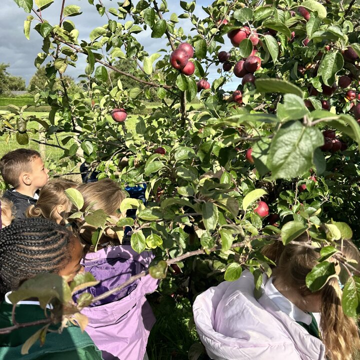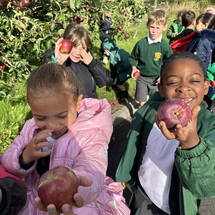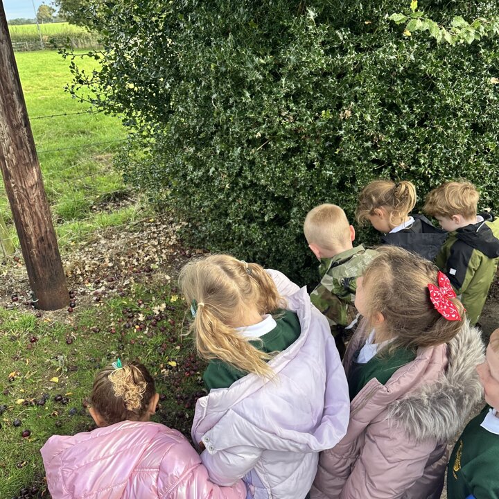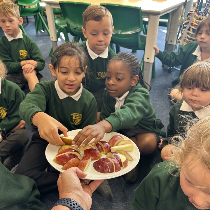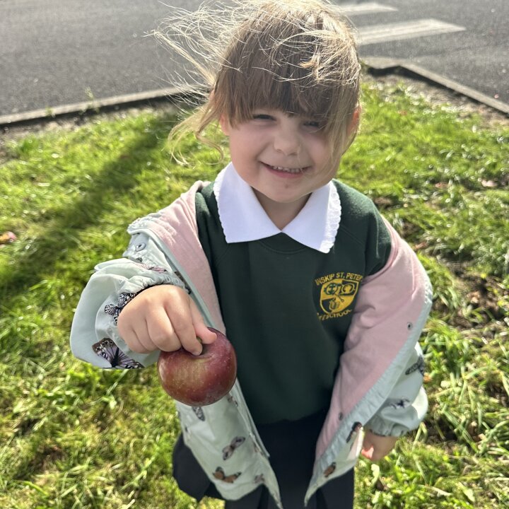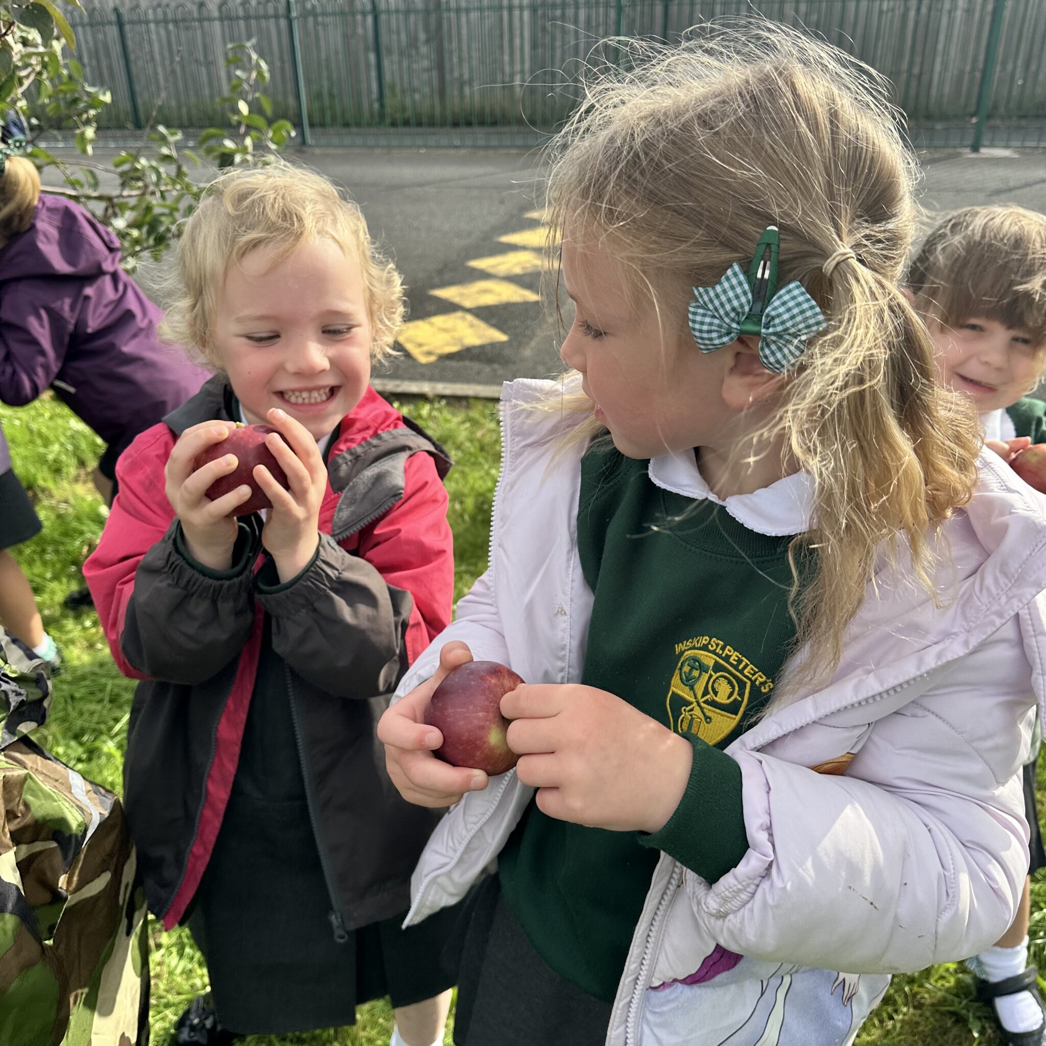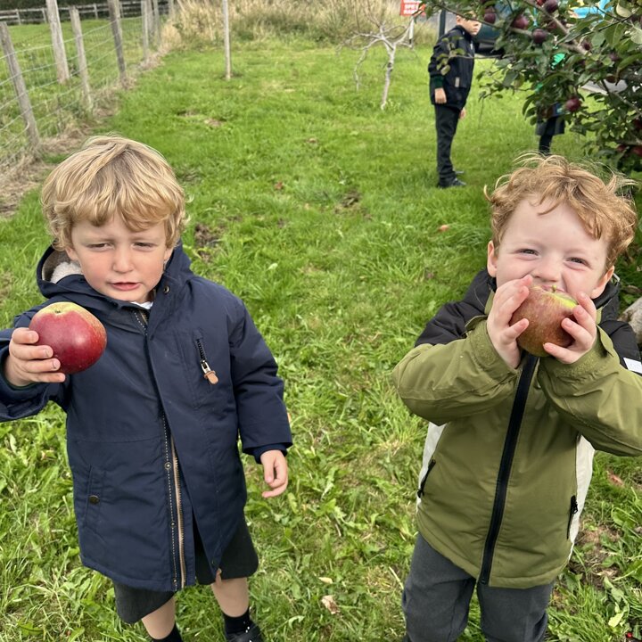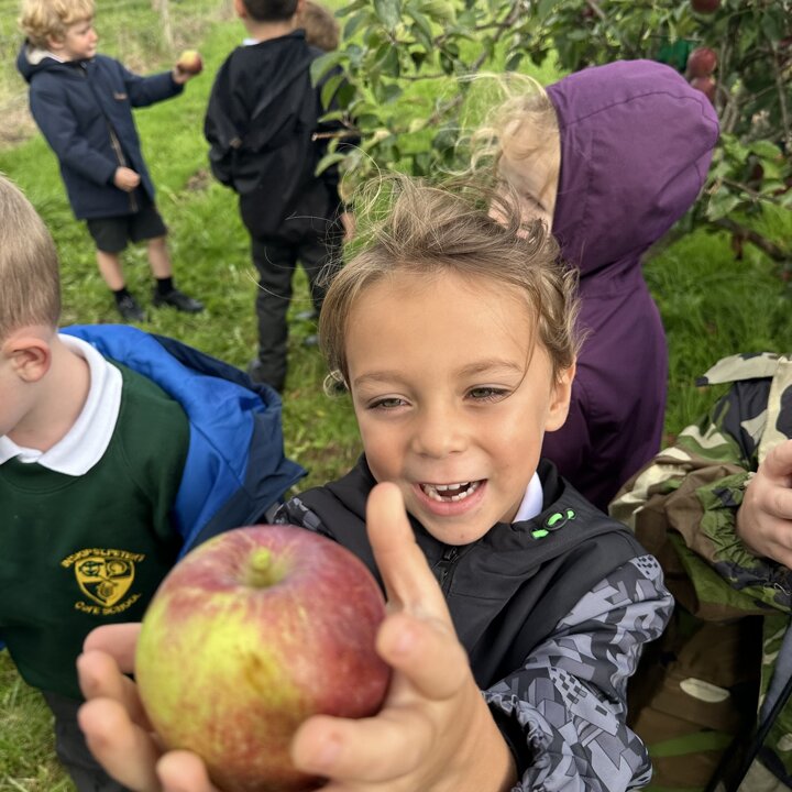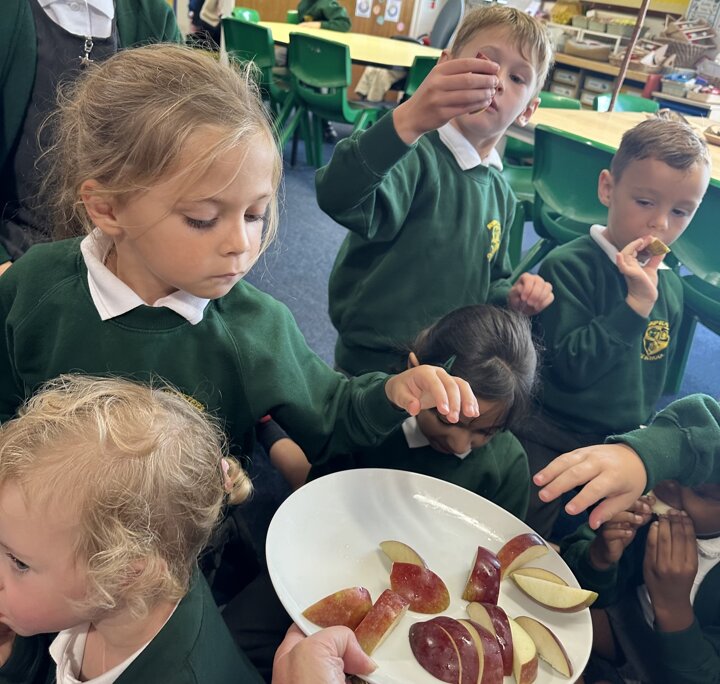 We have been learning about the seasons and the children we able to tell the class a lot about Autumn that they already knew. On our walk we looked for signs of leaves changing colour, seeds ready to fall and fruit ripe and ready to eat. Everyone picked an apple from our tree and had a taste! On Friday Mrs Billington our wonderful school cook is going to stew some of the apples and make an apple pie for the children to taste, yum!