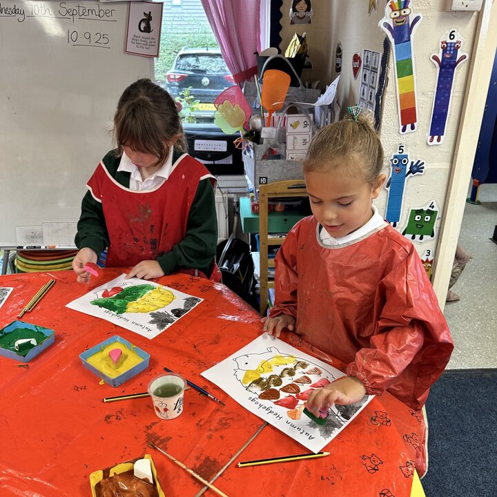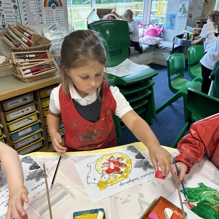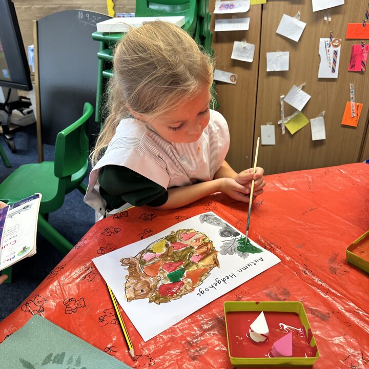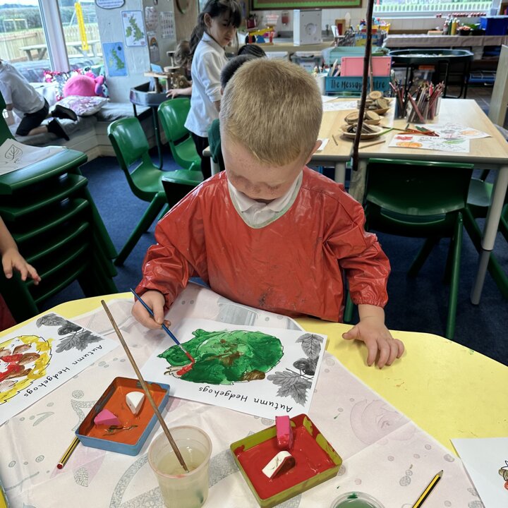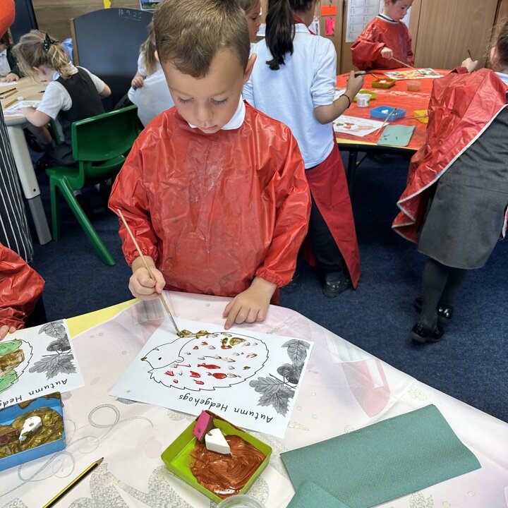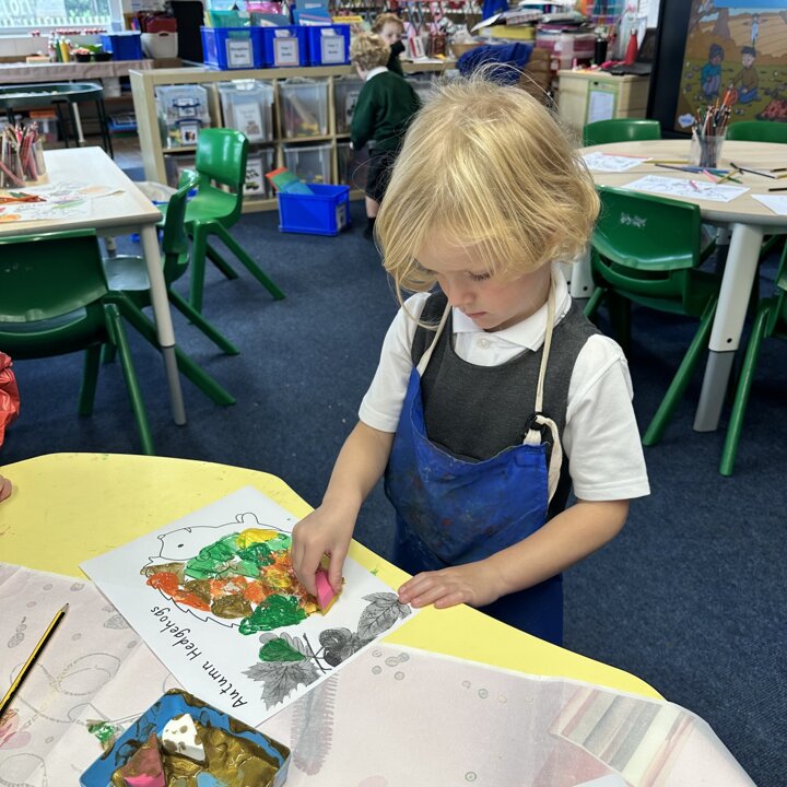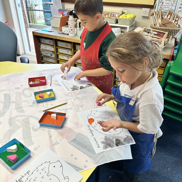 Then using autumn colours the children used sponges to print spines on pictures of hedgehogs to create their own autumn hedgehog picture.