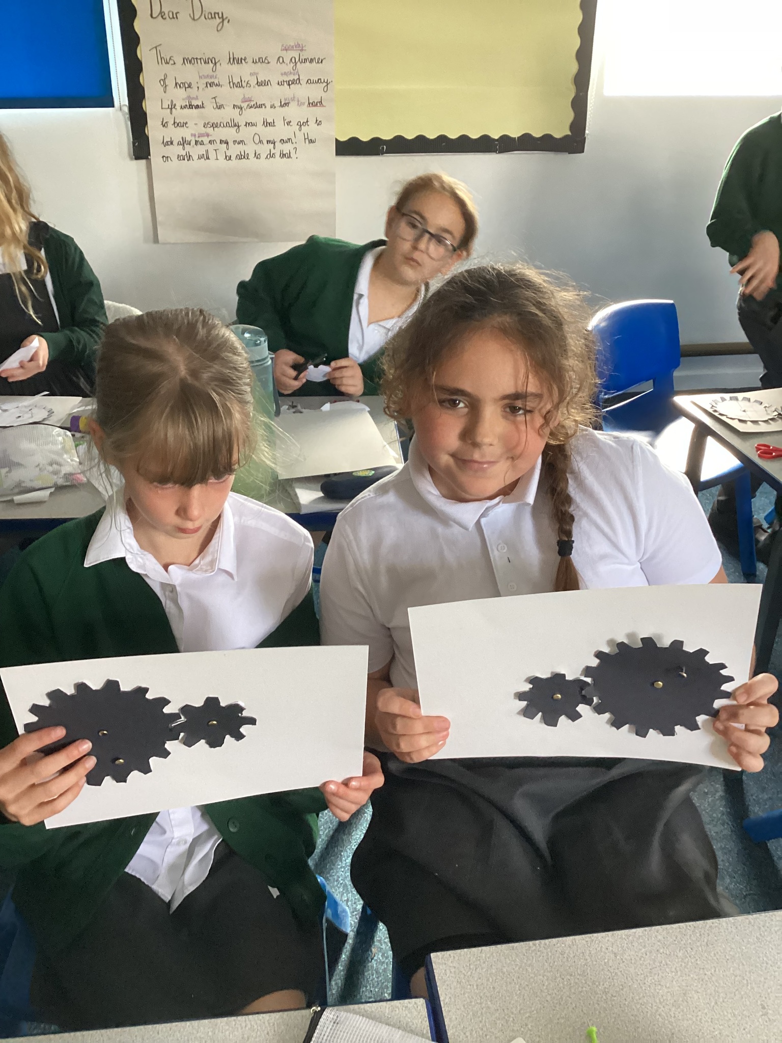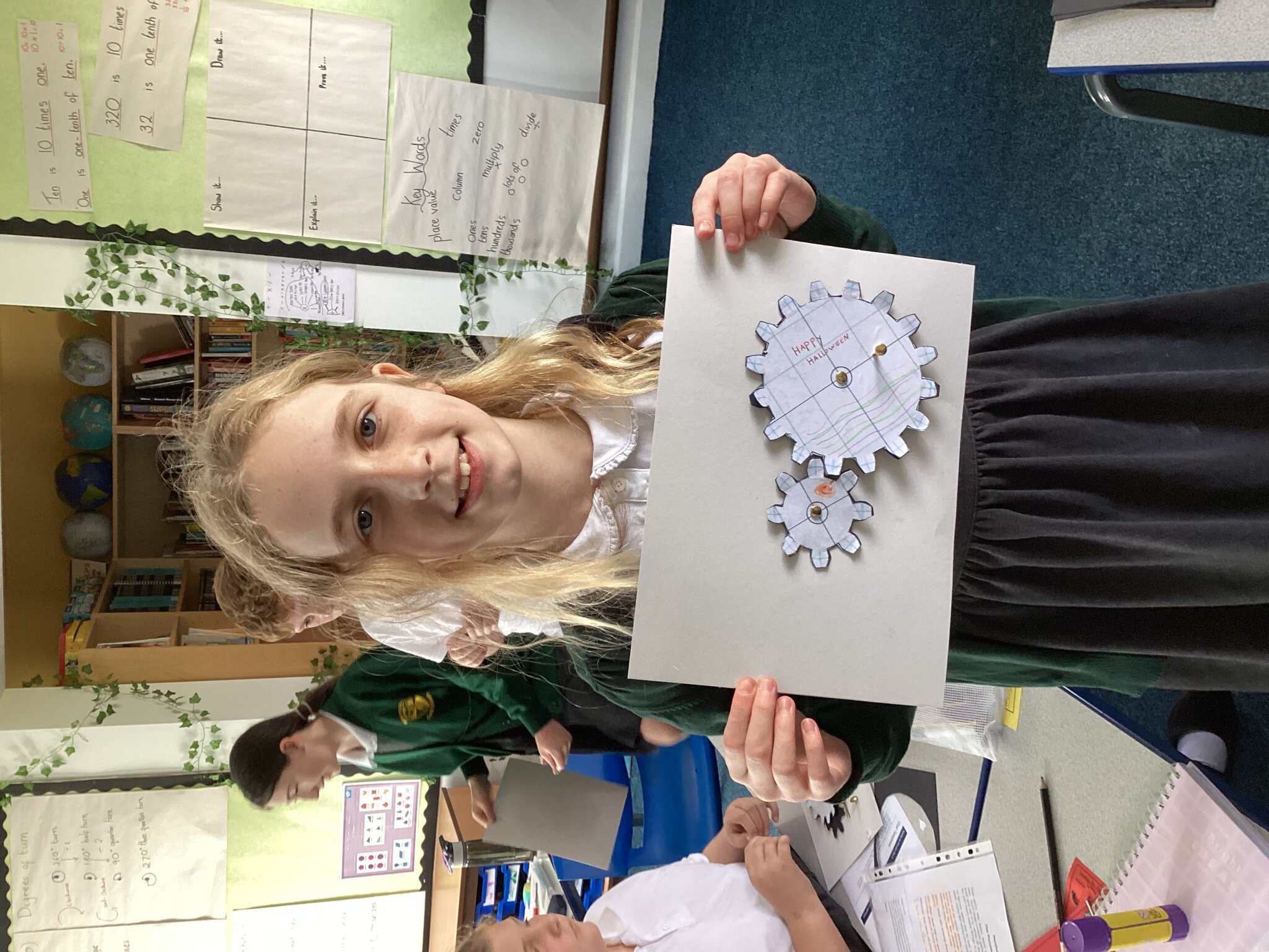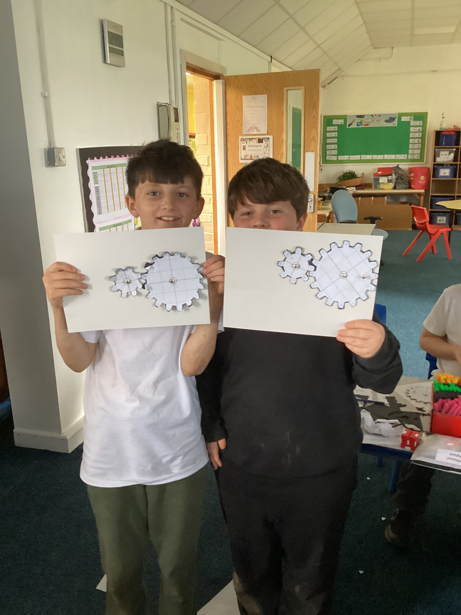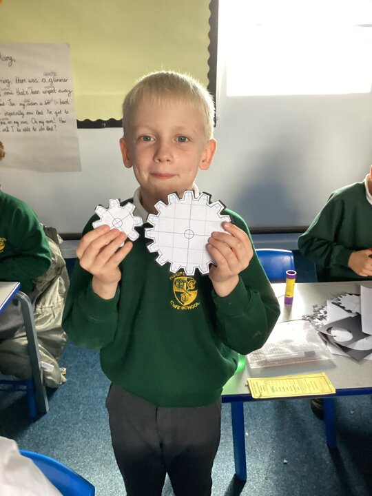 Today the children learnt what a gear system is and how a simple gear system works on a bike or inside a clock. As part of the lesson, the class made their own gears using templates, card, split pins and a lot of hard work! After lots of careful cutting, sticking and placing of the gears in the right position, they were able to demonstrate a 2:1 ratio gear system. Well done Upper School!