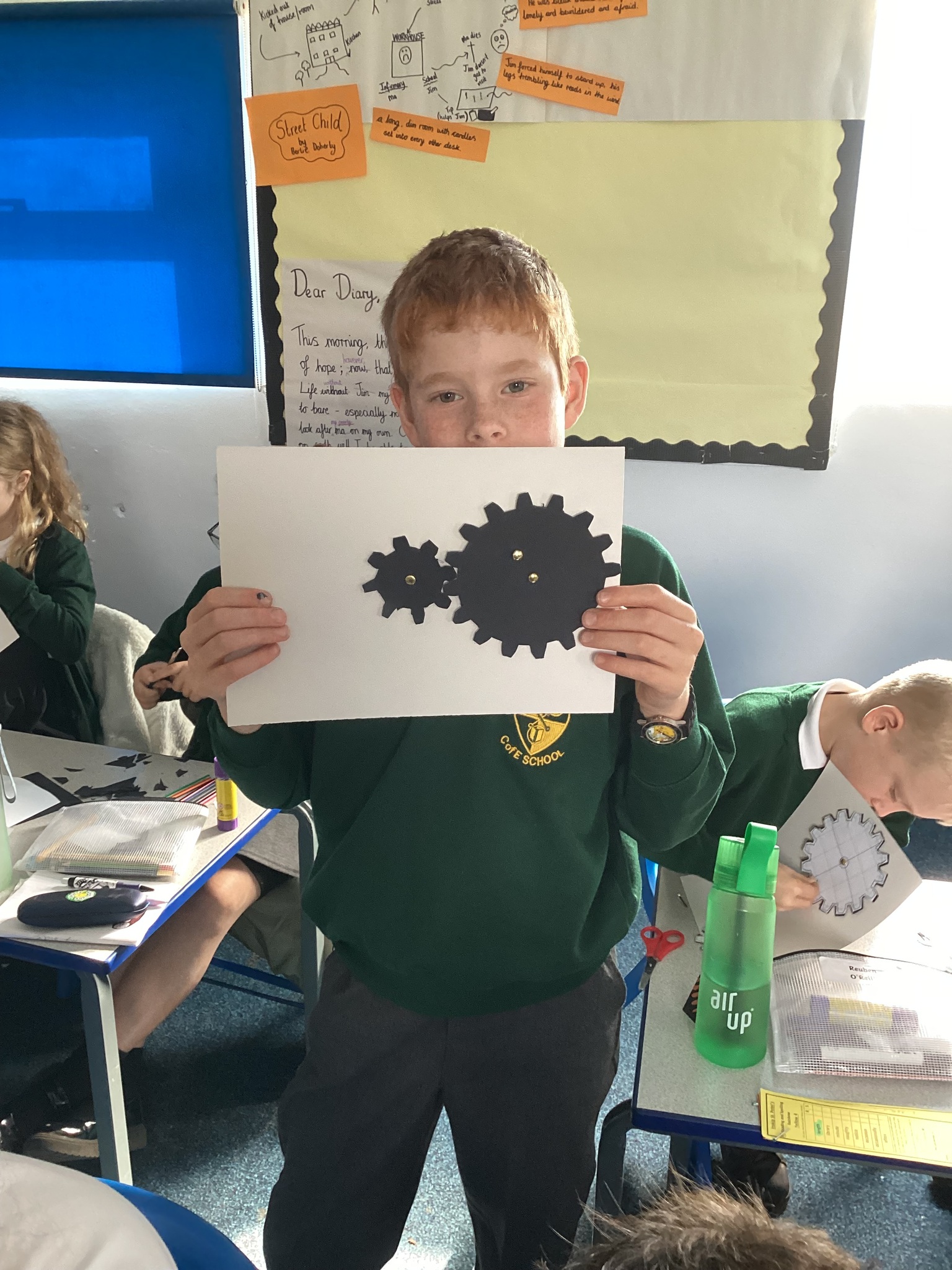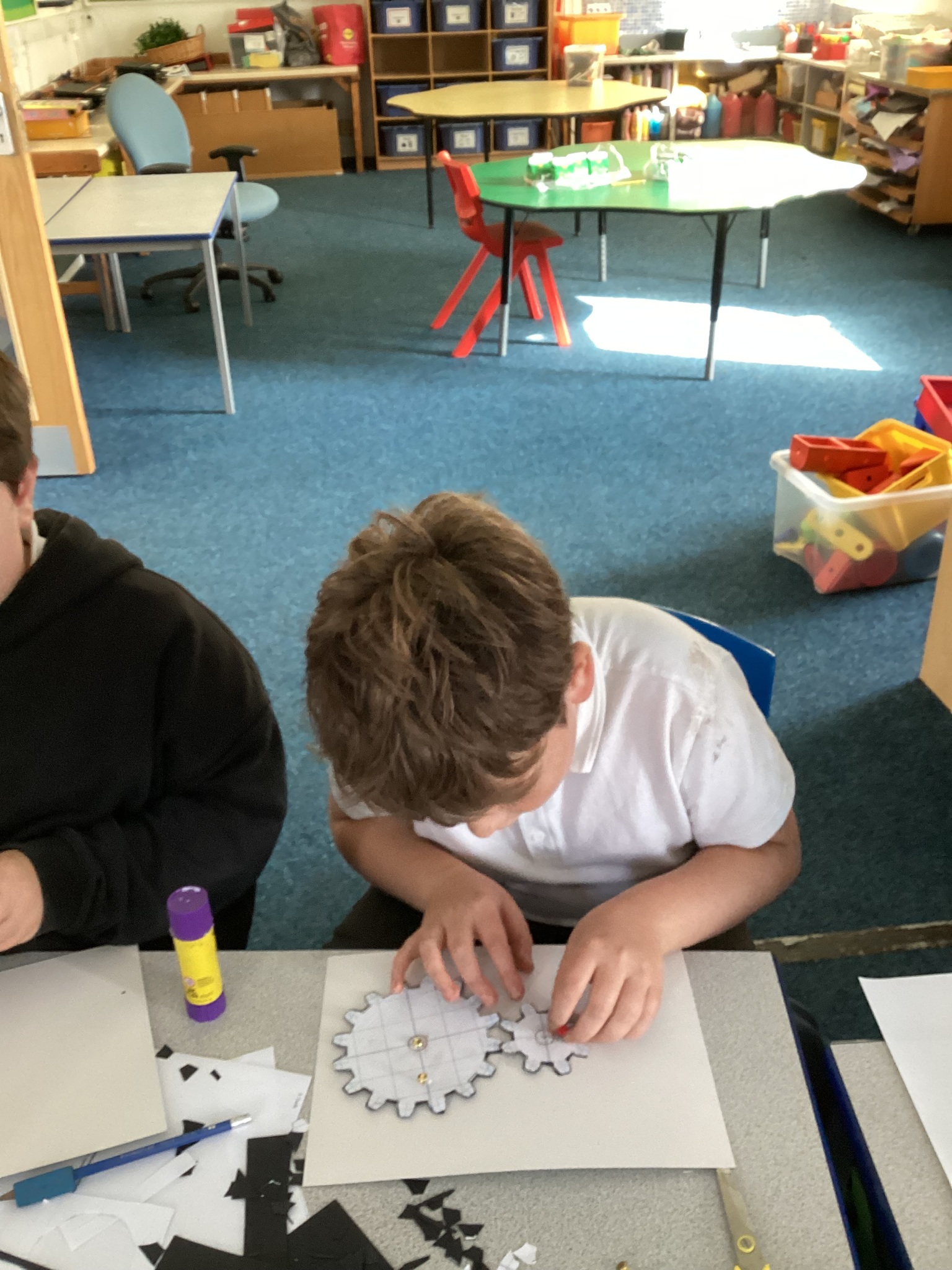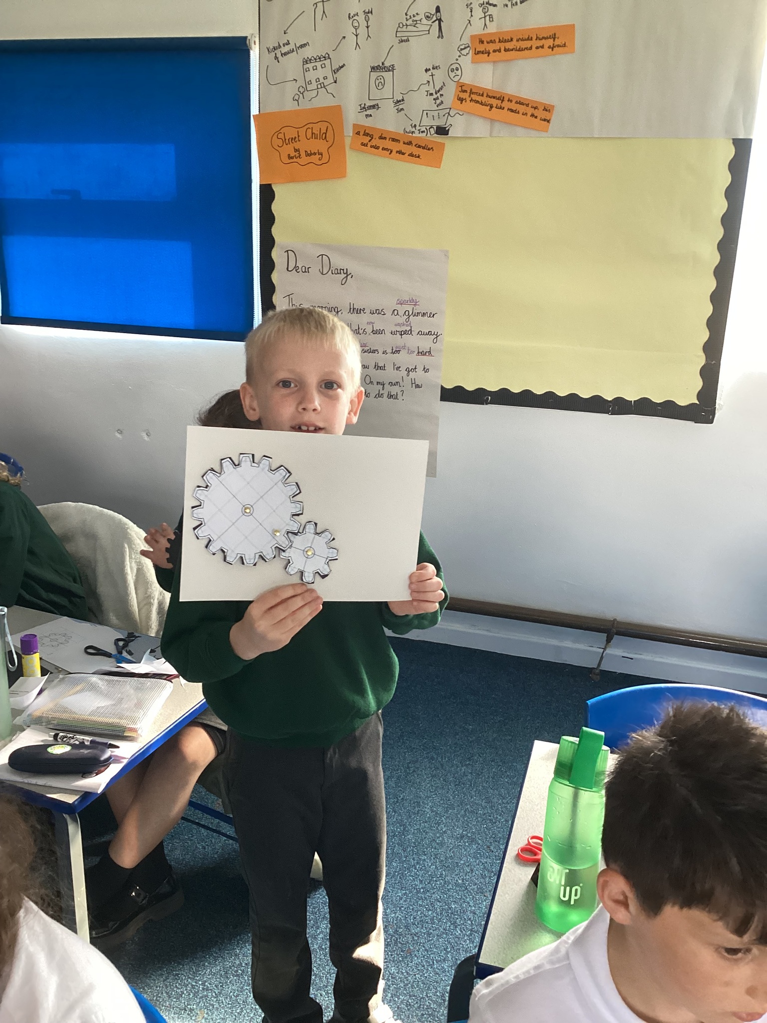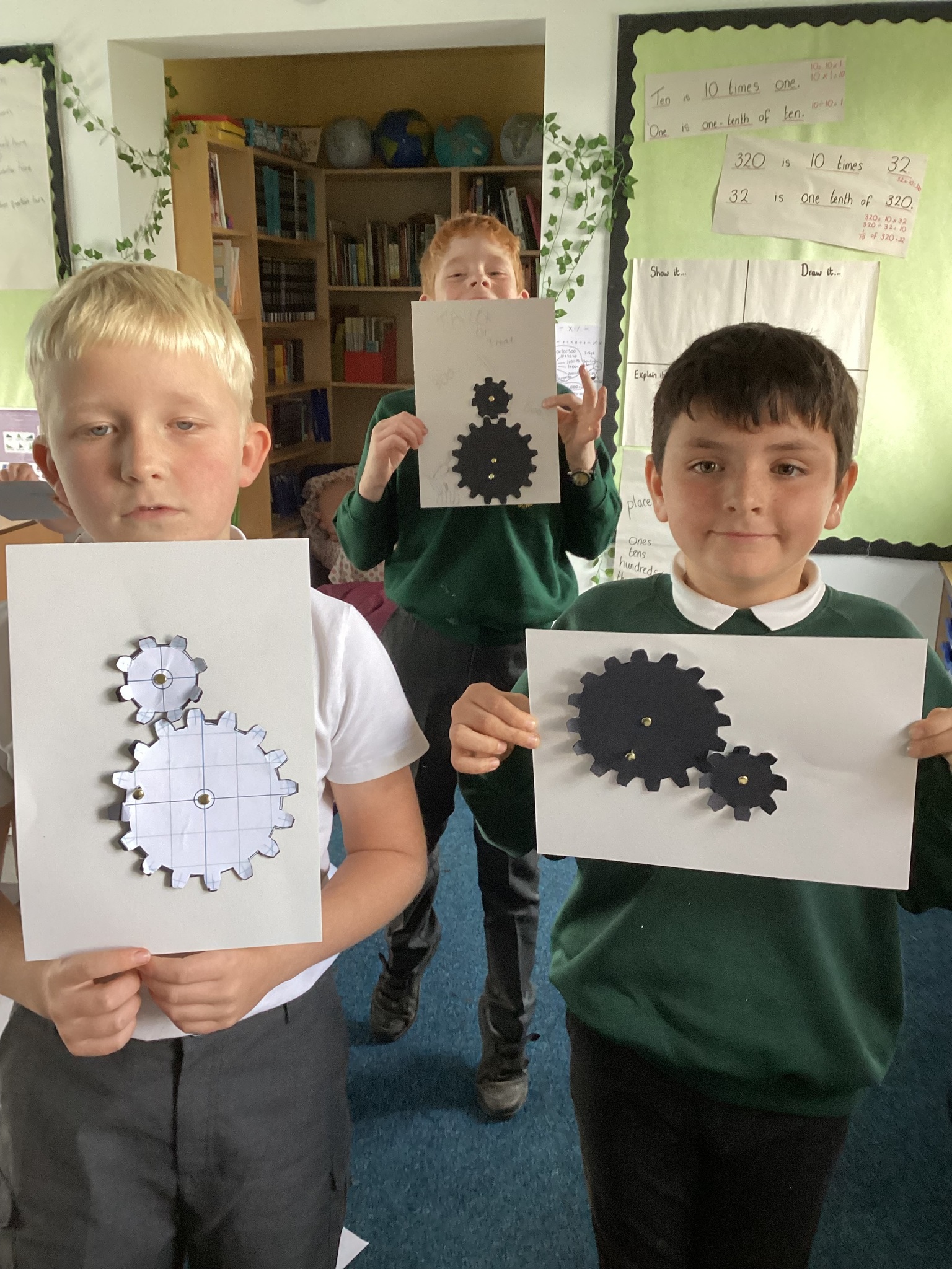 Today the children learnt what a gear system is and how a simple gear system works on a bike or inside a clock. As part of the lesson, the class made their own gears using templates, card, split pins and a lot of hard work! After lots of careful cutting, sticking and placing of the gears in the right position, they were able to demonstrate a 2:1 ratio gear system. Well done Upper School!
