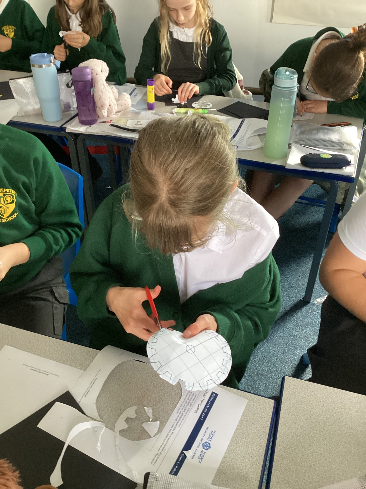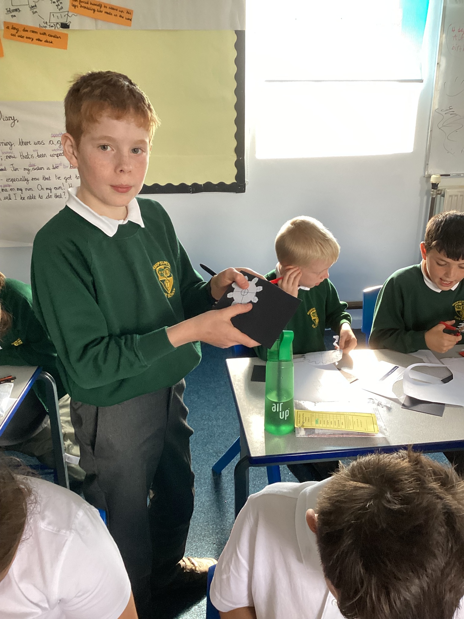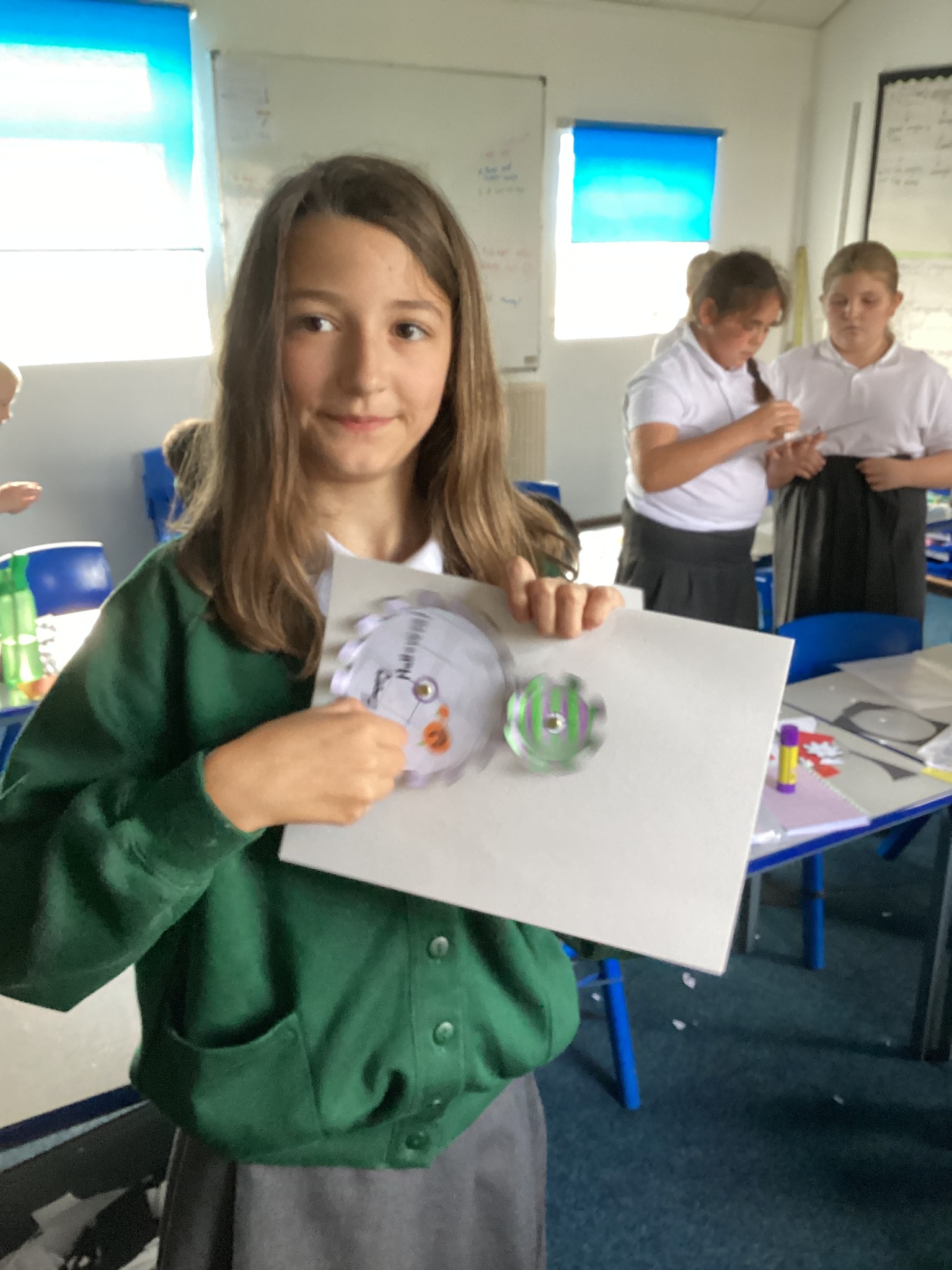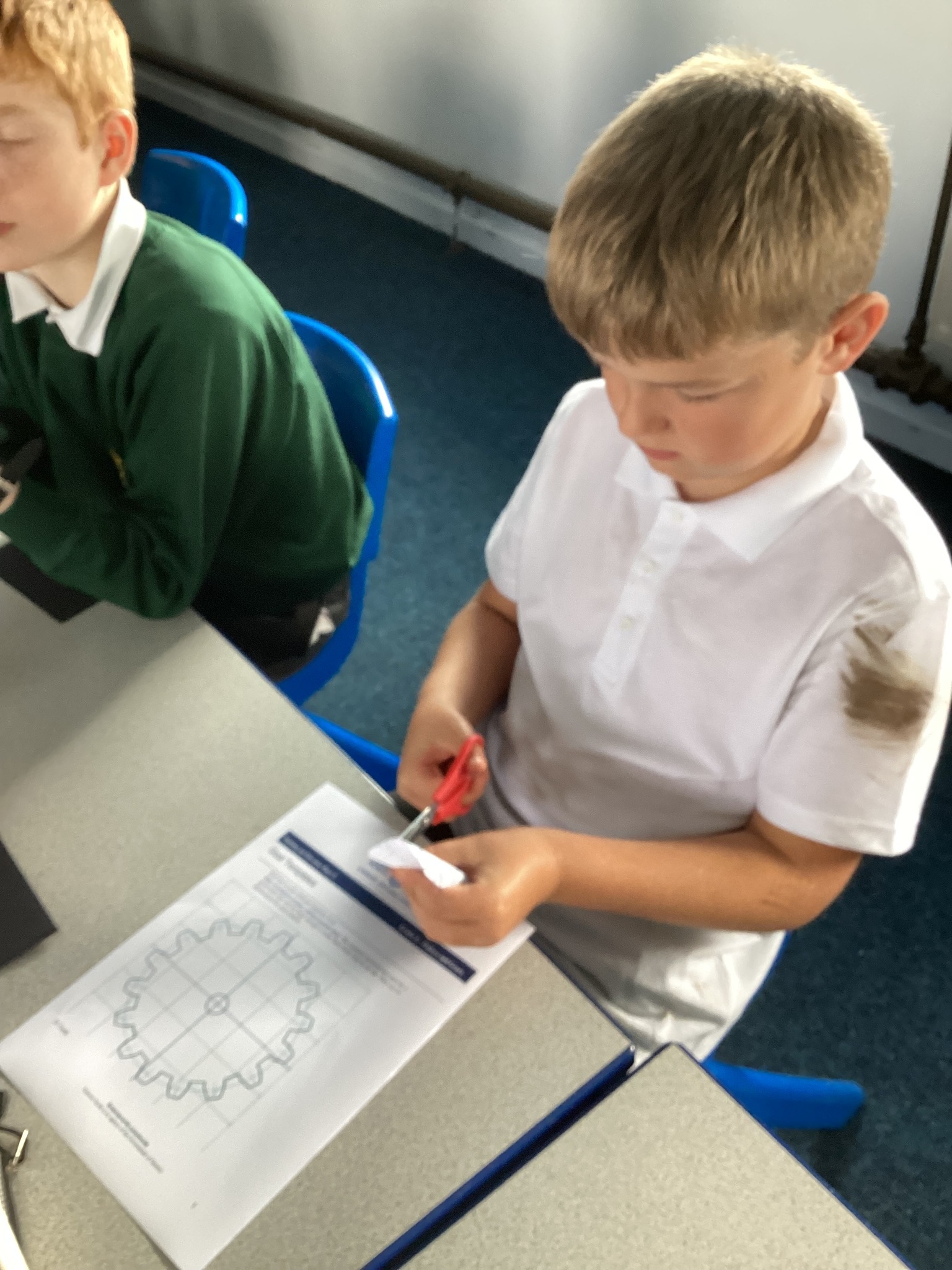 Today the children learnt what a gear system is and how a simple gear system works on a bike or inside a clock. As part of the lesson, the class made their own gears using templates, card, split pins and a lot of hard work! After lots of careful cutting, sticking and placing of the gears in the right position, they were able to demonstrate a 2:1 ratio gear system. Well done Upper School!