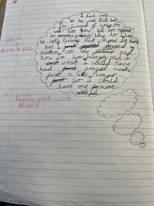 We then used these images and words to create a thought bubble for the main character, Jim. There was lots of exploring the language of the novel and use of thesauruses to write lists of useful adjectives so that what the children came up with was extremely emotional to read! I have added a couple of these pieces of writing to our gallery too. Well done particularly to Lilly and Abigail.