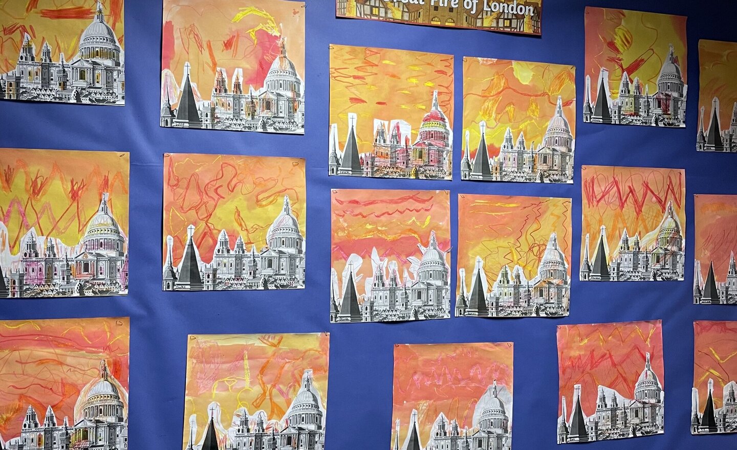 The children applied the skills they learnt previously (creating autumn leaves see here https://inskip.lancs.sch.uk/blog/2022-10-13-14-49-13-painting-autumn-leaves ) to create the background sky using wax resist and watercolour inks to create a picture representing the sky above St Paul’s…