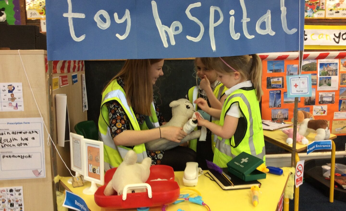 It was lovely to watch Lillian and Emily nurse the toy lamb in the toy hospital with Miss Haynes two weeks ago. Emily decided she needed some special green medicine for the lamb's leg so she went over to the creative area took a piece of yellow material and blue paper pretended to mix them…