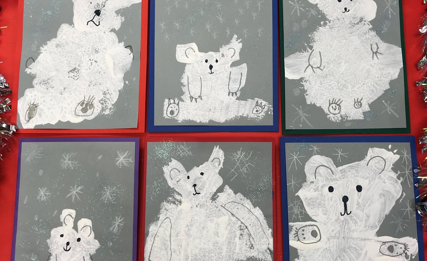 We looked at many beautiful picture books and learnt about polar bears which led us to print some snow bears of our own. They turned out so well that we made them into Christmas cards!