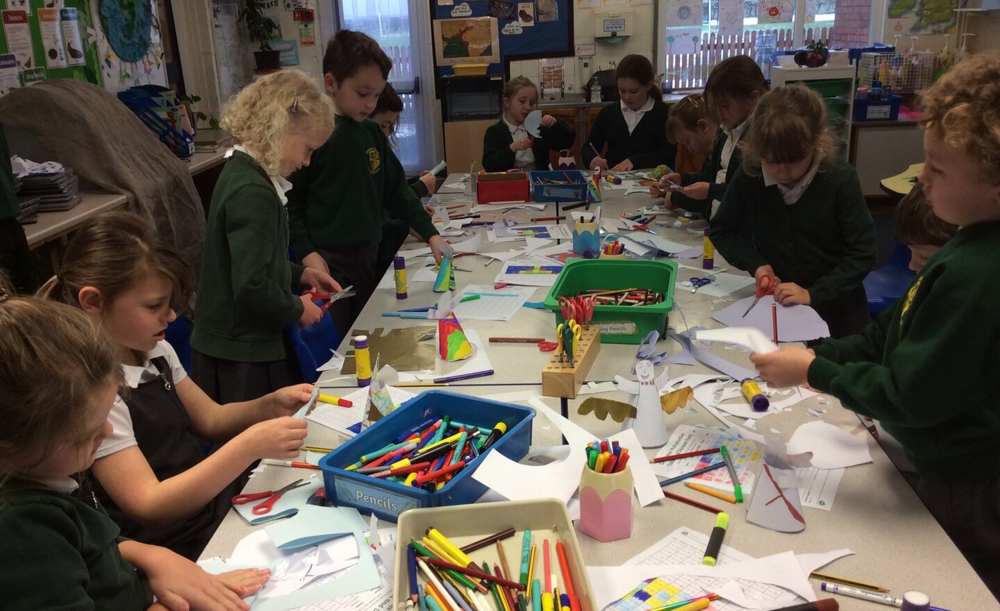Children all sat on one big table to colour, cut and create. We made a huge paper chain…