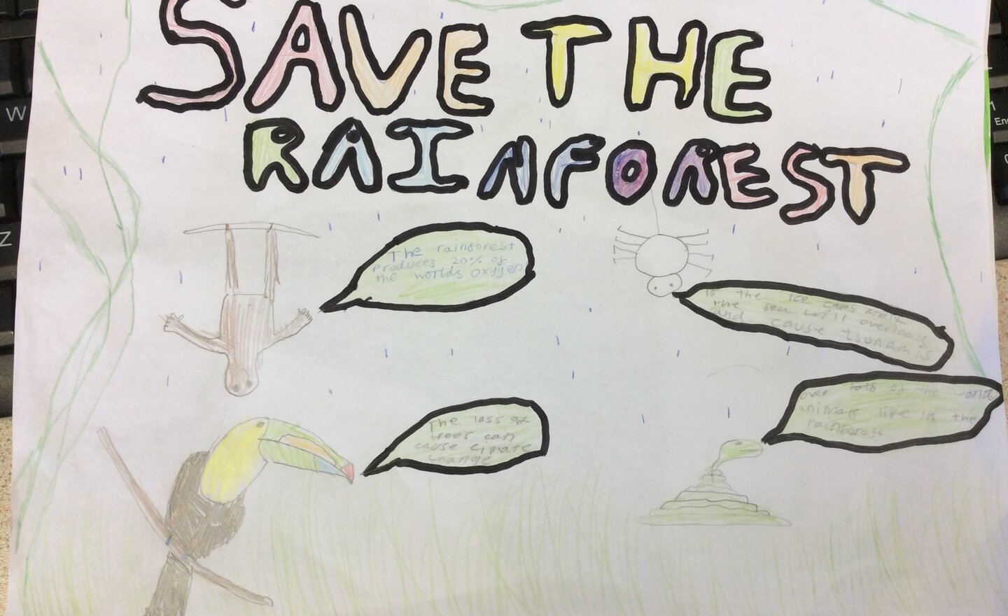 To round up our topic on the rainforest, middle school have combined their knowledge of facts about the rainforest with some advice on saving the rainforest from it's current deforestation and habitat loss issues to create a poster.