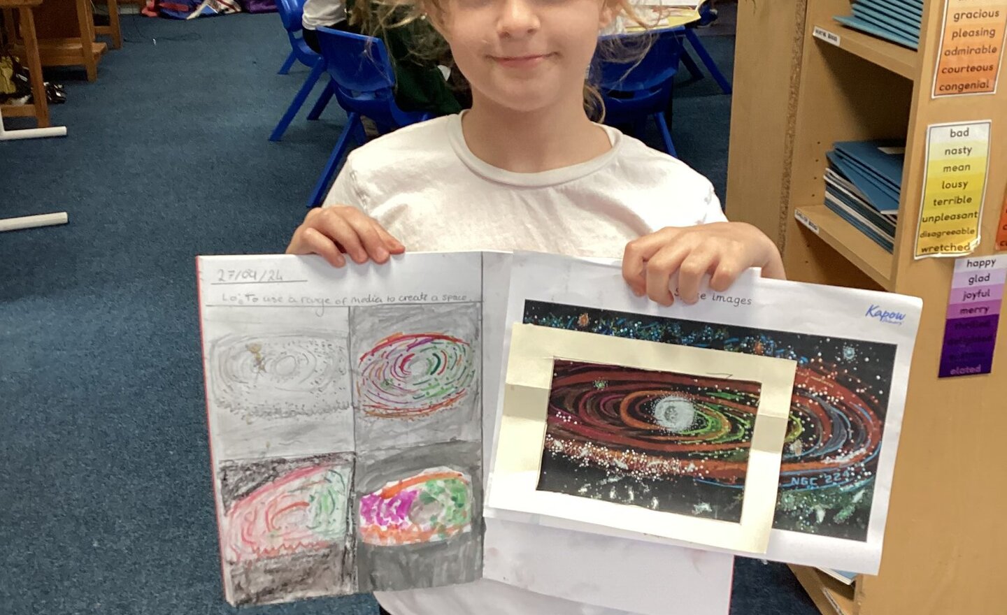 The Upper School children have been using a range of materials to create some space images in their sketch books. These have included, pastels, pencils, colouring pencils, chalks, felt tips, paper and water colours. The class have really enjoyed using a viewfinder to help them observe carefully…