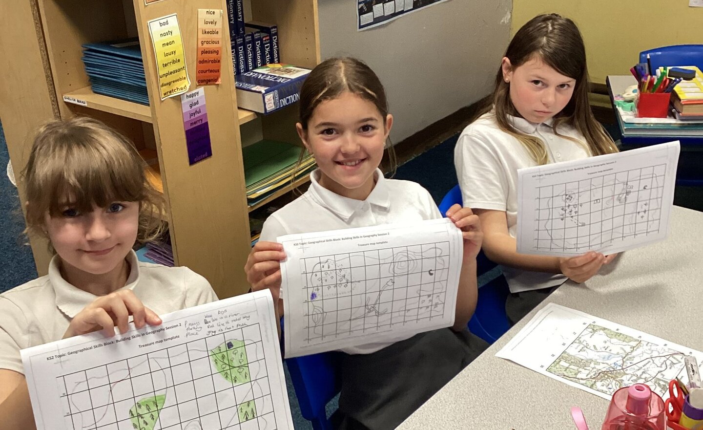 In Geography this week, the class learnt more about using maps to navigate. They practised using grid references to find symbols on maps and then began to learn to use a compass to travel. I gave the children a treasure hunt challenge in the playground where they had to follow compass directions…