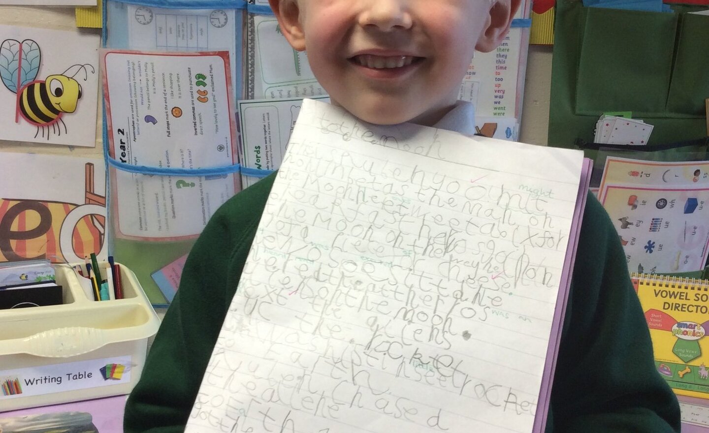 I was greeted just now by a very proud Isaac who wanted to show me his super story writing. He's thought up and used some great ideas and told the whole story. Mrs Kemp and I are very proud of you Isaac!