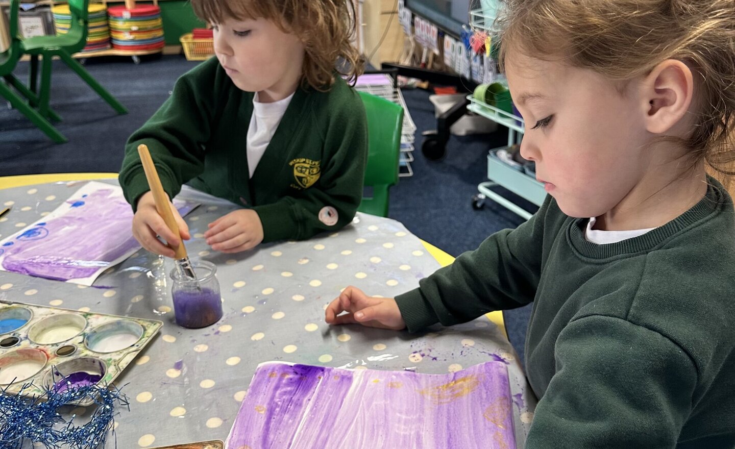 We have been learning lots of art skills by painting and printing. In preparation for making Christmas tree collages the children firstly learnt how to create a ‘wash’ using paint, painting over wax drawings of snowflakes to create a background winter scene.