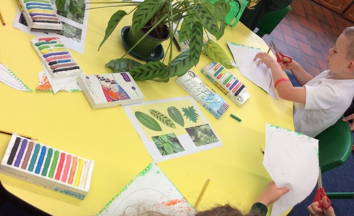 Lower School’s creation of leaves and flowers to hide their tiger’s faces in the creation of their tiger collage.