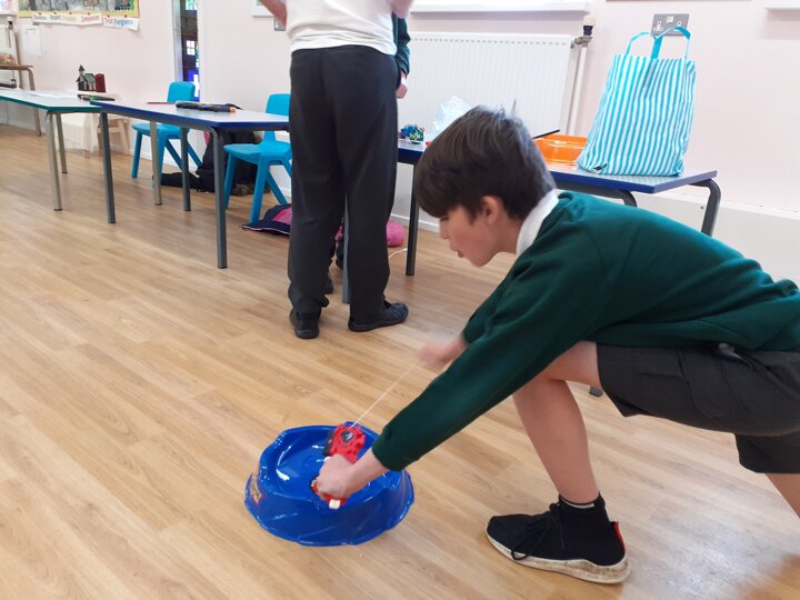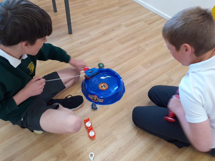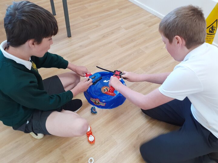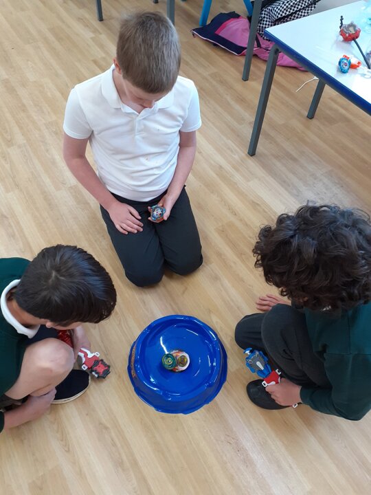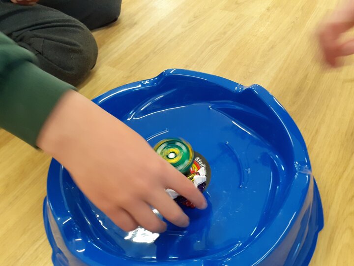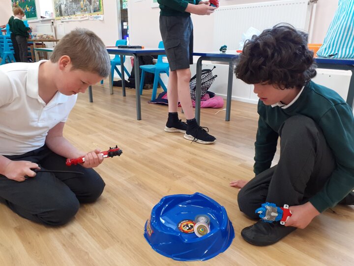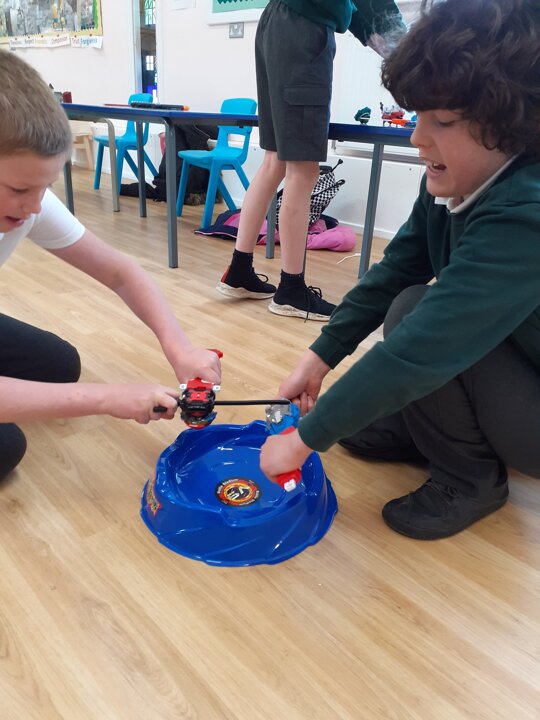 Ted, Reggie, Isaac, Iain and I do Thursday club and we Beyblade! This is a game where we do battles with our beys (spinners). We use launchers to launch our beys into the arena.